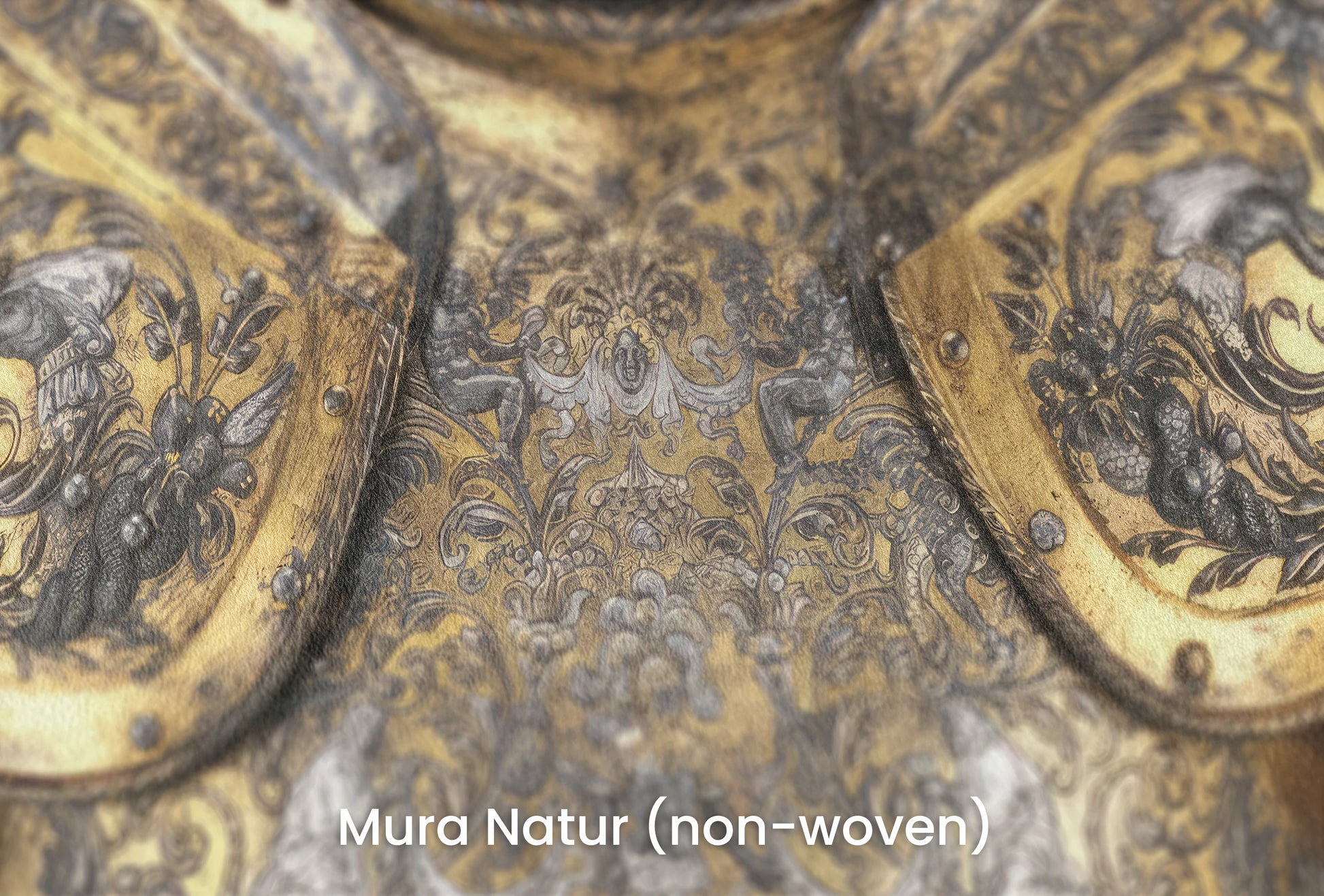 Details in goldenem Glanz : Die Fototapete gibt die reich verzierten Oberflächen von Rüstungen originalgetreu wieder, die mit dichten Schriftrollen, menschlichen Figuren und fantastischen Kreaturen bedeckt sind. Die Komplexität der Dekoration mit Motiven wie Apollo, dem römischen Krieger und dem Mond schafft ein beeindruckendes und reichhaltiges Muster, perfekt für Liebhaber der Renaissancekunst.