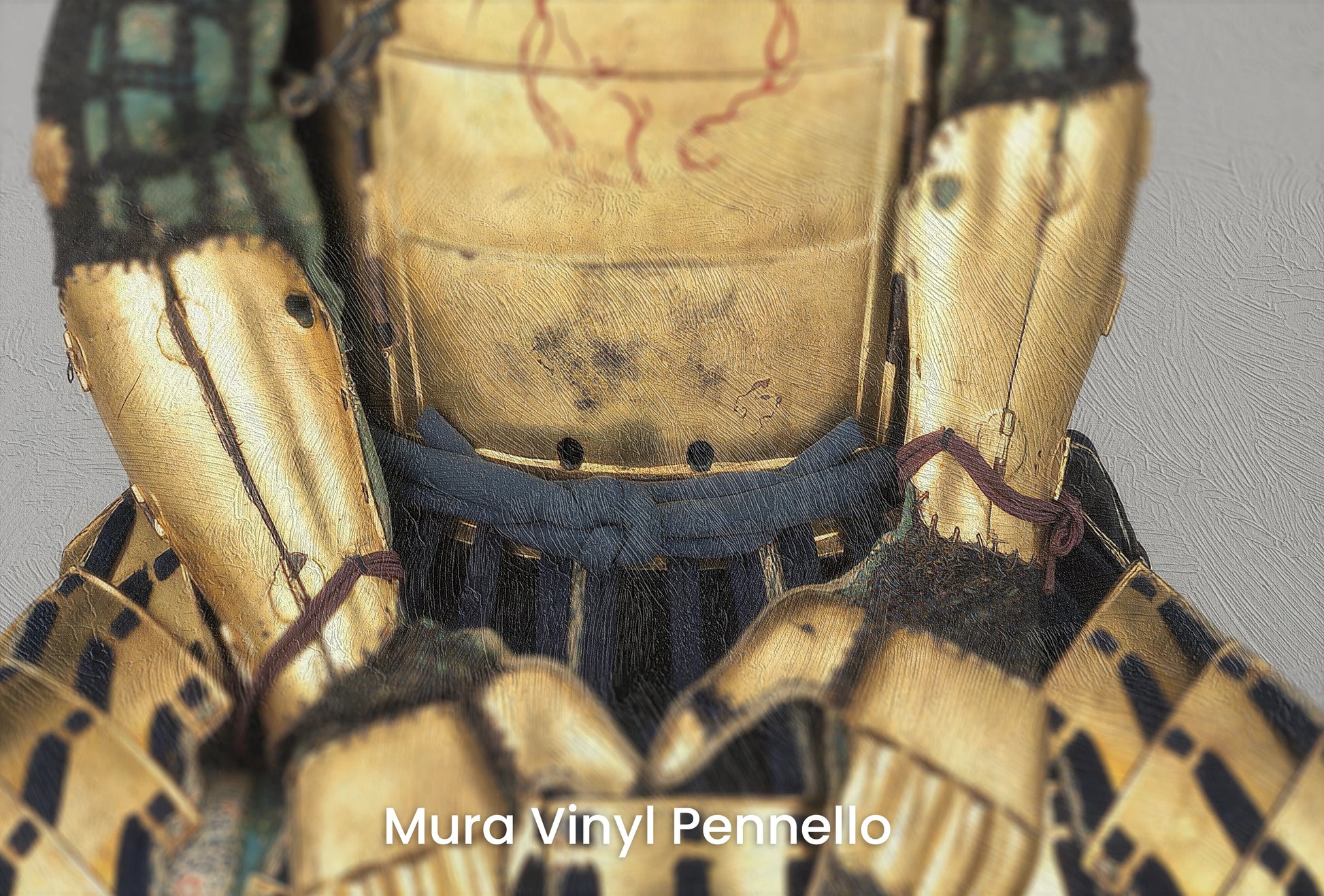 Dieses Wandbild zeigt eine japanische Gusoku-Rüstung aus dem 18. Jahrhundert, die sich durch große Eisenplatten, Lack, Seide und vergoldetes Kupfer auszeichnet. Sie ist ein Beispiel für den europäischen Einfluss und die Einführung von Feuerwaffen, die eine solide, kugelsichere Rüstung erforderten. Die Details dieser Rüstung, wie die exquisite Verzierung und die verwendeten Materialien, verleihen jedem Interieur historische Eleganz und einzigartigen Stil.