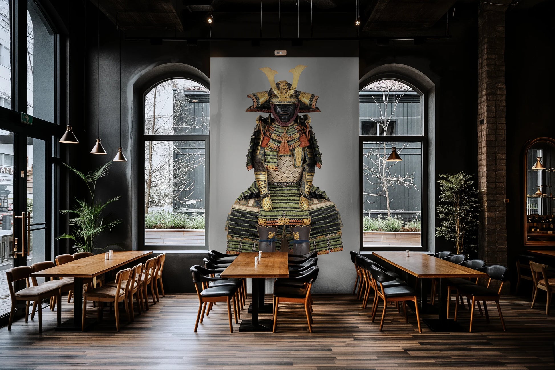 Diese Fototapete zeigt eine japanische Yoroi-Rüstung aus dem 18. Jahrhundert, die sich durch eine Rückbesinnung auf mittelalterliche japanische Stile auszeichnet. Die aus Eisen, Lack, Leder und Seide gefertigte Rüstung verfügt über einen Helm mit sichtbaren Nieten und einen breiten Nackenschutz. Der Brustpanzer mit großen quadratischen Schulterstücken und ein tiefer, vierflügeliger Rock verleihen ihr ein beeindruckendes Aussehen. Die Rüstung verleiht dem Interieur einen historischen und künstlerischen Charakter.