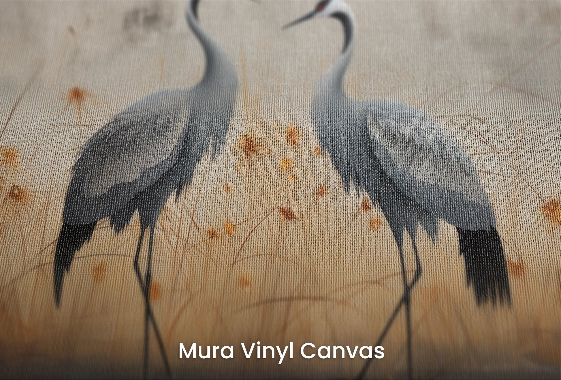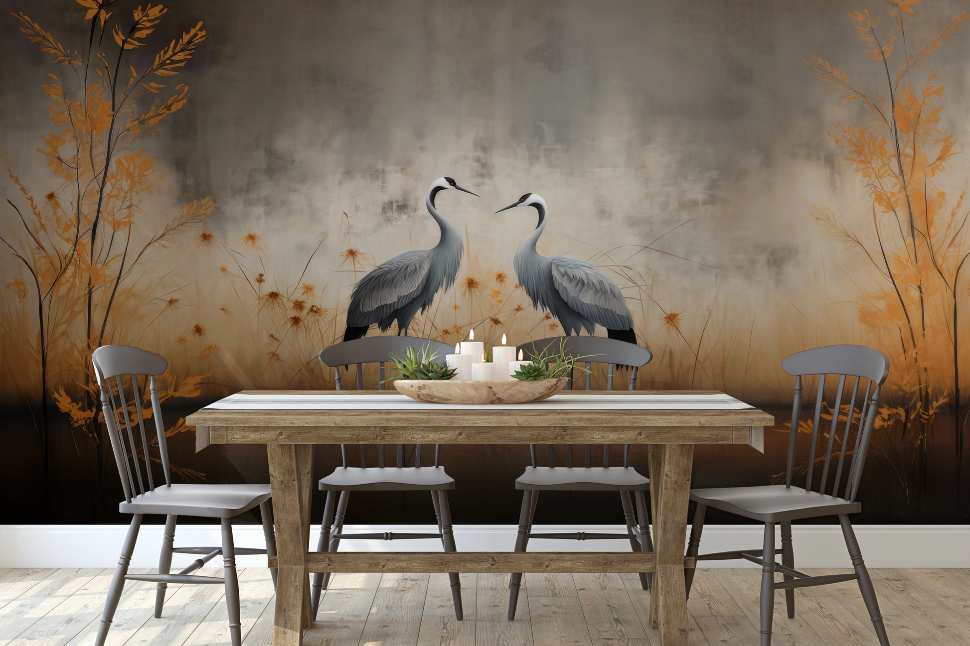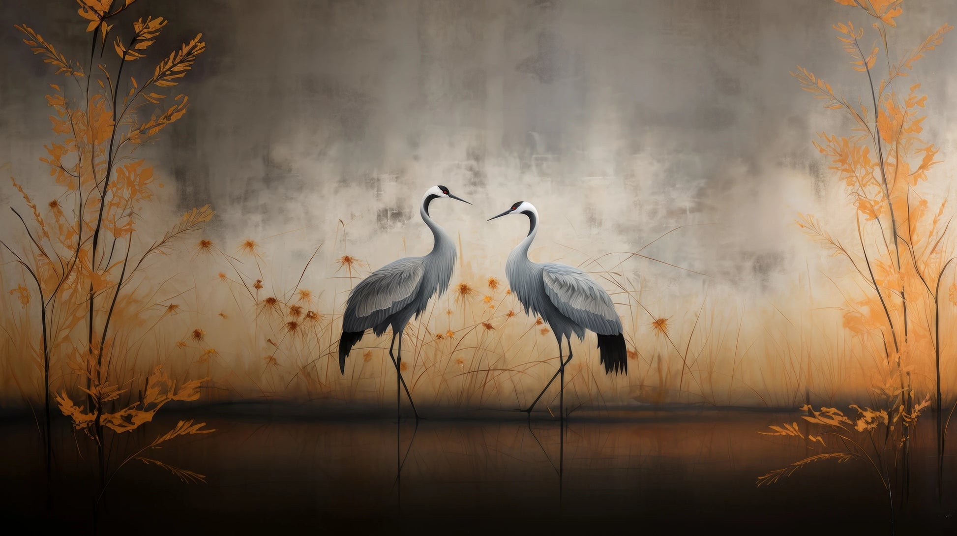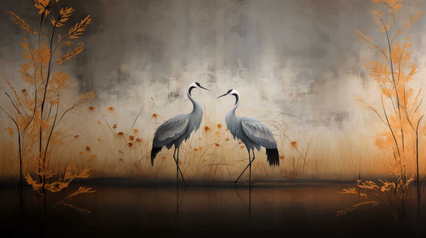 Autumn Mirage – Kraniche tauchen aus einer Herbstlandschaft auf, akzentuiert mit goldenen Farbtönen, die die Illusion von Wärme und Frieden erzeugen.