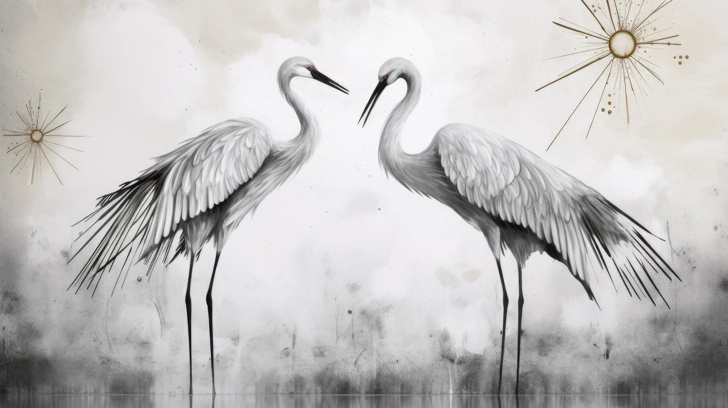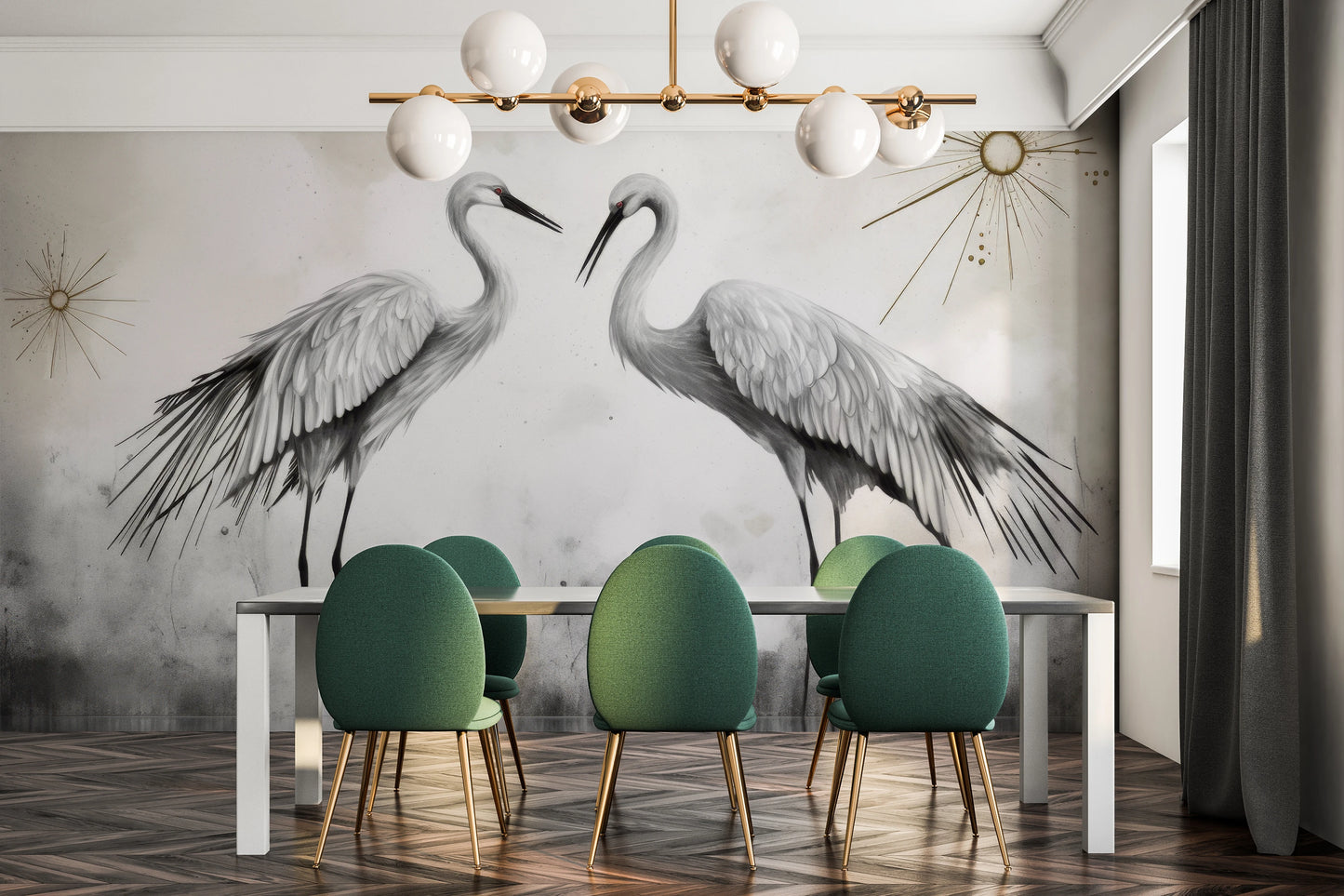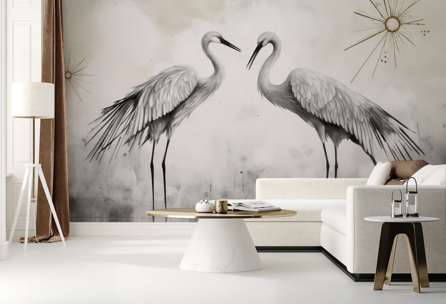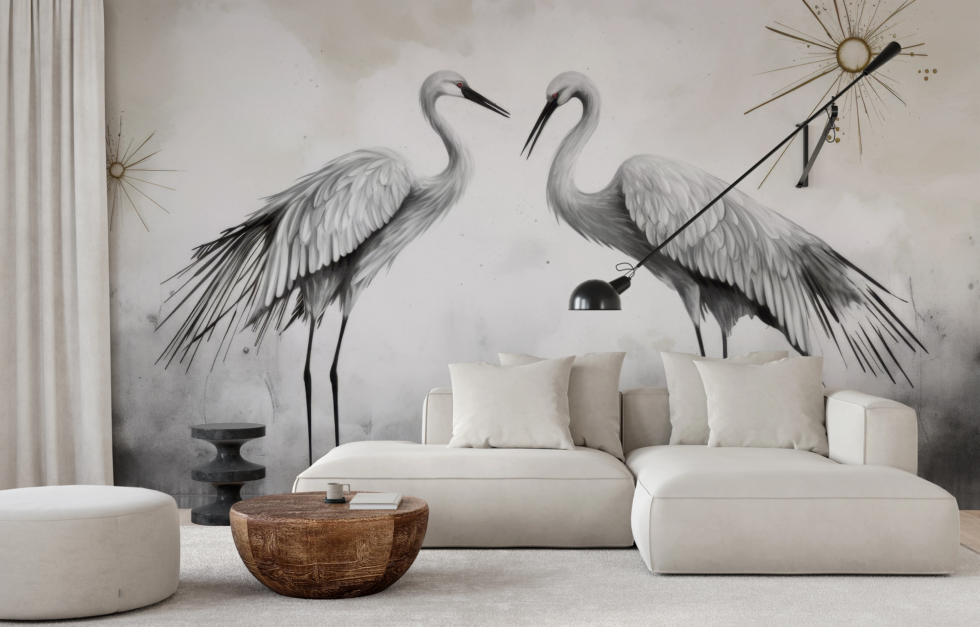 Kosmischer Tanz – Kraniche vor einem verschwommenen Himmel in Grau- und Beigetönen mit Akzenten aus goldenen Sternen sorgen für ein Element der Raffinesse. Diese Tapete kann als Kunstwerk betrachtet werden.