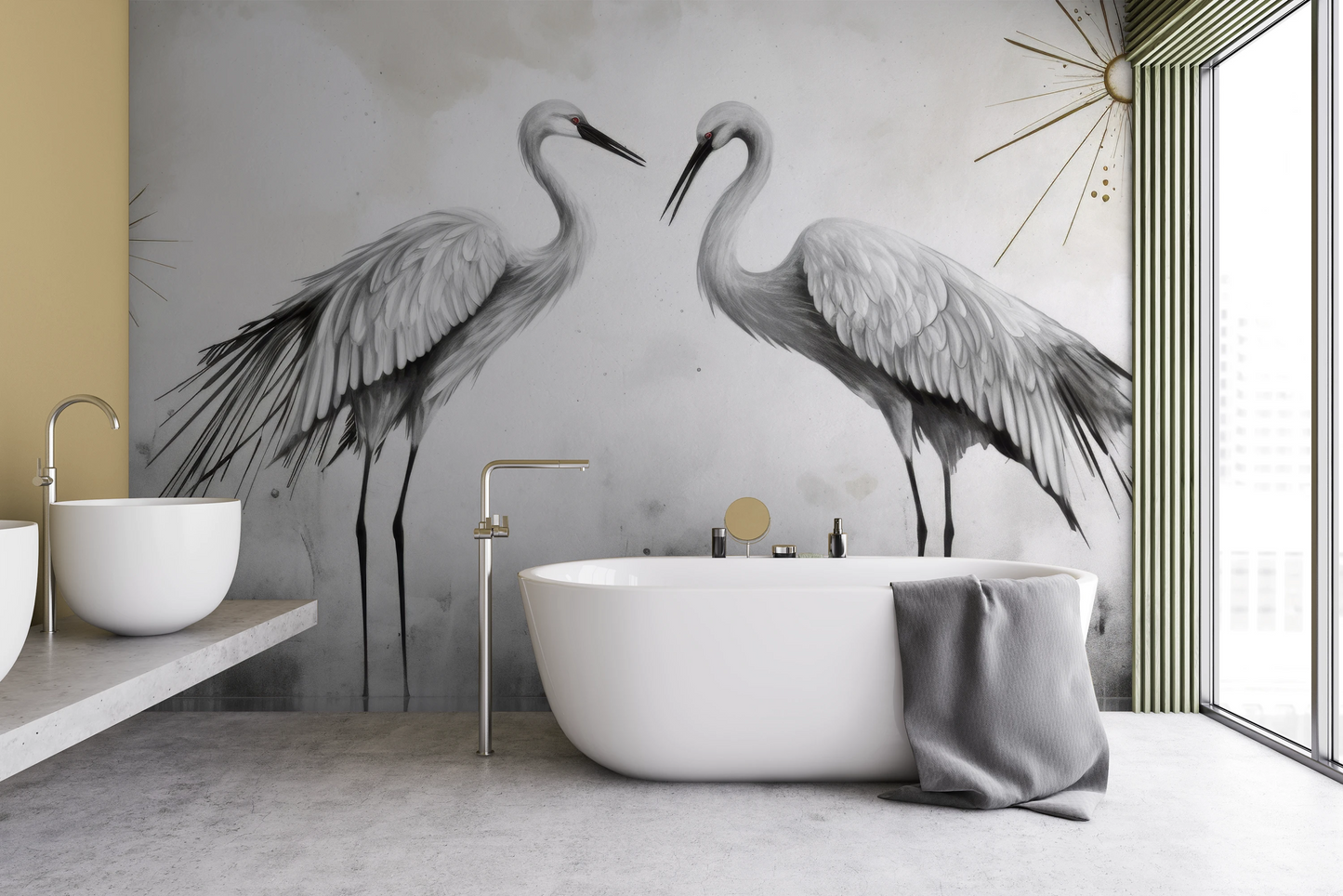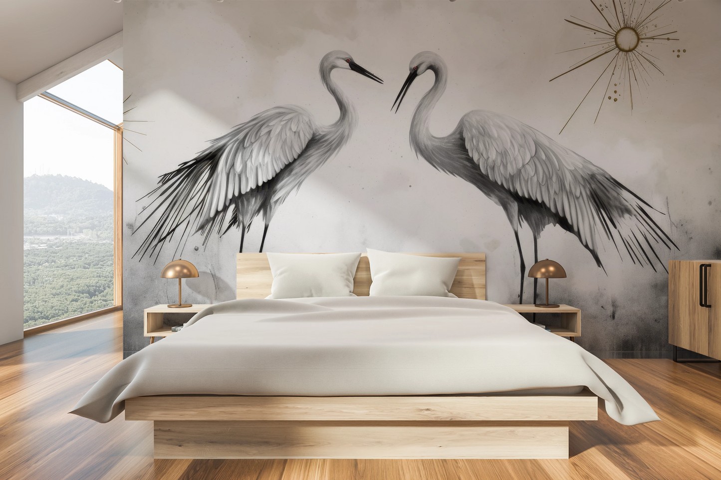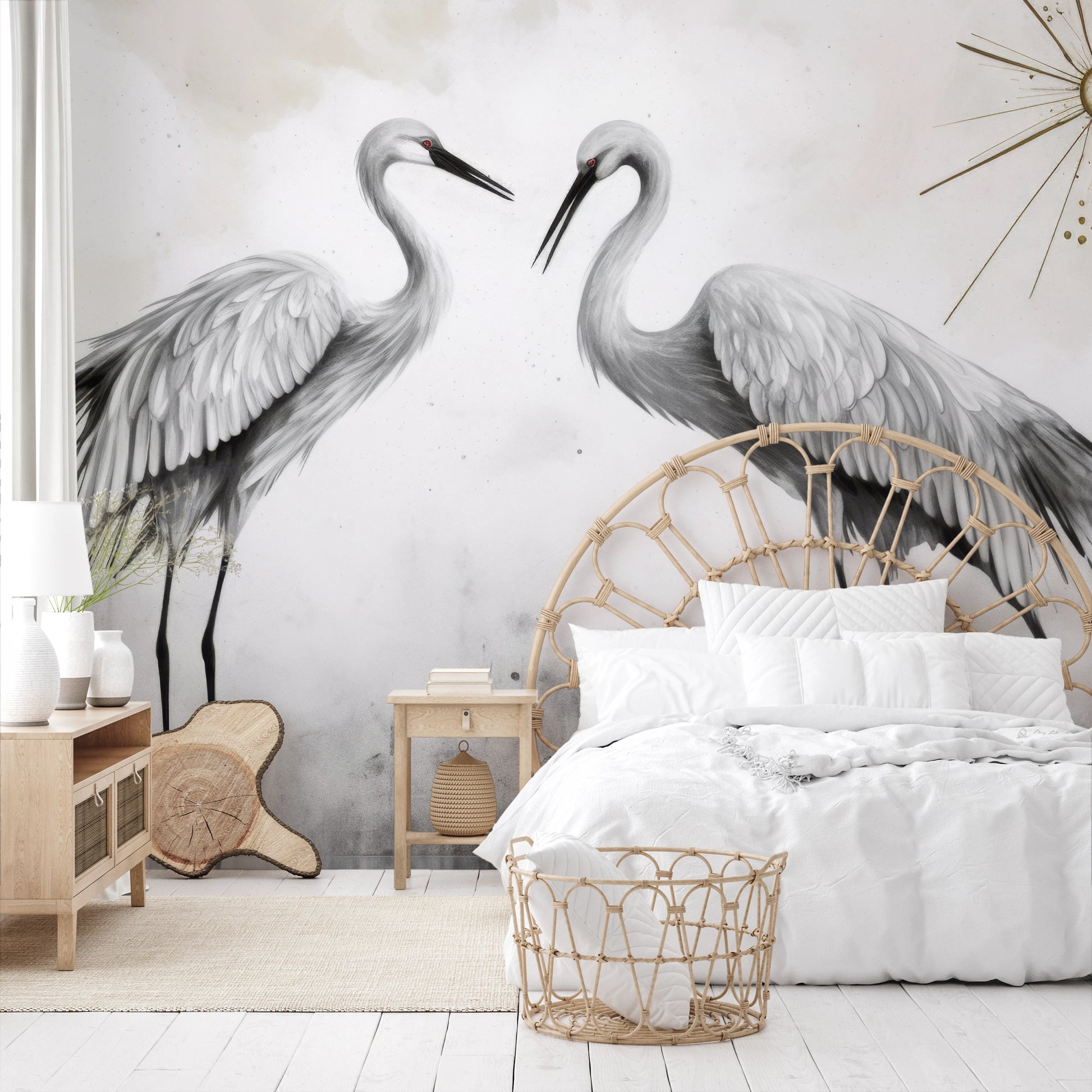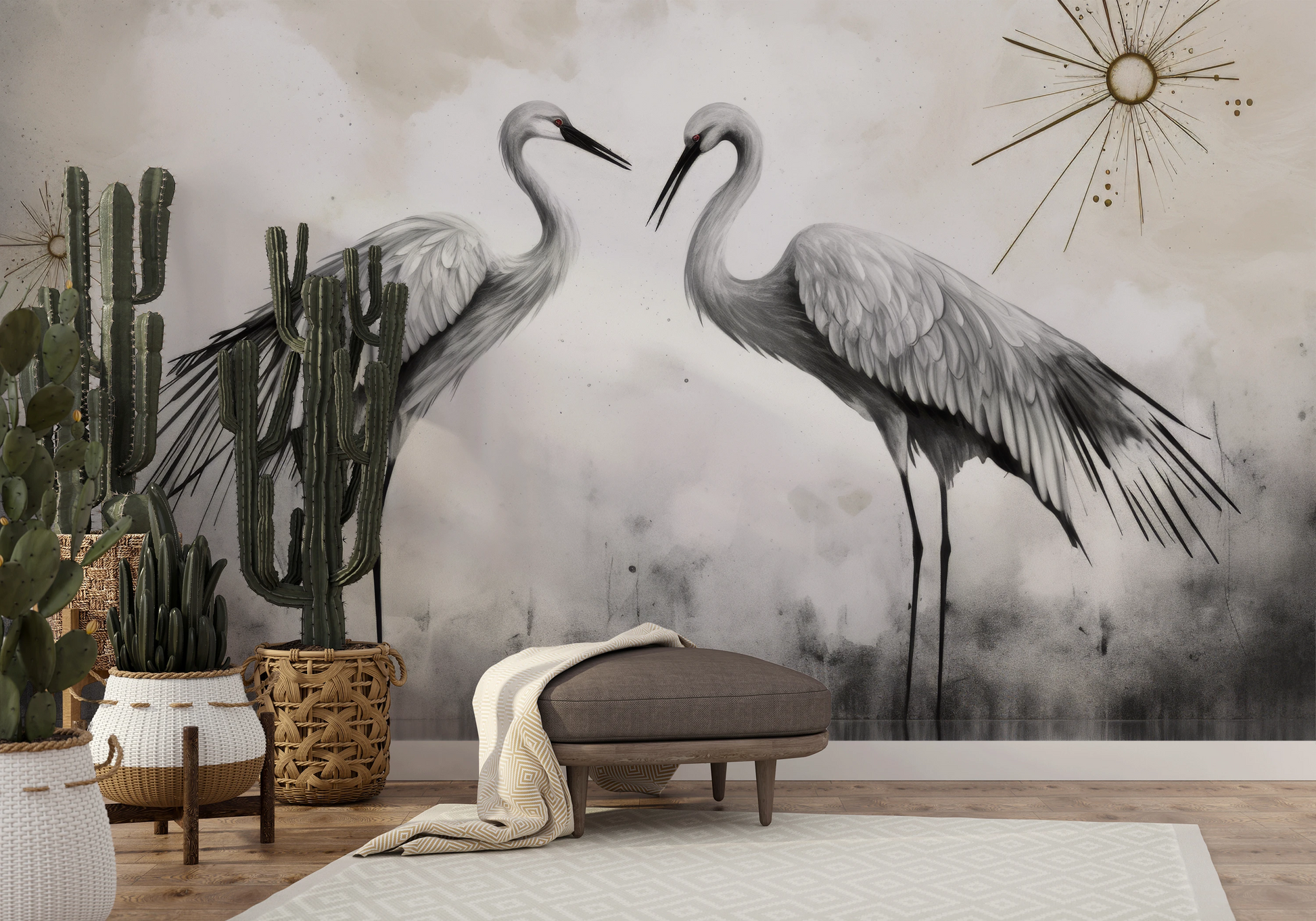 Kosmischer Tanz – Kraniche vor einem verschwommenen Himmel in Grau- und Beigetönen mit Akzenten aus goldenen Sternen sorgen für ein Element der Raffinesse. Diese Tapete kann als Kunstwerk betrachtet werden.