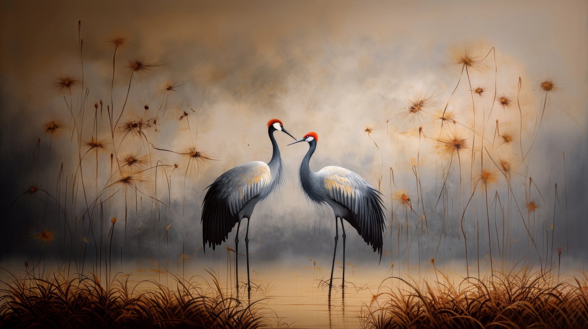 Diese Kollektion ist eine visuelle Hommage an die majestätischen Kraniche, die in vielen Kulturen, insbesondere in Asien, oft als Symbol für Glück und Langlebigkeit gelten. Künstlerische Werke vereinen subtile Eleganz und Ruhe, was sie zu einer idealen Wahl für Innenräume macht, die ein wenig Ruhe und Harmonie suchen. Die Gemälde zeigen Kraniche in verschiedenen Posen und Einstellungen, von einzelnen, fokussierten Figuren bis hin zu Paaren in einer zarten, fast tanzenden Anordnung.