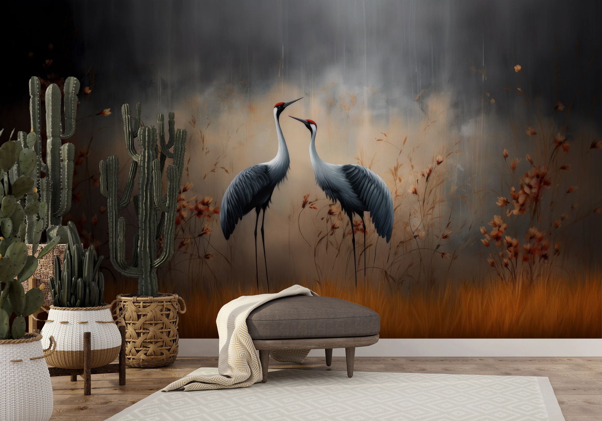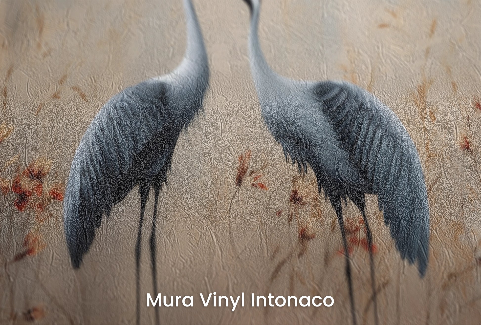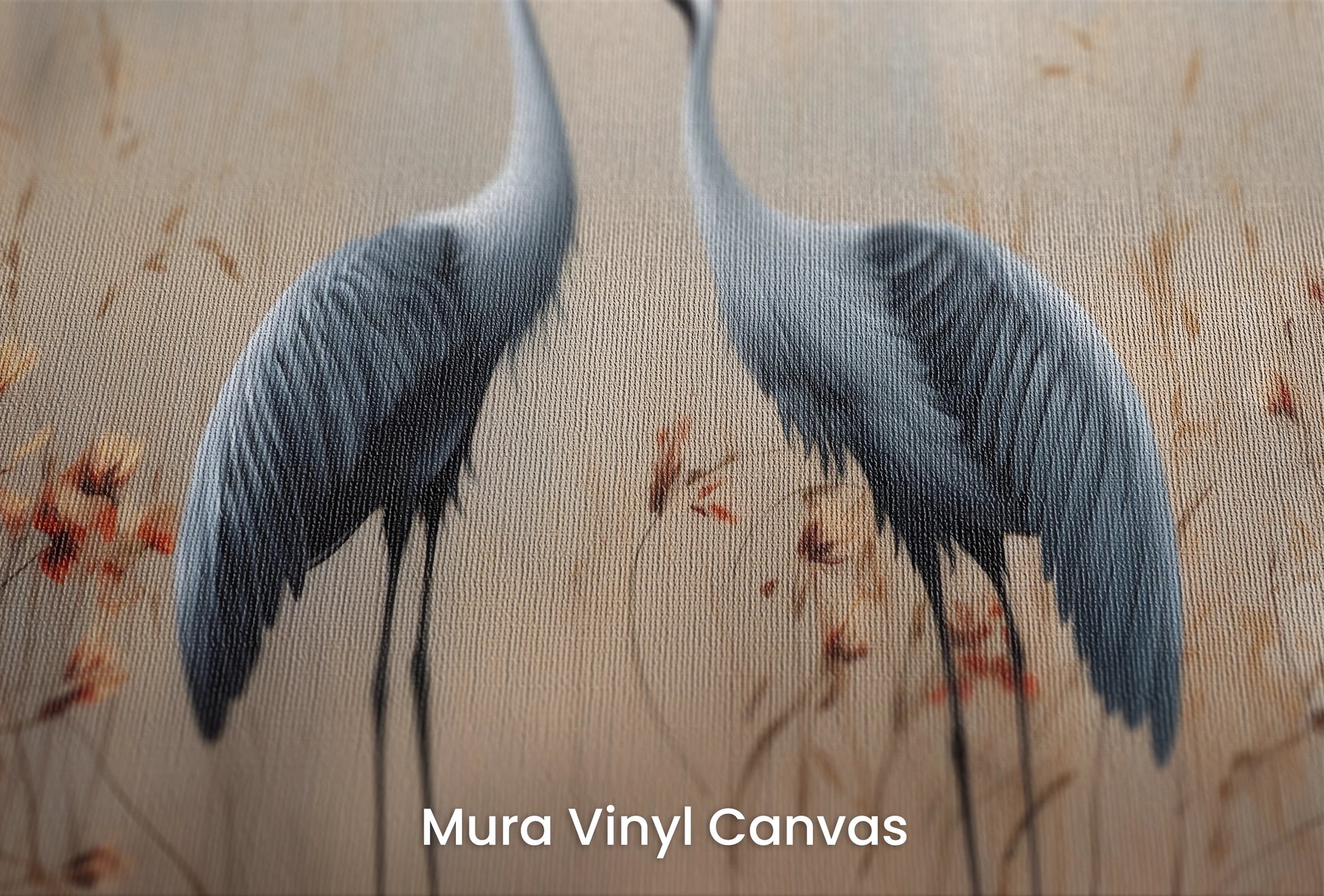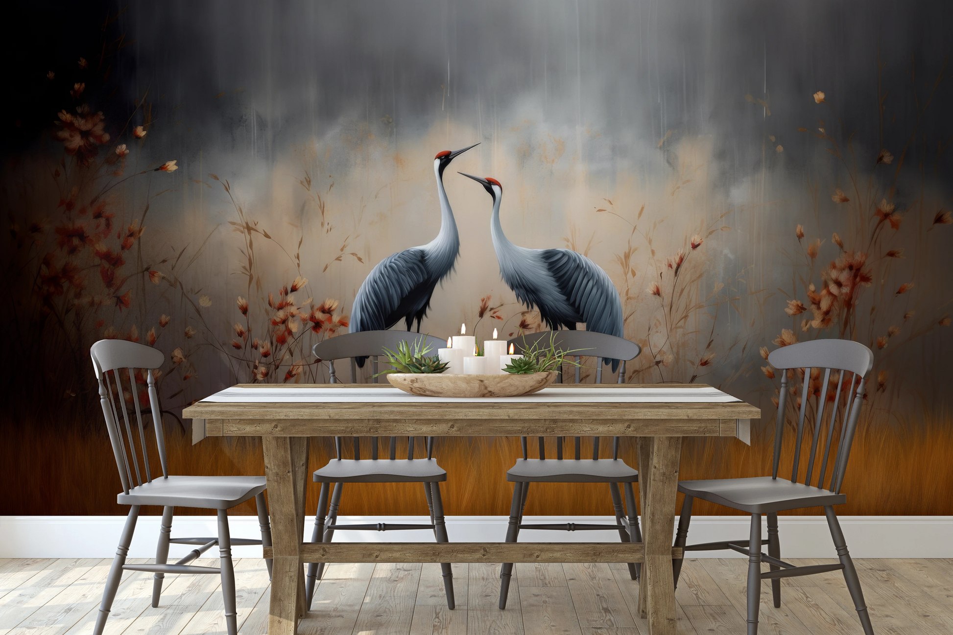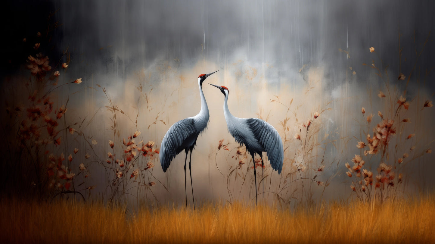 Elegante Silhouetten – Dezente Umrisse von Kranichen vor dem Hintergrund herbstlicher Farben, mit einem Hauch von Eleganz und Schlichtheit, perfekt für ruhige und stilvolle Innenräume.