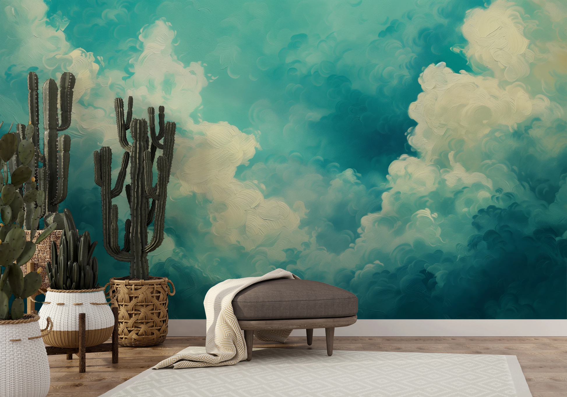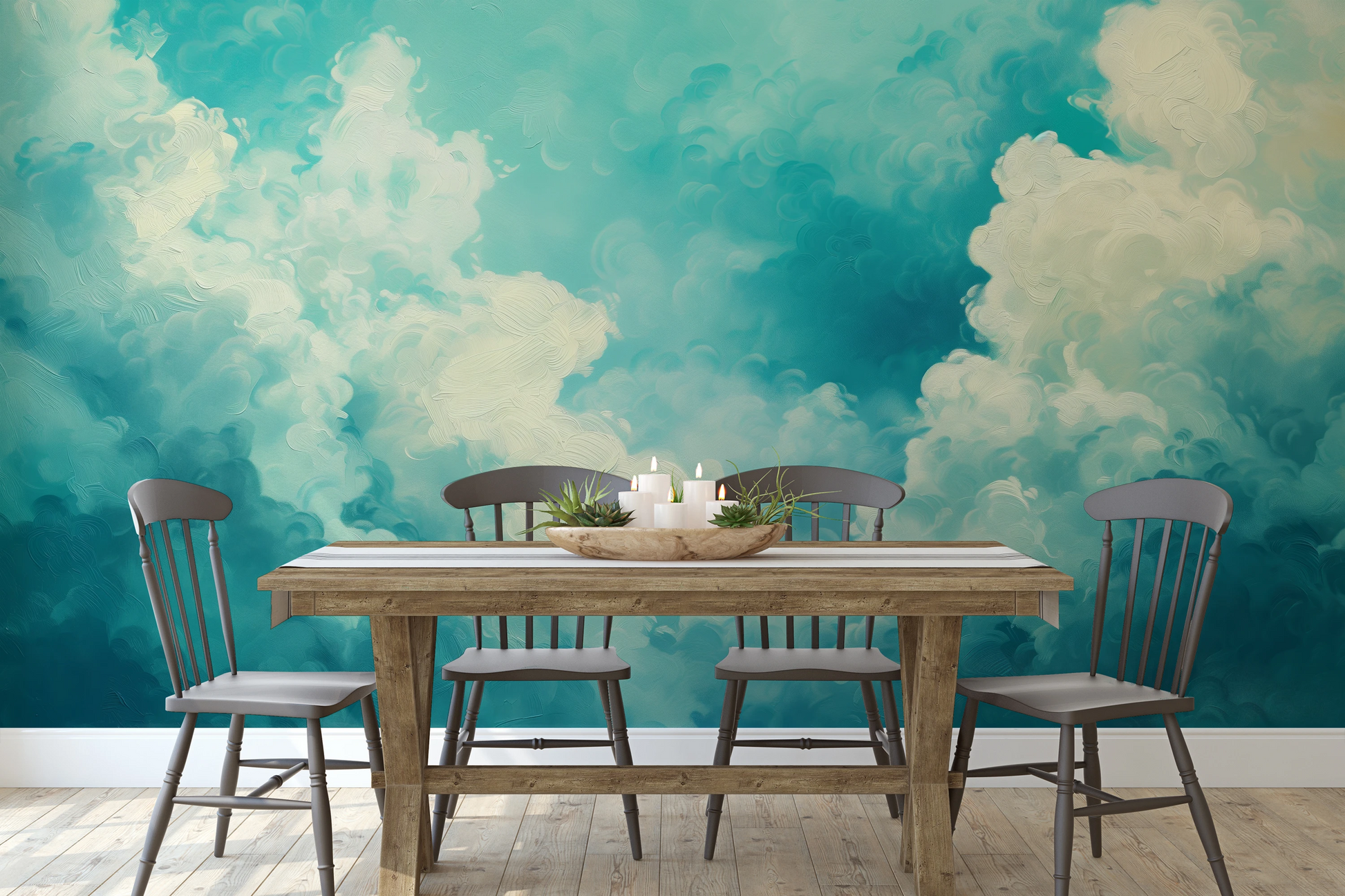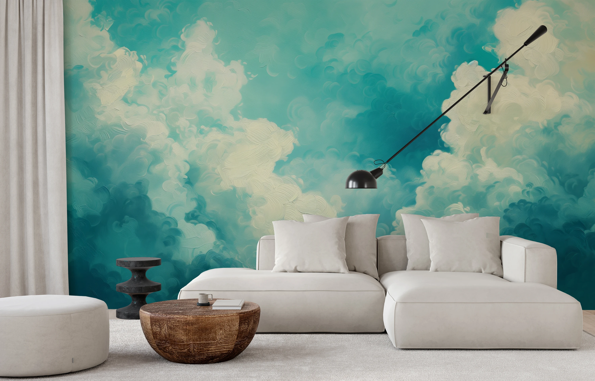 Eine künstlerische Fototapete, die einem Smaragdnebel ähnelt, in dem sich Blau und Grün zu einer satten, ätherischen Komposition vereinen.