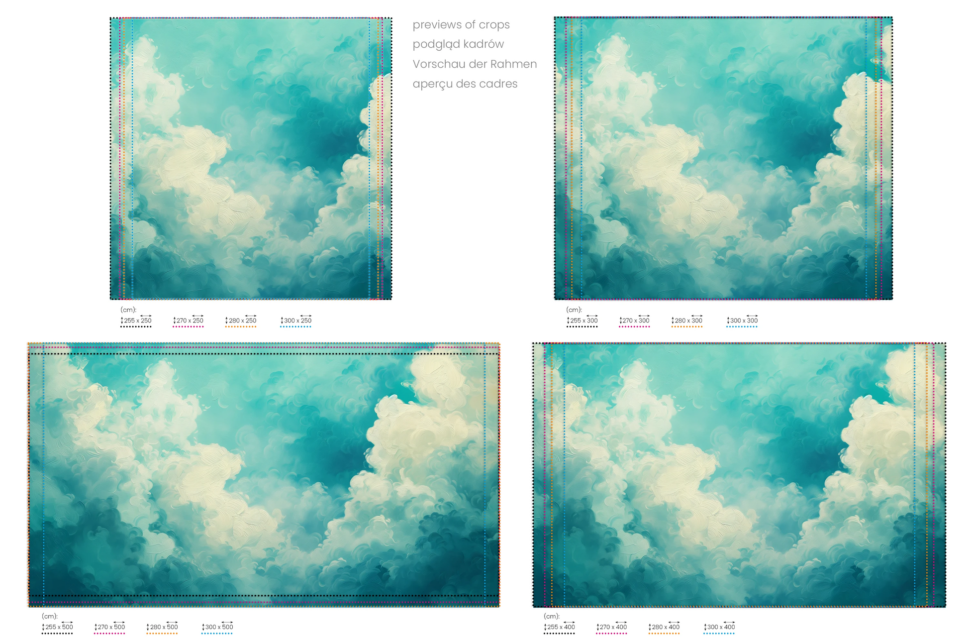 Alle unsere Designs sind standardmäßig auf unserer Website in den Maßen 300 cm hoch x 500 cm breit verfügbar.