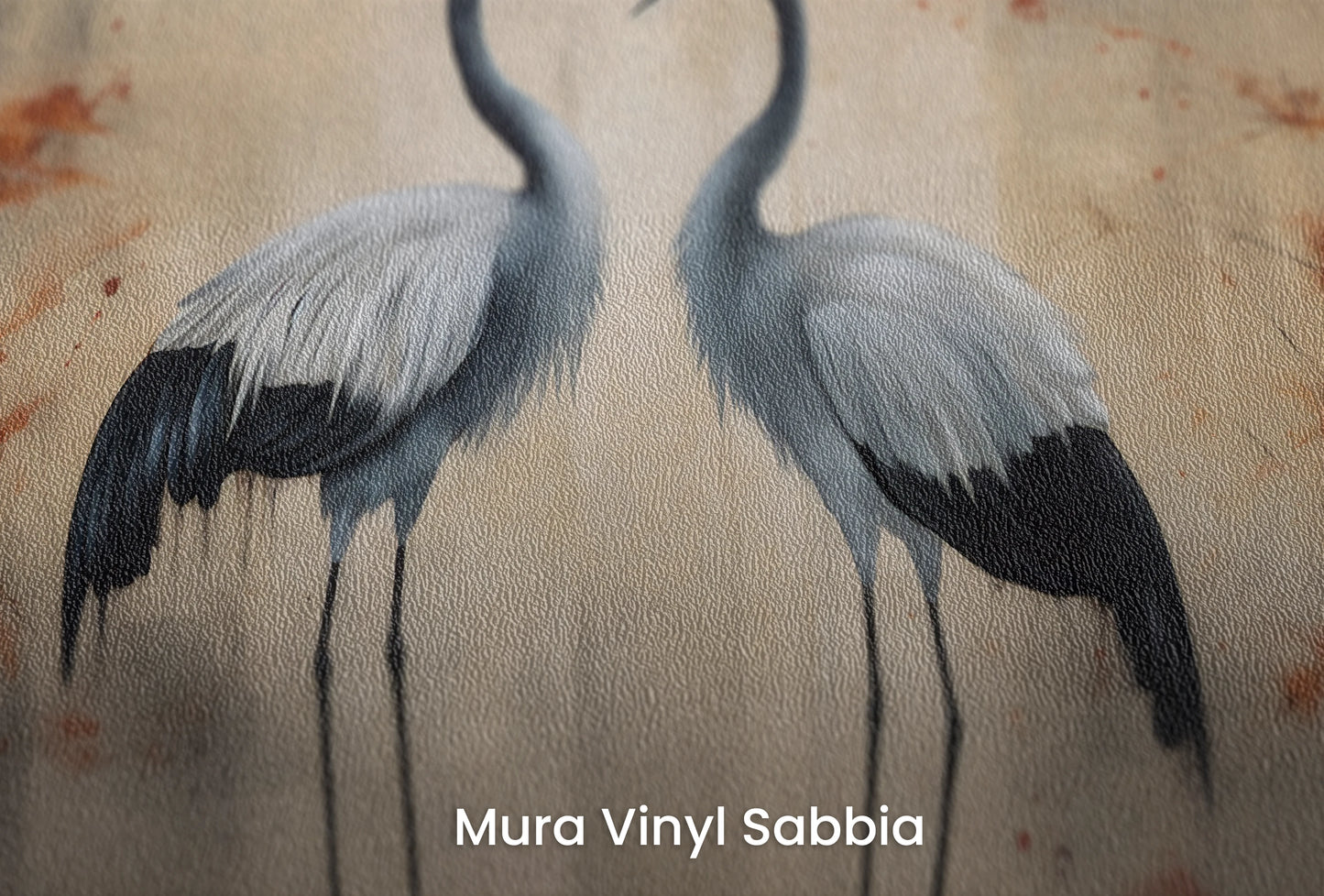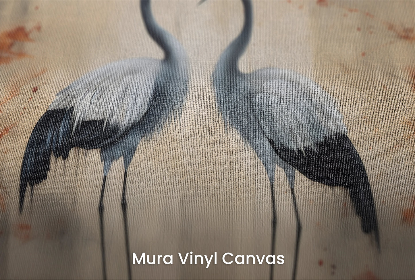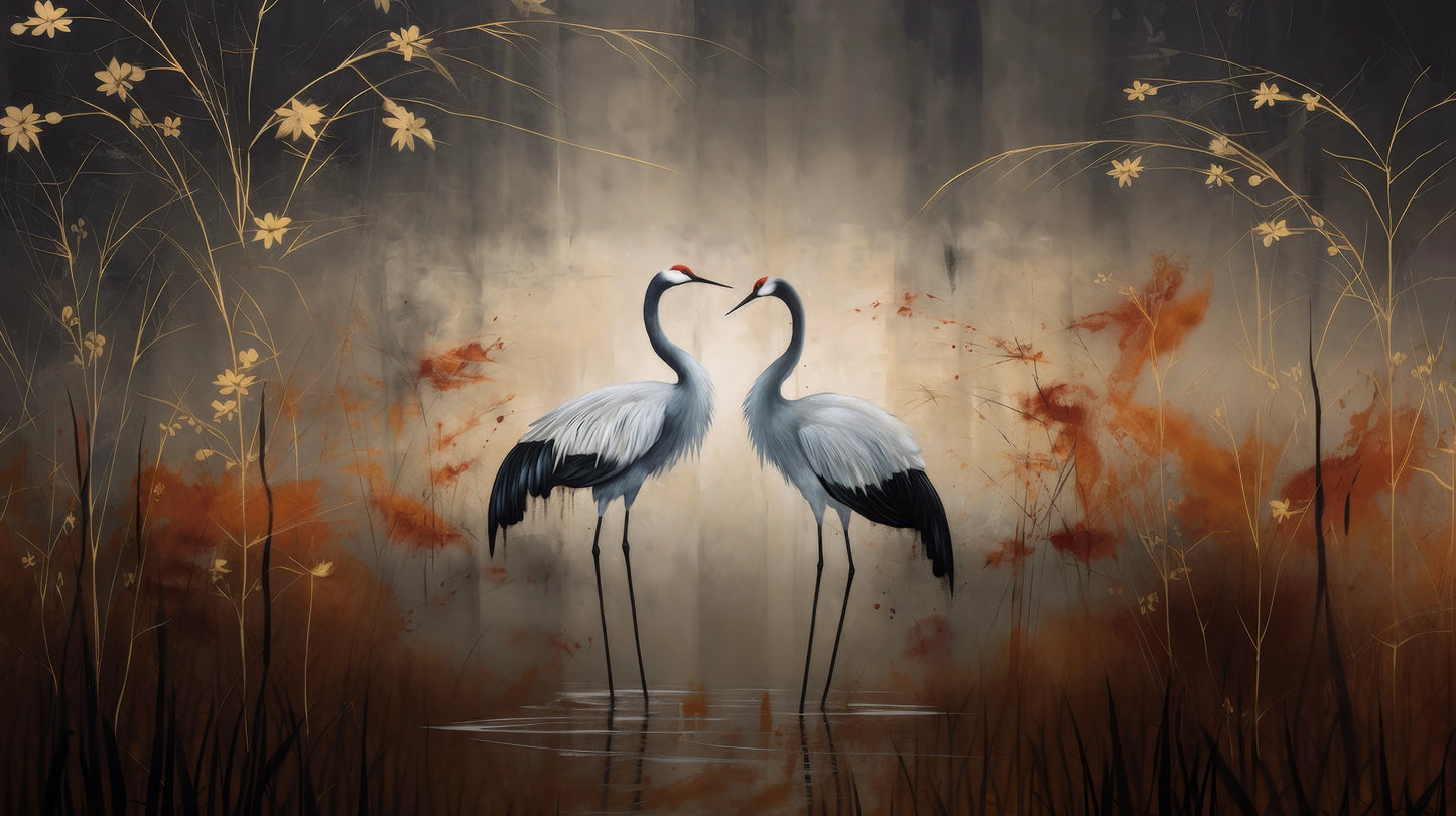 Ewiger Walzer – Zwei Kraniche in tanzender Position vor dem Hintergrund stilisierten goldenen Grases erzeugen ein Gefühl von Bewegung und Eleganz.