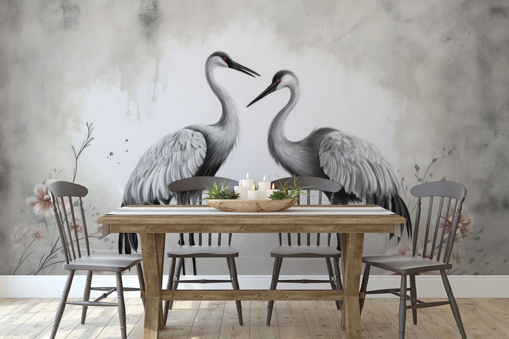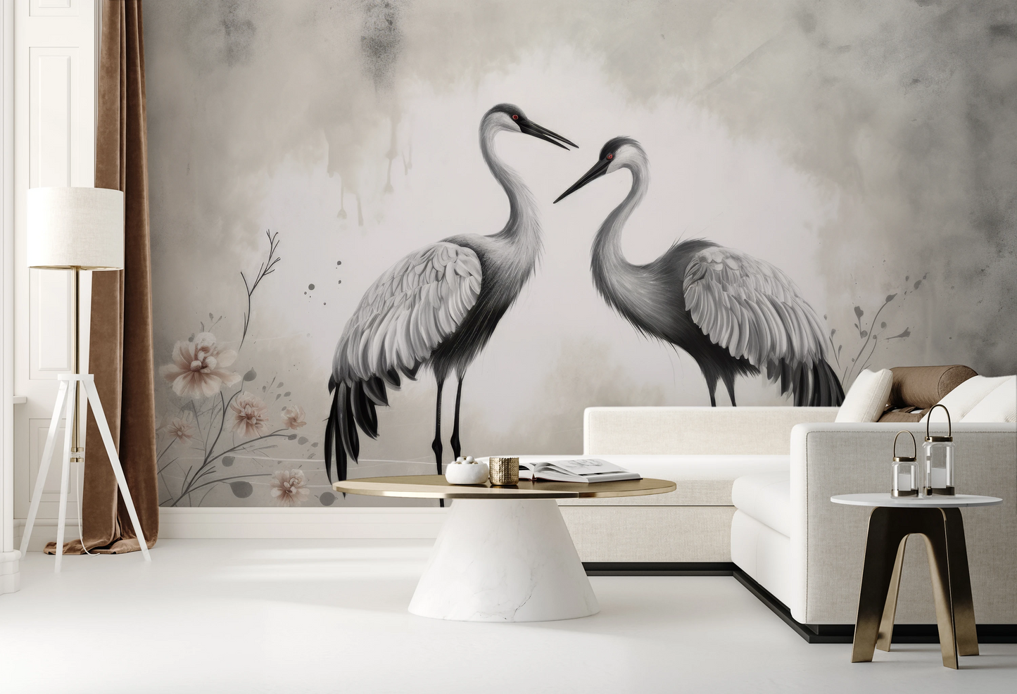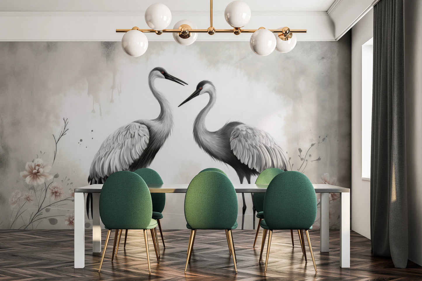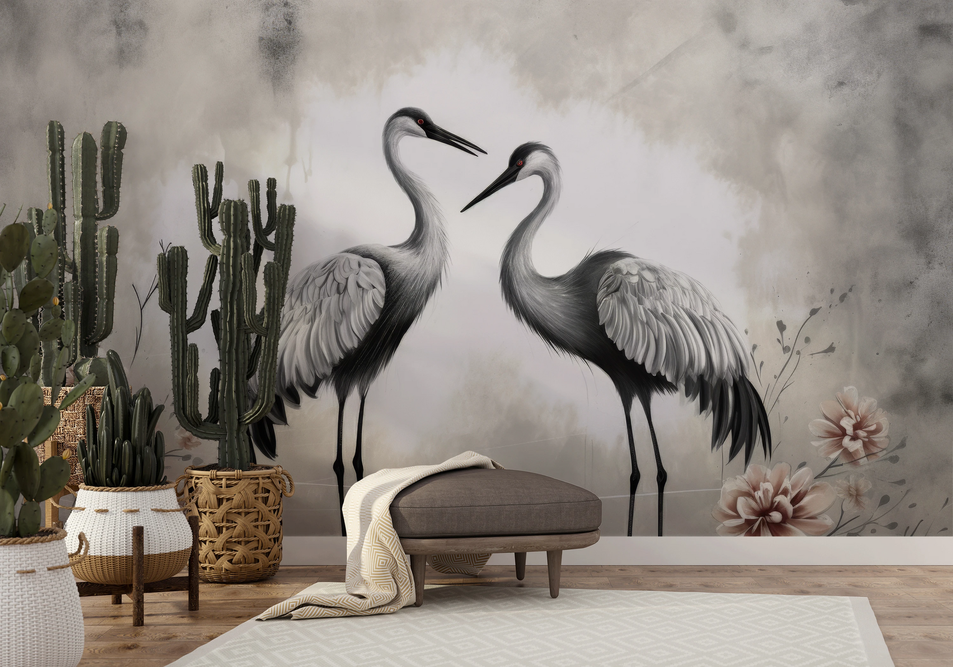 Anmut im Duett – Zwei Kraniche, die den Mittelpunkt des Musters bilden, spiegeln Eleganz und Würde wider. Grau- und Beigetöne werden durch zarte Blumen ergänzt, was der Tapete einen dezenten und ästhetischen Charakter verleiht.