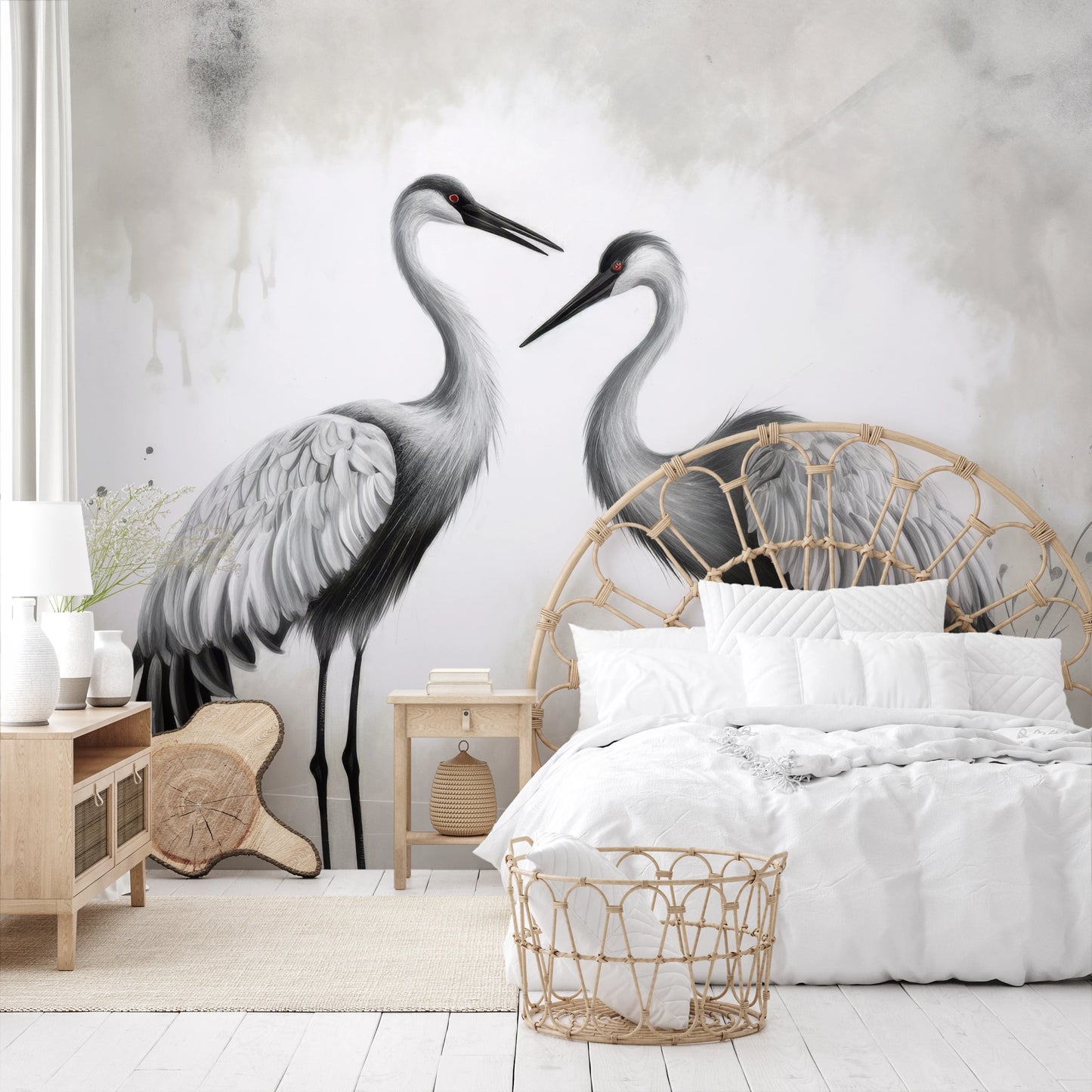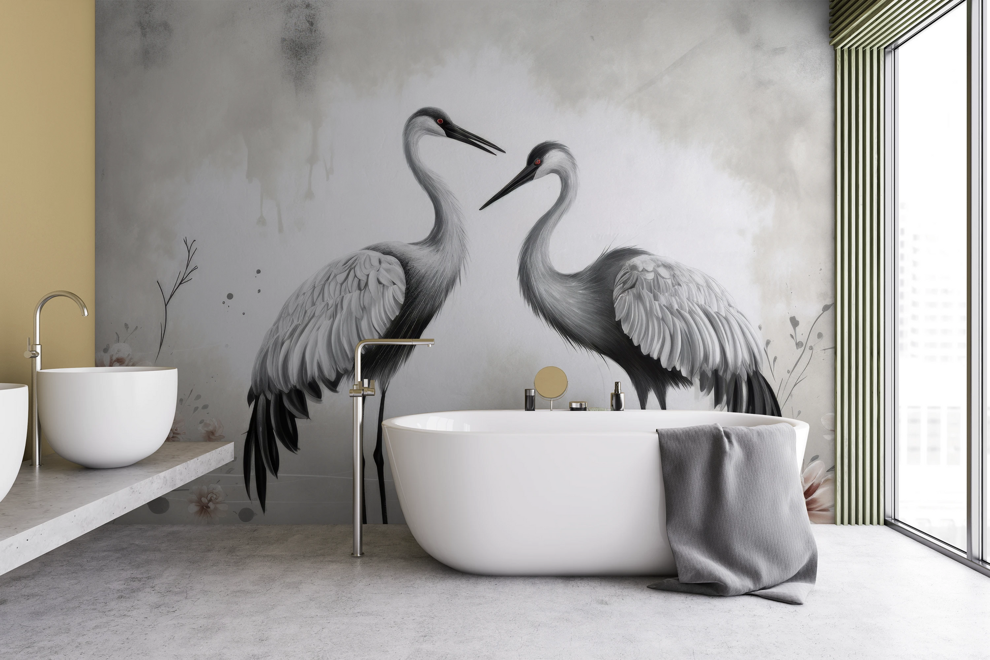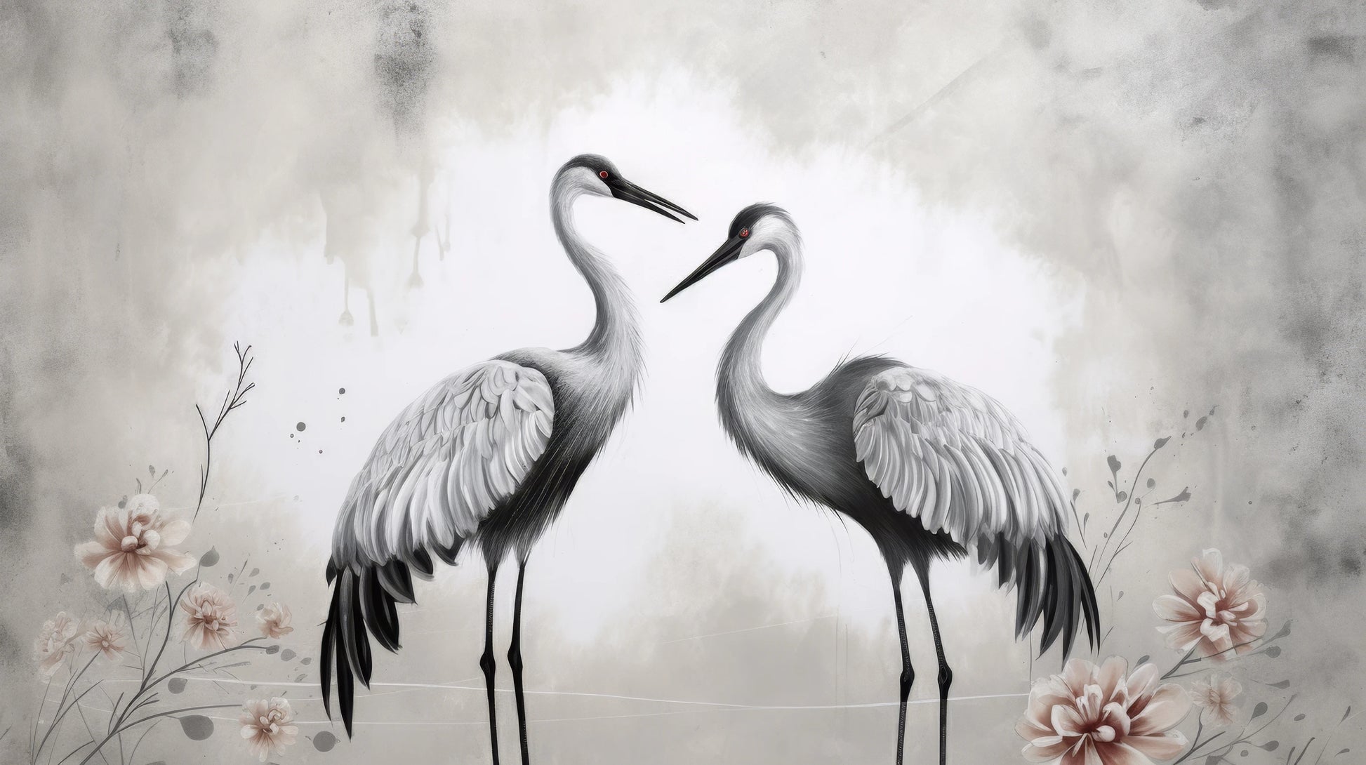 Anmut im Duett – Zwei Kraniche, die den Mittelpunkt des Musters bilden, spiegeln Eleganz und Würde wider. Grau- und Beigetöne werden durch zarte Blumen ergänzt, was der Tapete einen dezenten und ästhetischen Charakter verleiht.