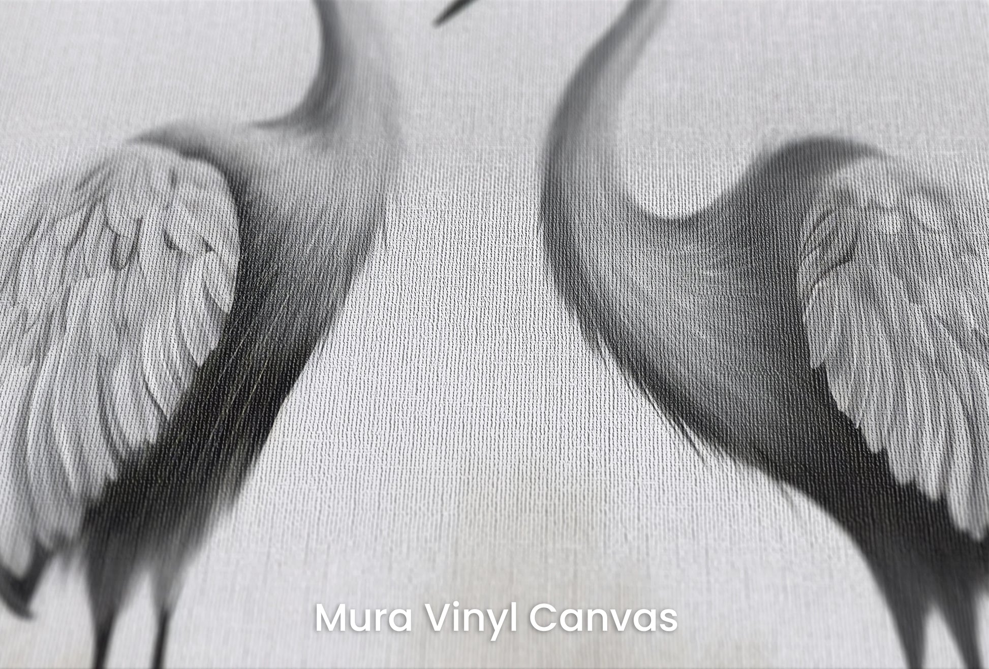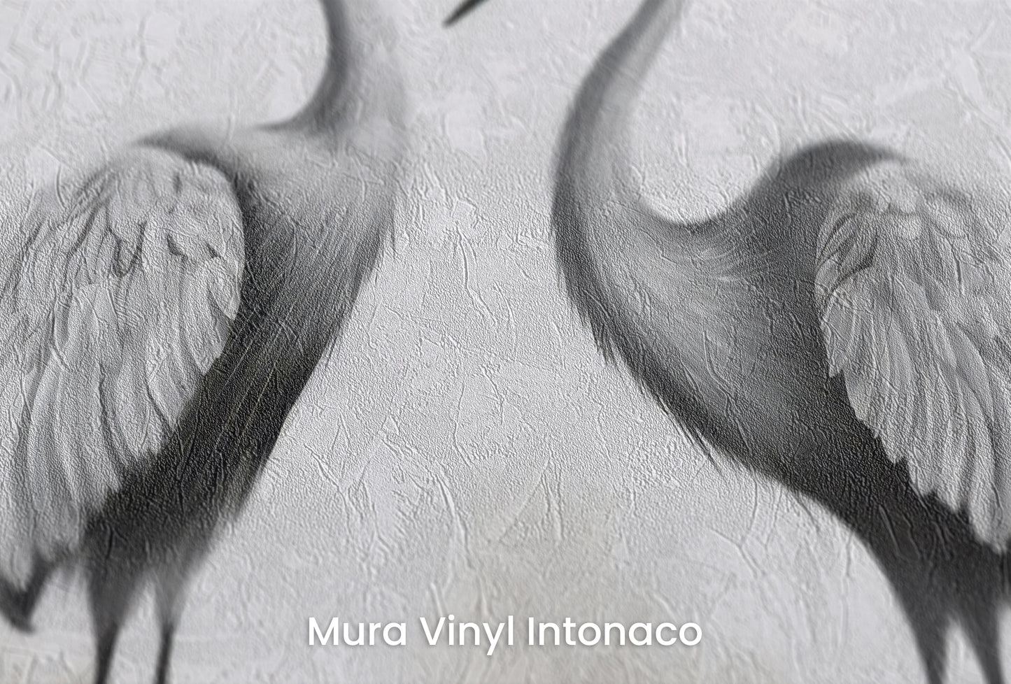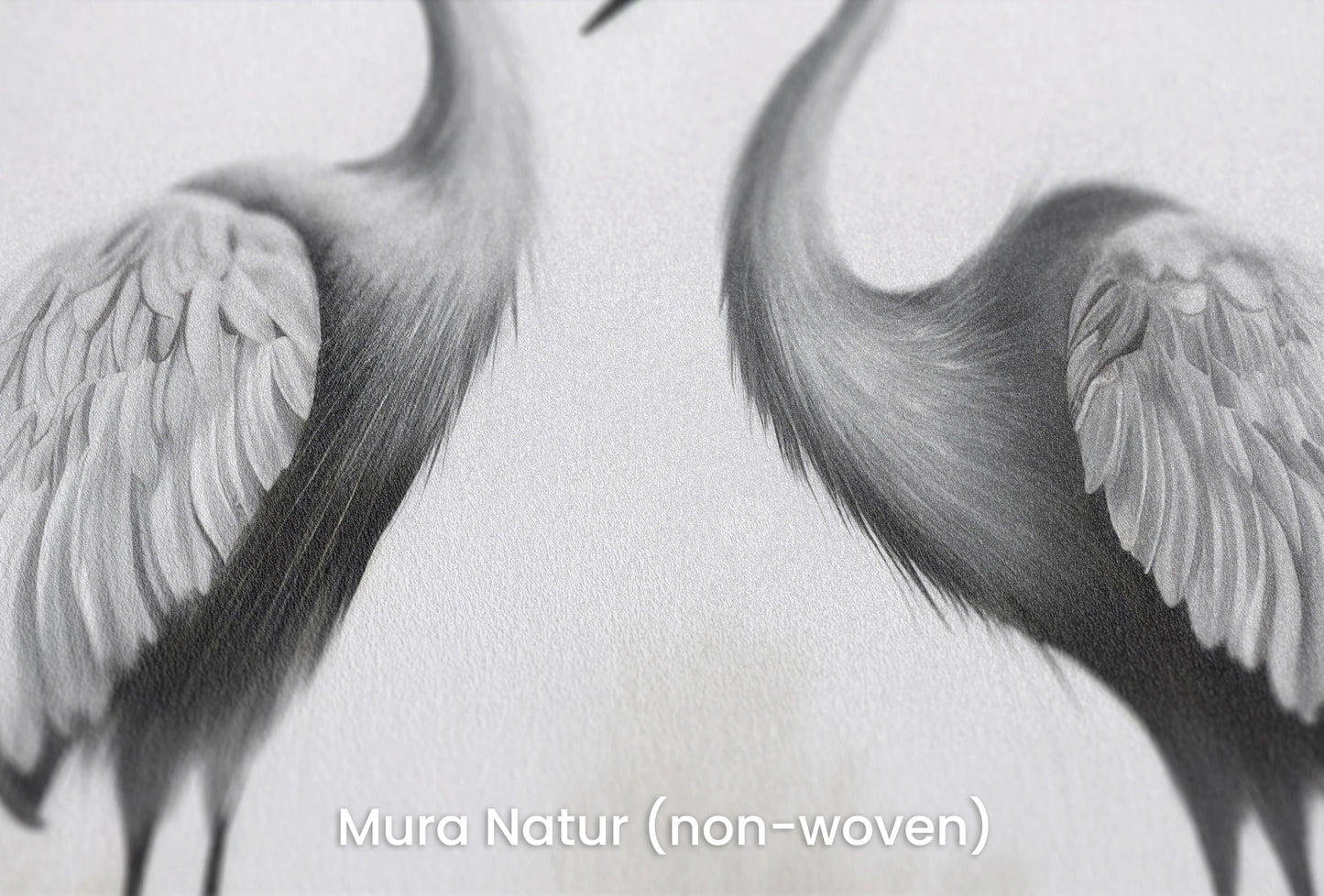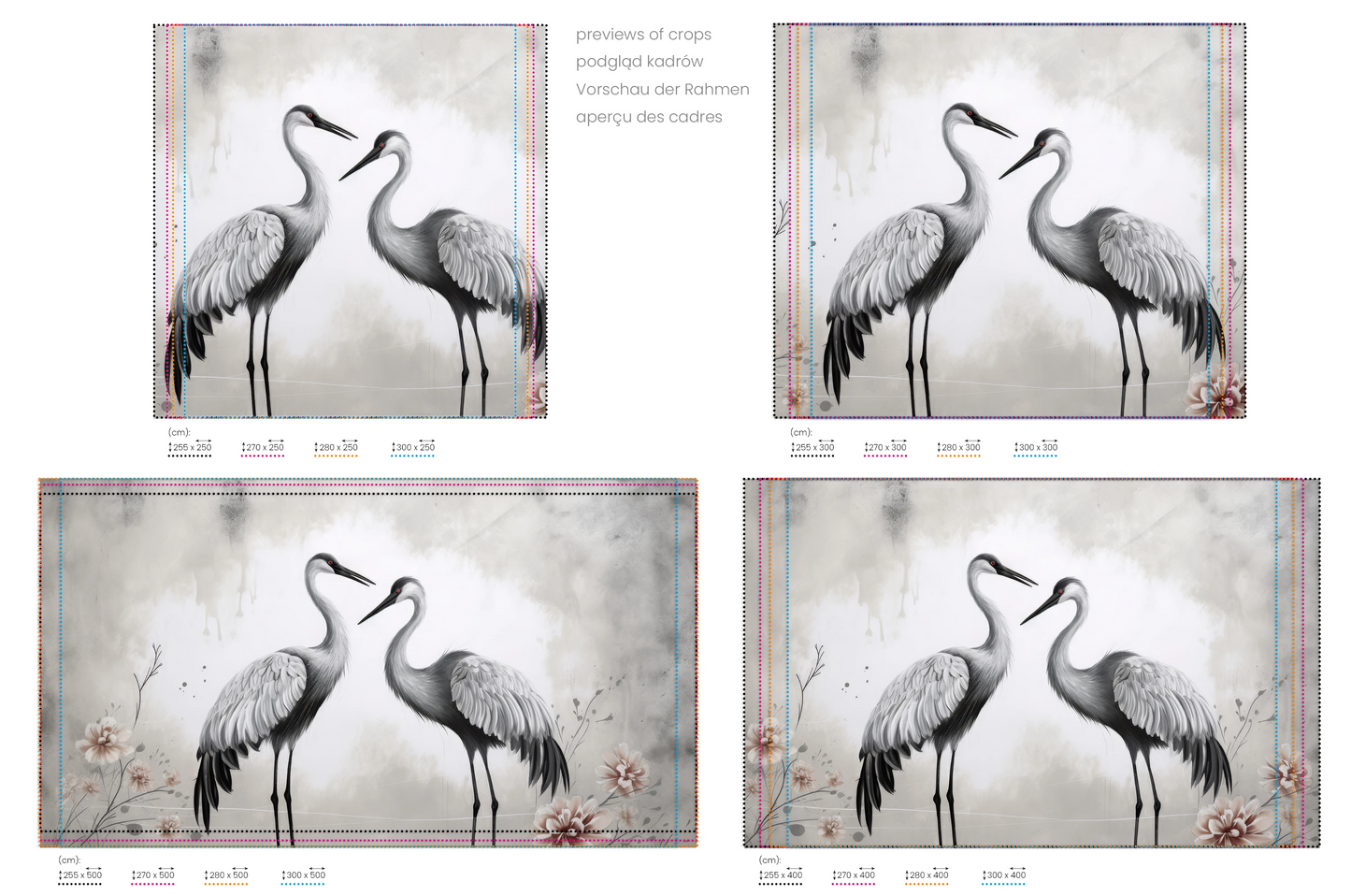Anmut im Duett – Zwei Kraniche, die den Mittelpunkt des Musters bilden, spiegeln Eleganz und Würde wider. Grau- und Beigetöne werden durch zarte Blumen ergänzt, was der Tapete einen dezenten und ästhetischen Charakter verleiht.