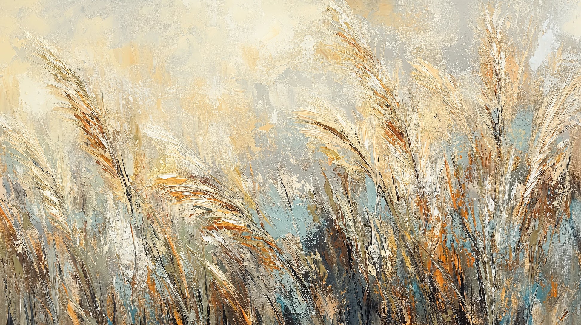 Goldene Weizenhalme tanzen im sanften Morgenlicht, als schwebten sie in einem traumhaften Zustand zwischen Himmel und Erde. Zarter Blauschleier verschmilzt mit der Wärme bernsteinfarbener Töne und schafft eine Komposition malerischer Ruhe. Dieses kunstvolle Wandbild lädt in eine Welt ein, in der die Natur die Form reiner visueller Poesie annimmt. Diese Fototapete ist ein wahres Kunstwerk, das das traditionelle Wiesenmotiv in eine raffinierte Abstraktion verwandelt. Künstlerische Präzision ist in jedem Pinselstrich spürbar – die weichen Konturen der Maserung verflechten sich mit ausdrucksstarken Farbstreifen und erzeugen eine harmonische Symphonie der Texturen. Die dominante Palette aus warmen Beige-, Gold- und Honigtönen kontrastiert subtil mit kühlen Akzenten in Blau und Grau und schafft so eine Balance zwischen Ruhe und Dynamik. Die Impasto-Technik verleiht dem gesamten Werk eine außergewöhnliche Tiefe und verleiht der Wand eine fast skulpturale Dimension. Investieren Sie in ein Wandbild, das Ihren Raum in eine Galerie zeitgenössischer figurativer Kunst verwandelt. Die Komposition strahlt natürliche Wärme und eine Aura ländlicher Nostalgie aus und bleibt dabei elegant modern. Diese Tapete passt hervorragend in ein Wohnzimmer mit hellem, skandinavischem Design und unterstreicht den gemütlichen Charakter des Interieurs. Auch im Schlafzimmer macht sie sich gut und schafft eine Atmosphäre wohltuender Entspannung und Harmonie mit der Natur. In Büros oder Coworking-Bereichen verleiht sie Inspiration und regt zu ruhiger Konzentration an. Mit dieser Wandmalerei investieren Sie in ein authentisches Kunstwerk, das die Ästhetik der Ölmalerei mit dem zeitlosen Motiv der Natur verbindet. Die zarten, gedämpften Farben sorgen dafür, dass das Muster nicht dominiert, sondern subtil mit dem Arrangement harmoniert und dessen künstlerischen Reiz unterstreicht. Diese Wandmalerei ist für alle, die Wert auf ein Gleichgewicht zwischen Natur und Abstraktion legen und Ruhe und Eleganz in ihren Innenräumen suchen.