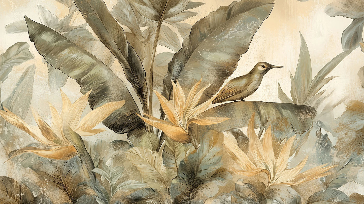 In einem zarten Spiel aus Licht und Schatten schweben exotische Blüten, die an Paradiesvögel erinnern, vor einem Hintergrund aus mystischen Blättern. Diese kunstvolle Komposition erinnert an warme, tropische Morgen, wenn die ersten Sonnenstrahlen die dichte Vegetation durchdringen und ein magisches Lichtspiel erzeugen. Die Tapete kombiniert majestätische Palmen- und Bananenblätter mit zarten Strelitzienblüten in Gold- und Cremeweißtönen. Die künstlerische Präzision des Designs zeigt sich in jedem Detail – von den subtilen Farbübergängen bis hin zu den meisterhaft wiedergegebenen Texturen der Pflanzen. Die dezente Farbpalette, dominiert von Grau-, Grün- und Goldtönen, schafft ein harmonisches Ganzes, das sich elegant in eine Vielzahl von Einrichtungsstilen einfügt. Diese Tapete eignet sich sowohl für ein geräumiges Wohnzimmer als auch für ein Schlafzimmer und schafft dort eine Atmosphäre der Ruhe und des natürlichen Luxus. Mit dieser Tapete entscheiden Sie sich für eine einzigartige Fototapete, die Ihren Raum in eine Galerie voller tropischer Inspiration verwandelt. Die einzigartige Komposition, in der ein zarter Kolibri inmitten exotischer Blumen im Mittelpunkt steht, bringt ein erzählerisches und geheimnisvolles Element ins Spiel. Es ist nicht nur eine Wanddekoration – es ist ein Fenster zu einer Welt, in der Natur auf raffinierteste Weise auf Kunst trifft.