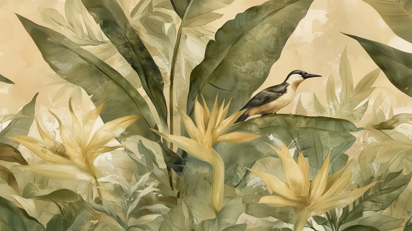 In einer Welt, in der Natur auf Kunst trifft, entführt uns diese einzigartige Tapete in einen exotischen Garten voller goldener Strelitzien und üppigem Grün. Ein zarter Vogel, wie ein Wächter dieses Paradieses, verleiht der Komposition einzigartigen Charakter und ein geheimnisvolles Flair. Diese künstlerische Tapete vereint meisterhaft botanische Präzision mit malerischer Freiheit. Die Komposition wird von majestätischen Strelitzien in warmen, goldenen Farbtönen dominiert, die mit dem intensiven Grün der tropischen Blätter kontrastieren. Jedes Detail wurde sorgfältig wiedergegeben und erzeugt den Effekt eines handgemalten Gemäldes. Der dezente, cremige Farbton des Hintergrunds verleiht dem gesamten Werk einen eleganten, zeitlosen Charakter und lässt die Hauptelemente des Designs durchscheinen. Diese Tapete eignet sich ideal für Räume, die ein exklusives, exotisches Flair vermitteln sollen. Sie fügt sich harmonisch sowohl in ein elegantes Wohnzimmer als auch in ein anspruchsvolles Schlafzimmer ein und schafft eine Atmosphäre der Ruhe und des Luxus. Dieses hochwertige Kunstwerk verwandelt jedes Interieur in eine Kunstgalerie und bringt ein Element der Natur in urbane Räume. Diese einzigartige Tapete ist mehr als nur Dekoration – sie ist eine künstlerische Reise in ein tropisches Paradies, in dem die Zeit stehen geblieben ist. Mit dieser Tapete holen Sie sich ein Stück exotische Welt in Ihr Interieur, wo sich die Natur in ihrer schönsten Form offenbart.