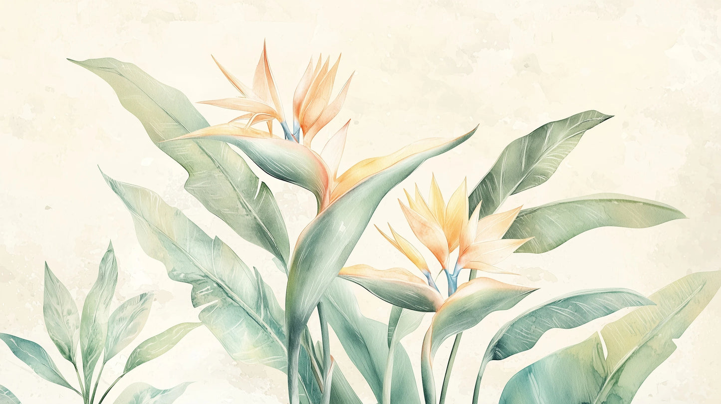 In einer zarten Palette aus Pastellgrün und warmen Orangetönen blüht die majestätische Strelitzie, auch Paradiesvogelblume genannt. Ihre schlanken, eleganten Formen schweben vor dem Hintergrund weicher, aquarellierter Blätter und schaffen eine Komposition voller Anmut und subtiler Schönheit. Diese hochwertige Tapete vereint botanische Präzision mit künstlerischer Sensibilität. Zarte Farbübergänge zwischen dem Aquamaringrün der Blätter und dem warmen Orange der Blüten bilden ein harmonisches Ganzes. Die Aquarelltechnik verleiht dem Muster Leichtigkeit und Frische und vermittelt ein Gefühl von Ruhe und Natürlichkeit. Obwohl von tropischer Vegetation inspiriert, bewahrt die Komposition dank der dezenten Farbpalette ihre Subtilität und Eleganz. Diese Tapete eignet sich ideal für das Schlafzimmer, wo sie eine wohltuende Atmosphäre zum Entspannen schafft, macht sich aber auch im Wohnzimmer oder Büro gleichermaßen gut. Dank ihrer Vielseitigkeit lässt sie sich sowohl mit modernen als auch mit klassischen Einrichtungselementen kombinieren. Mit dieser Tapete entscheiden Sie sich für ein einzigartiges Wandbild, das Ihren Raum in eine Galerie natürlicher Schönheit verwandelt. Was dieses Design auszeichnet, ist die außergewöhnliche Balance zwischen exotischem Motiv und gedeckten Farben. Diese künstlerische Interpretation der majestätischen Strelitzie schafft eine Atmosphäre ruhiger Eleganz und bringt gleichzeitig ein Element tropischer Frische mit sich. Perfekt für Liebhaber natürlicher Schönheit in raffinierter Form.