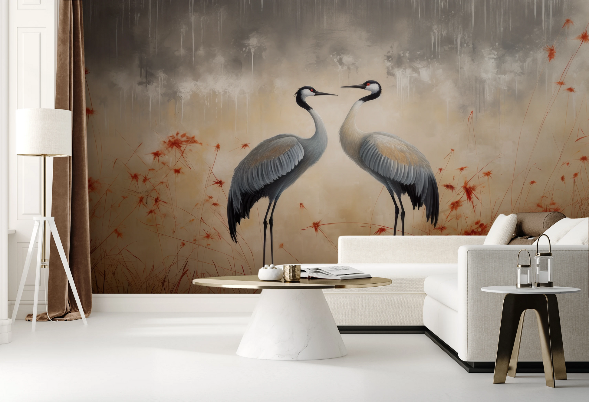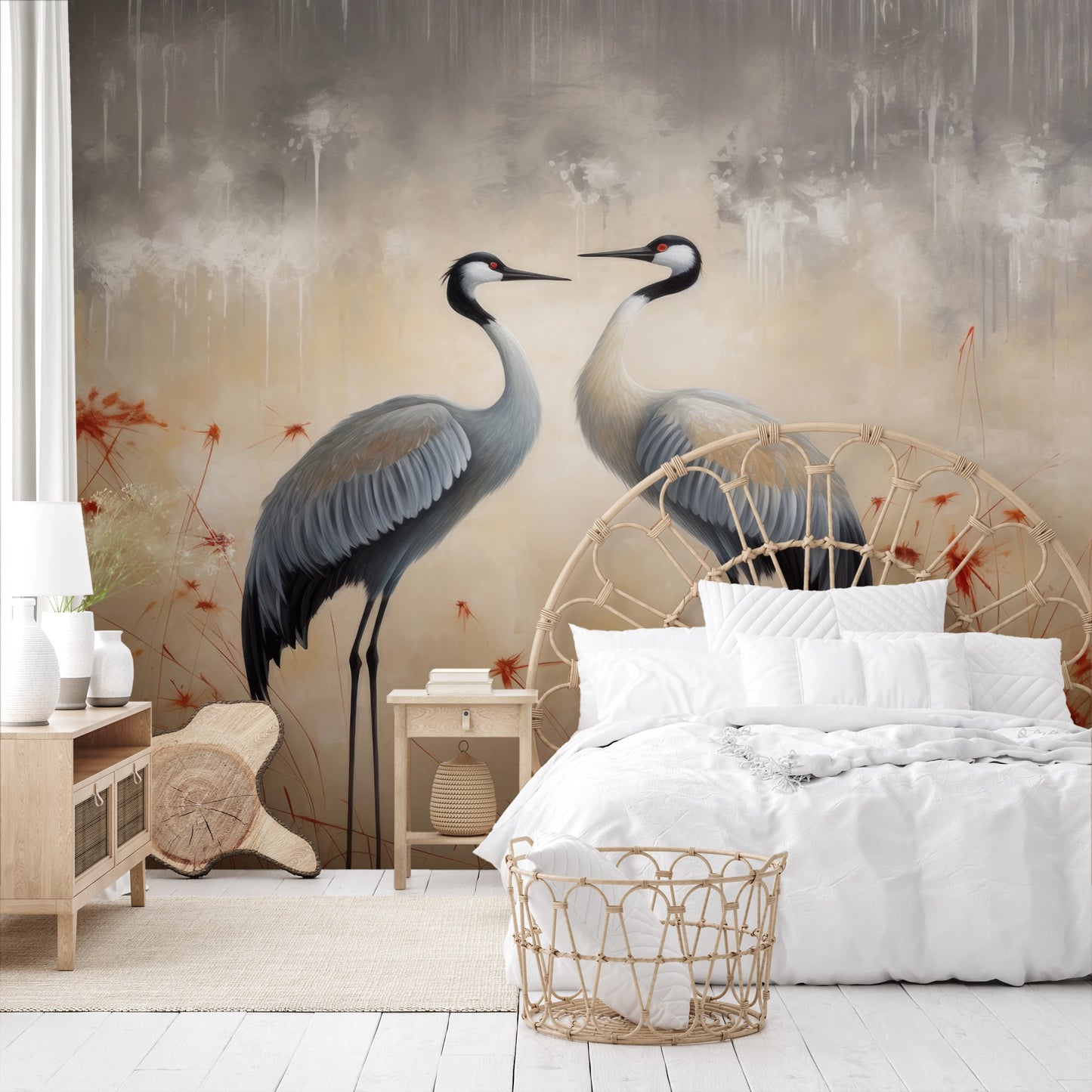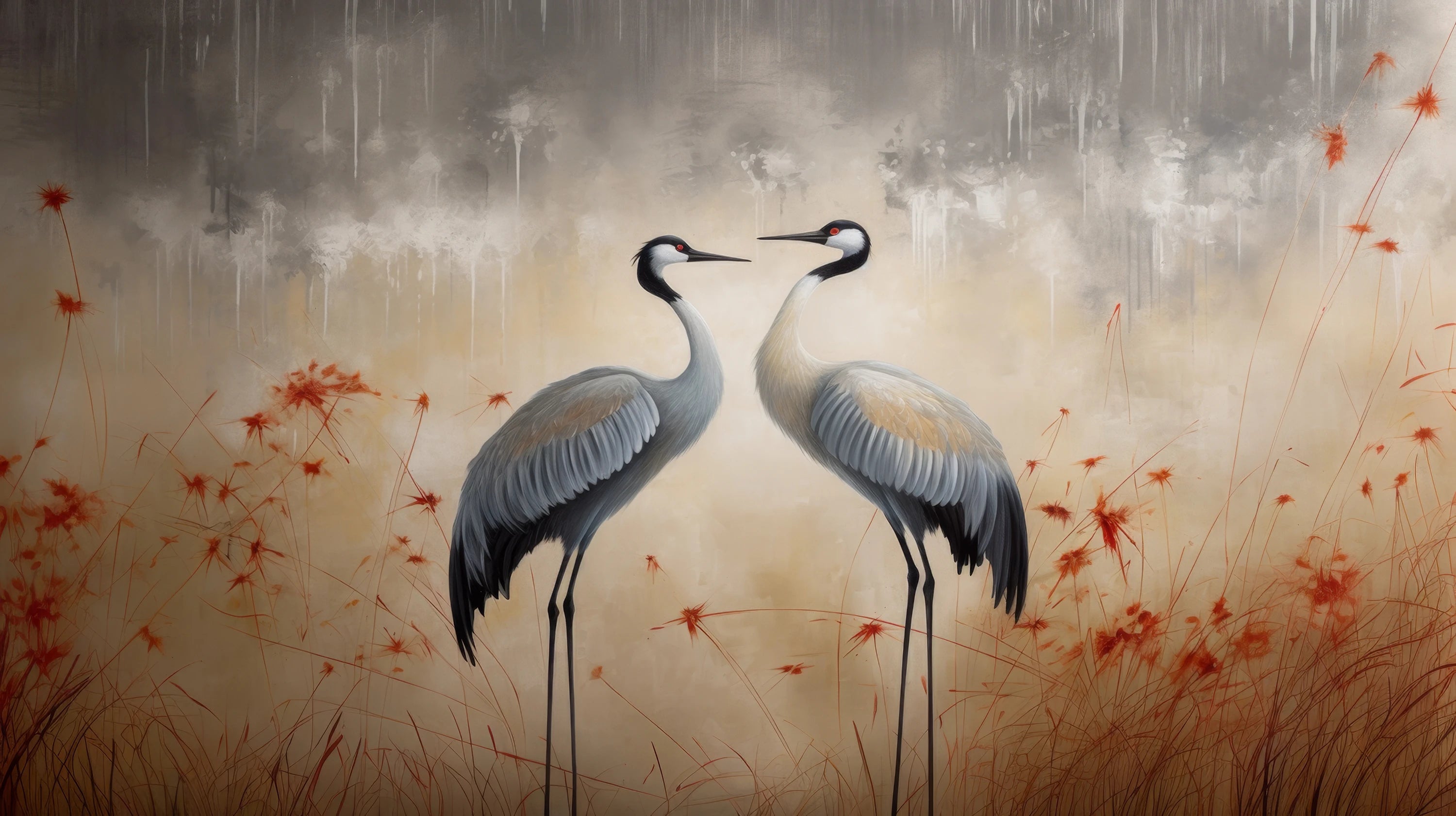 Friedliche Schritte – Kraniche, die zwischen zartem Schilf laufen, mit einem Hintergrund in warmen, ruhigen Grau- und Beigetönen, die ein Gefühl von Frieden und Ruhe vermitteln.
