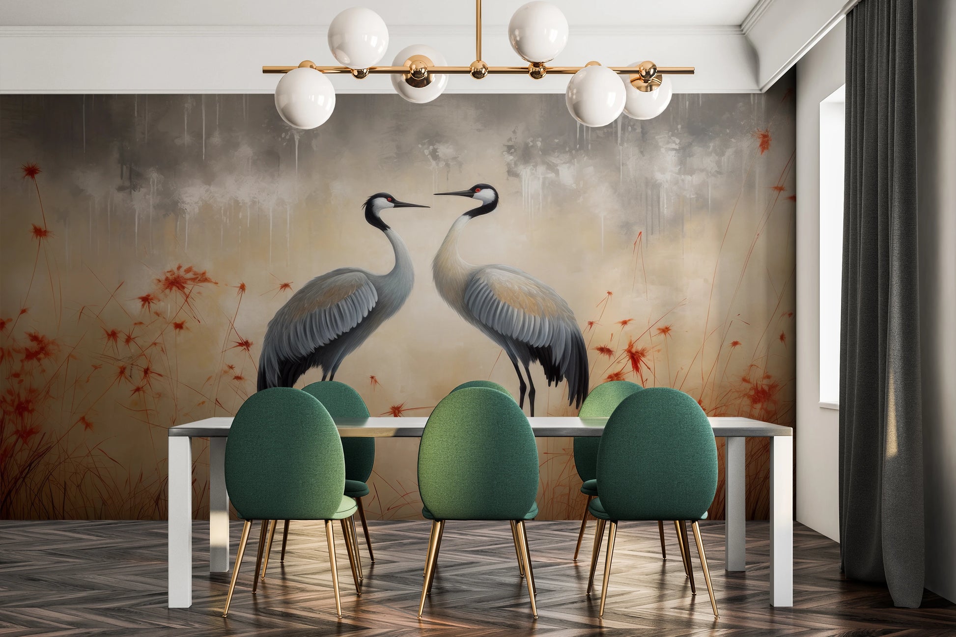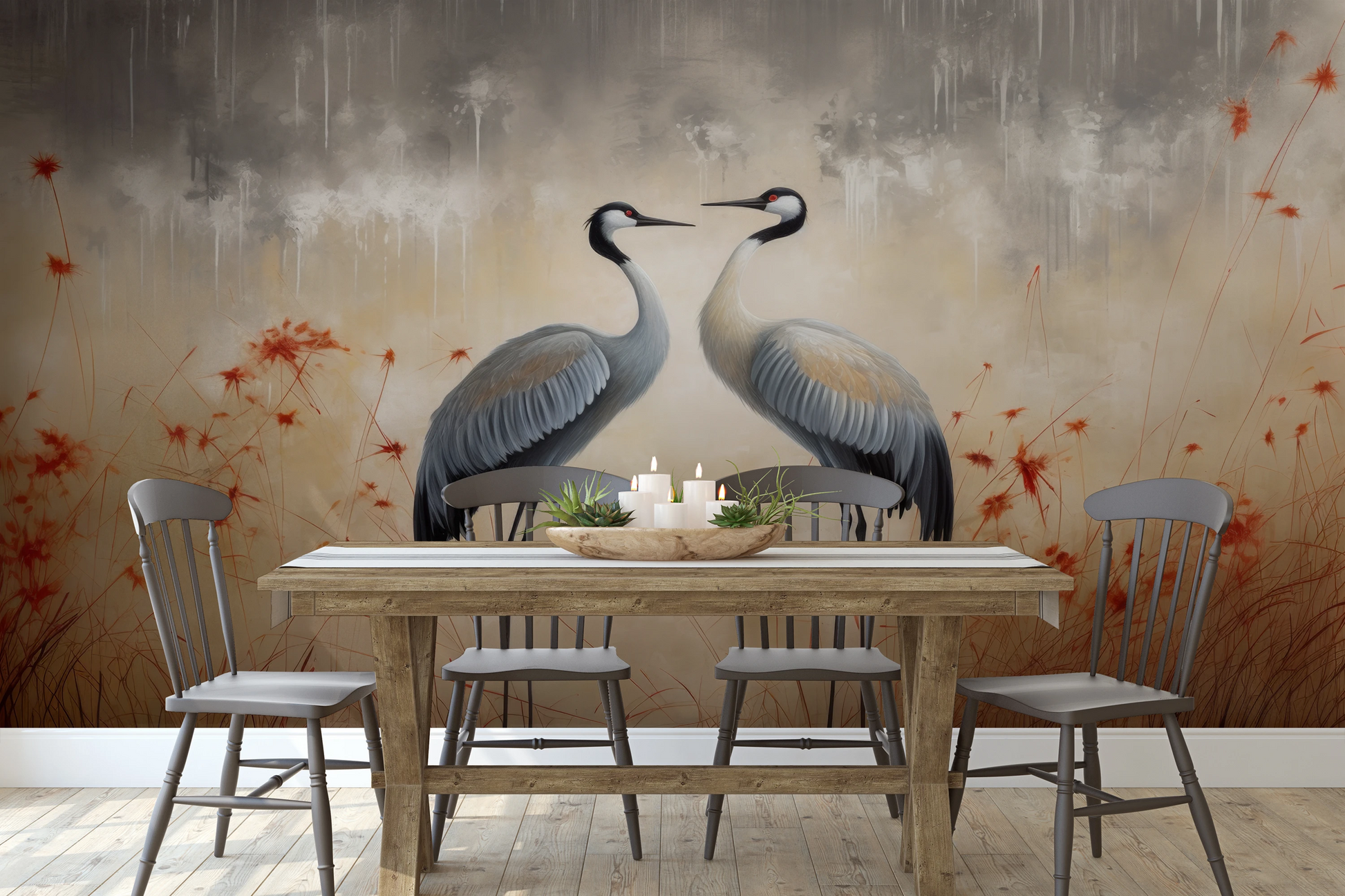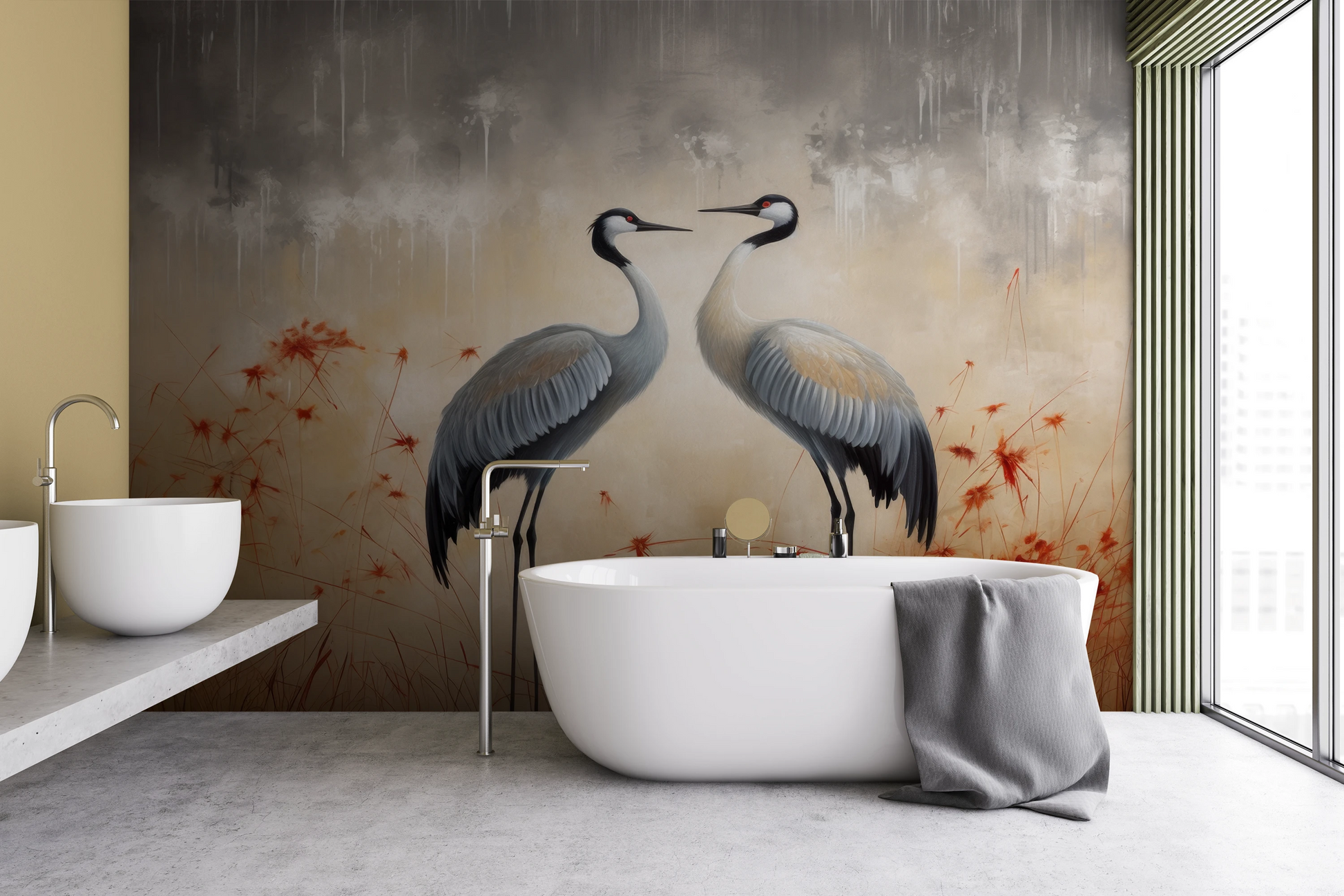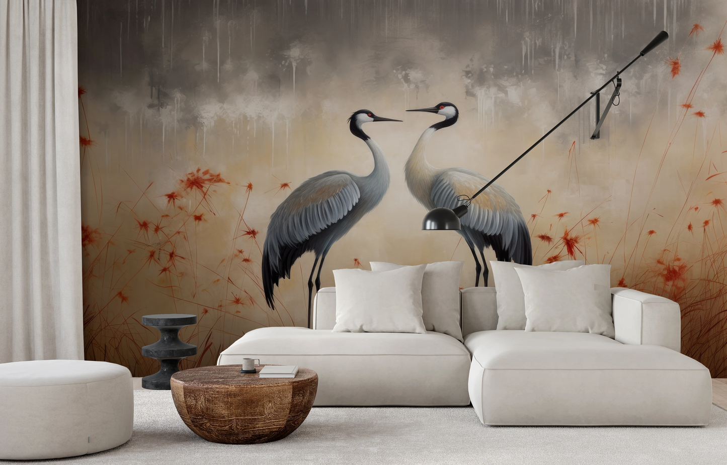 Friedliche Schritte – Kraniche, die zwischen zartem Schilf laufen, mit einem Hintergrund in warmen, ruhigen Grau- und Beigetönen, die ein Gefühl von Frieden und Ruhe vermitteln.