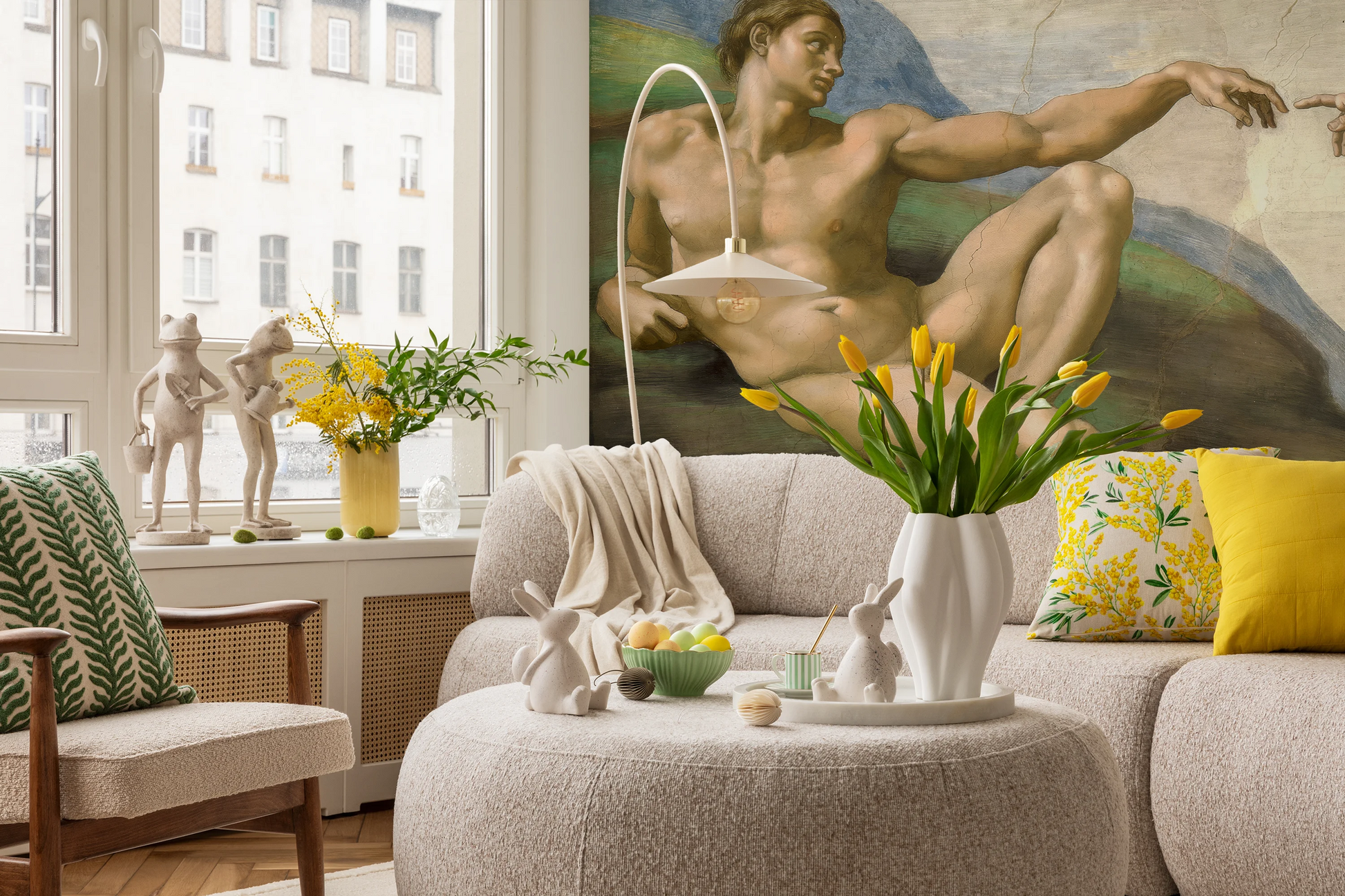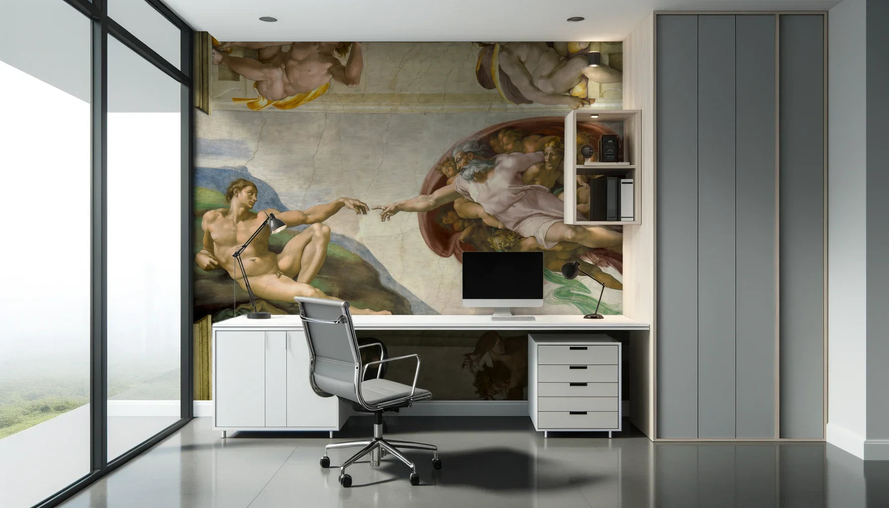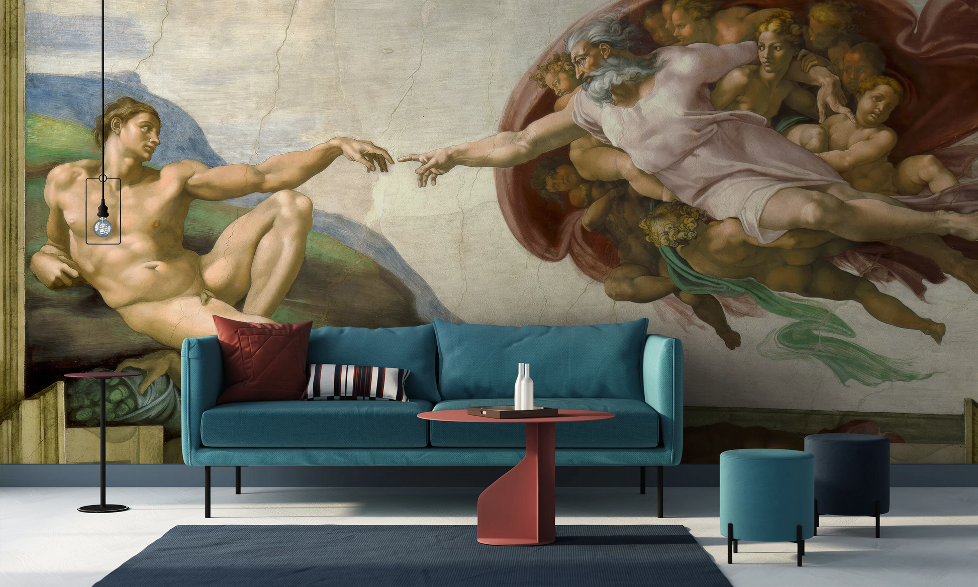The pattern of the photo wallpaper "The Creation of Adam" by Michelangelo stands out not only for its timeless beauty and elegance, but also for the exceptional quality that we have achieved in the Decomura studio. The reproduction of this famous work of Renaissance art was created using the latest digital technologies and the innovative DECOMURA AI system, which allowed us to obtain an astonishing resolution of 32,000 x 21,701 pixels, which gives a total of over 800 megapixels, and this in turn allows the photo wallpaper to be printed in photographic quality in impressive dimensions of over 12 x 7 meters! Thanks to this, the details of the image, such as the expressive features of Adam's face, the dynamic drapery of God's garments or subtle shadows and lights, have been rendered with unprecedented precision.