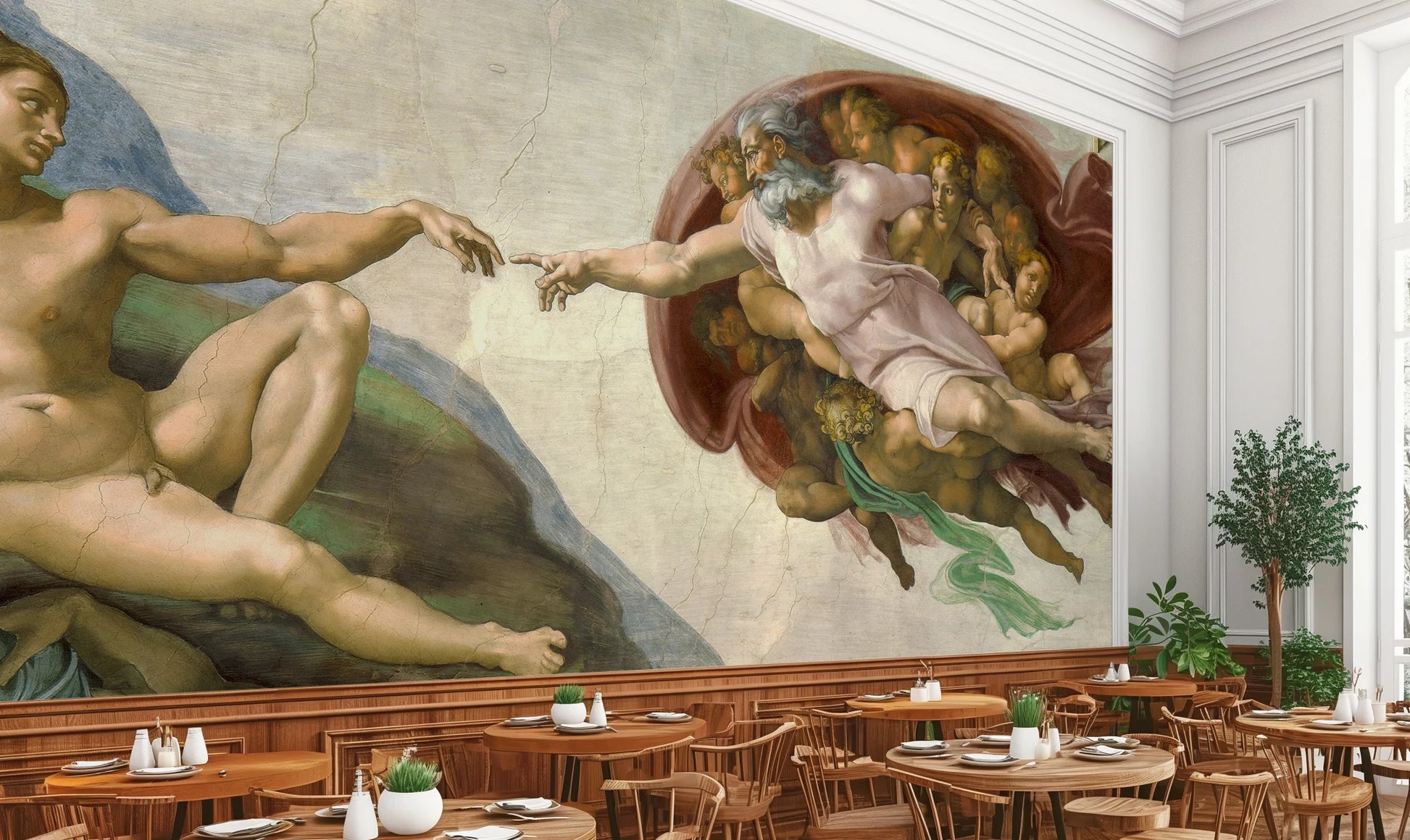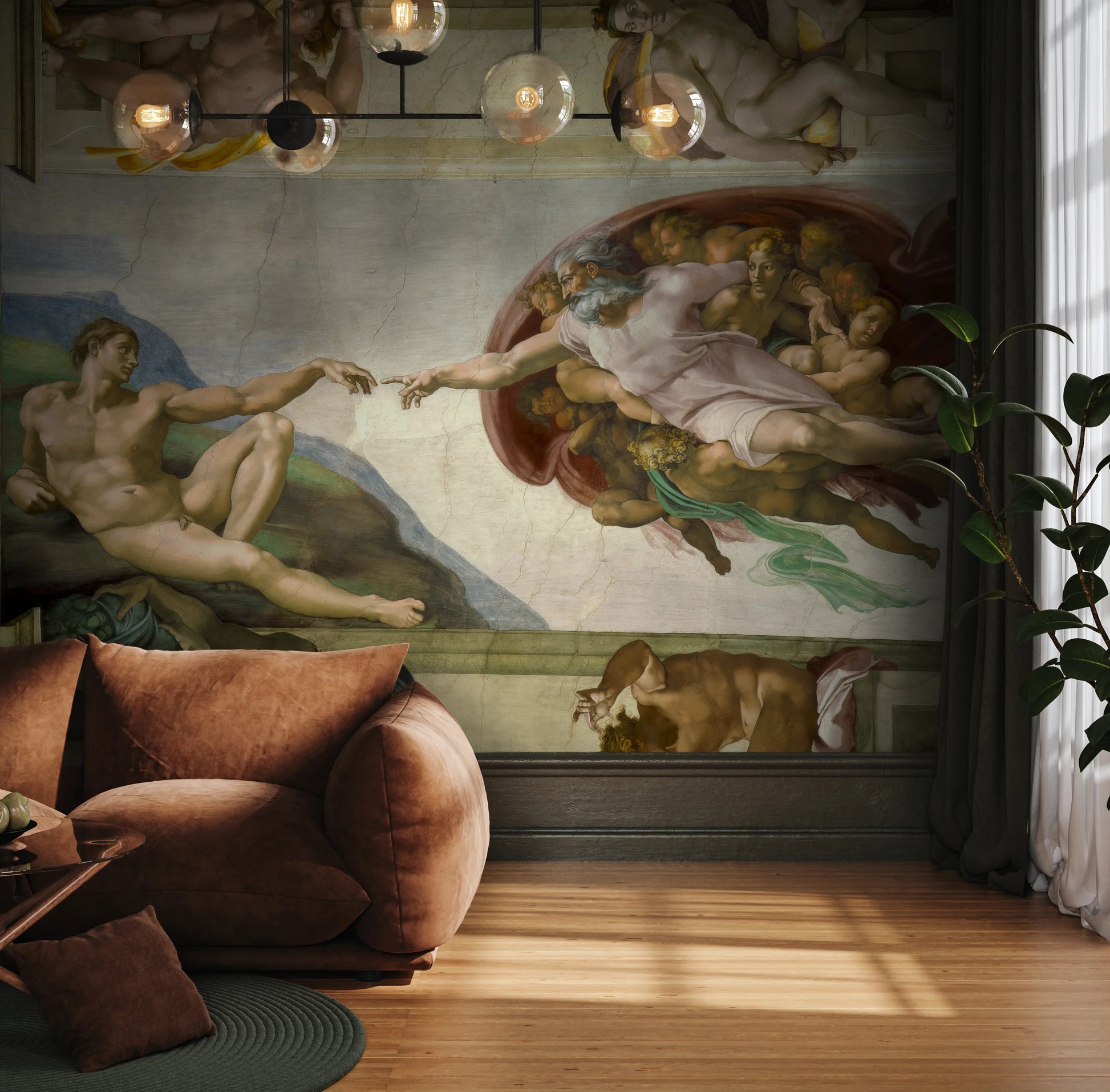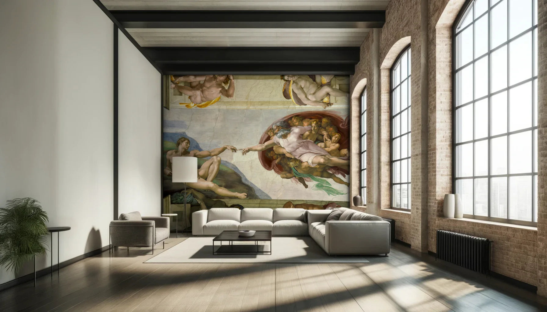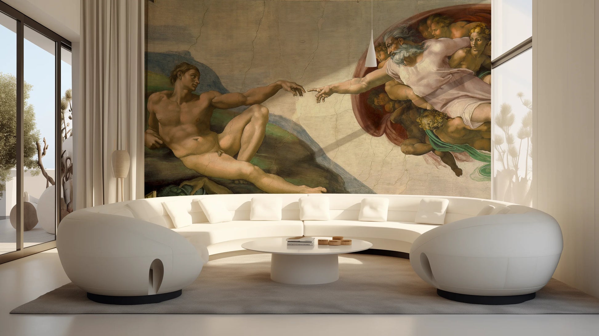 The pattern of the photo wallpaper "The Creation of Adam" by Michelangelo stands out not only for its timeless beauty and elegance, but also for the exceptional quality that we have achieved in the Decomura studio. The reproduction of this famous work of Renaissance art was created using the latest digital technologies and the innovative DECOMURA AI system, which allowed us to obtain an astonishing resolution of 32,000 x 21,701 pixels, which gives a total of over 800 megapixels, and this in turn allows the photo wallpaper to be printed in photographic quality in impressive dimensions of over 12 x 7 meters! Thanks to this, the details of the image, such as the expressive features of Adam's face, the dynamic drapery of God's garments or subtle shadows and lights, have been rendered with unprecedented precision.