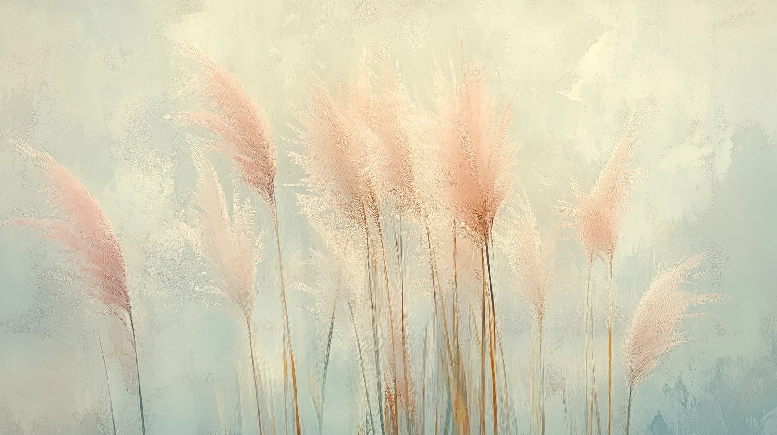 Subtelna gra światła i koloru splata się w tej artystycznej kompozycji, gdzie zwiewne trzciny tańczą na tle mlecznego nieba. Każde źdźbło, muśnięte delikatnym różem, zdaje się unosić w powietrzu niczym marzenie zapisane pastelową kredką na płótnie poranka. Ta fototapeta to prawdziwe dzieło sztuki, które wprowadza do wnętrza niezwykłą lekkość i spokój. Artystyczna precyzja widoczna jest w każdym detalu - od subtelnych przejść tonalnych tła, poprzez mistrzowsko uchwycone, zwiewne trzciny w odcieniach pudrowego różu. Kompozycja zachwyca swoją przestrzennością i głębią, gdzie poszczególne elementy zdają się być zatrzymane w czasie, tworząc wrażenie trójwymiarowości. Stonowana paleta barw, łącząca delikatne szarości z ciepłymi, różowymi akcentami, sprawia, że tapeta doskonale komponuje się z różnorodnymi stylami wnętrzarskimi. Ta grafika ścienna idealnie sprawdzi się w sypialni, gdzie stworzy atmosferę sprzyjającą relaksowi i wyciszeniu. Równie pięknie zaprezentuje się w eleganckim salonie czy romantycznej garderobie. Wybierając ten mural artystyczny, inwestujesz w autentyczne dzieło sztuki, które przemieni Twoją przestrzeń w harmonijną oazę spokoju. Delikatność wzoru w połączeniu z jego wyrafinowaną kompozycją sprawia, że ściana staje się naturalnym przedłużeniem wnętrza, wprowadzając do niego pierwiastek poetyckiej elegancji.