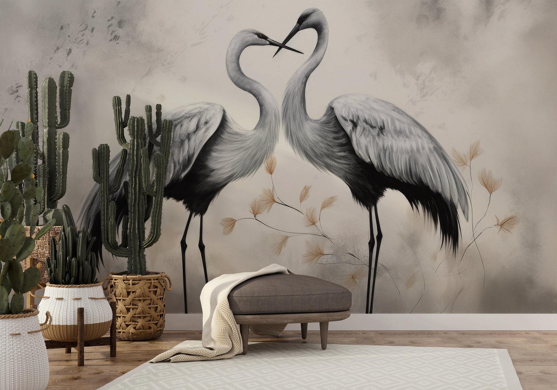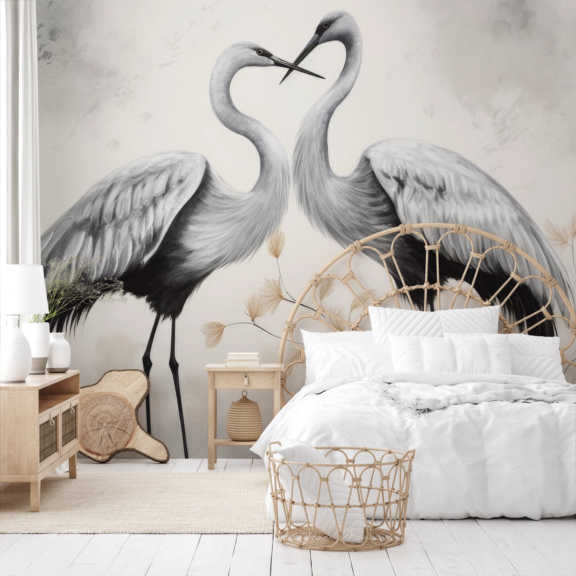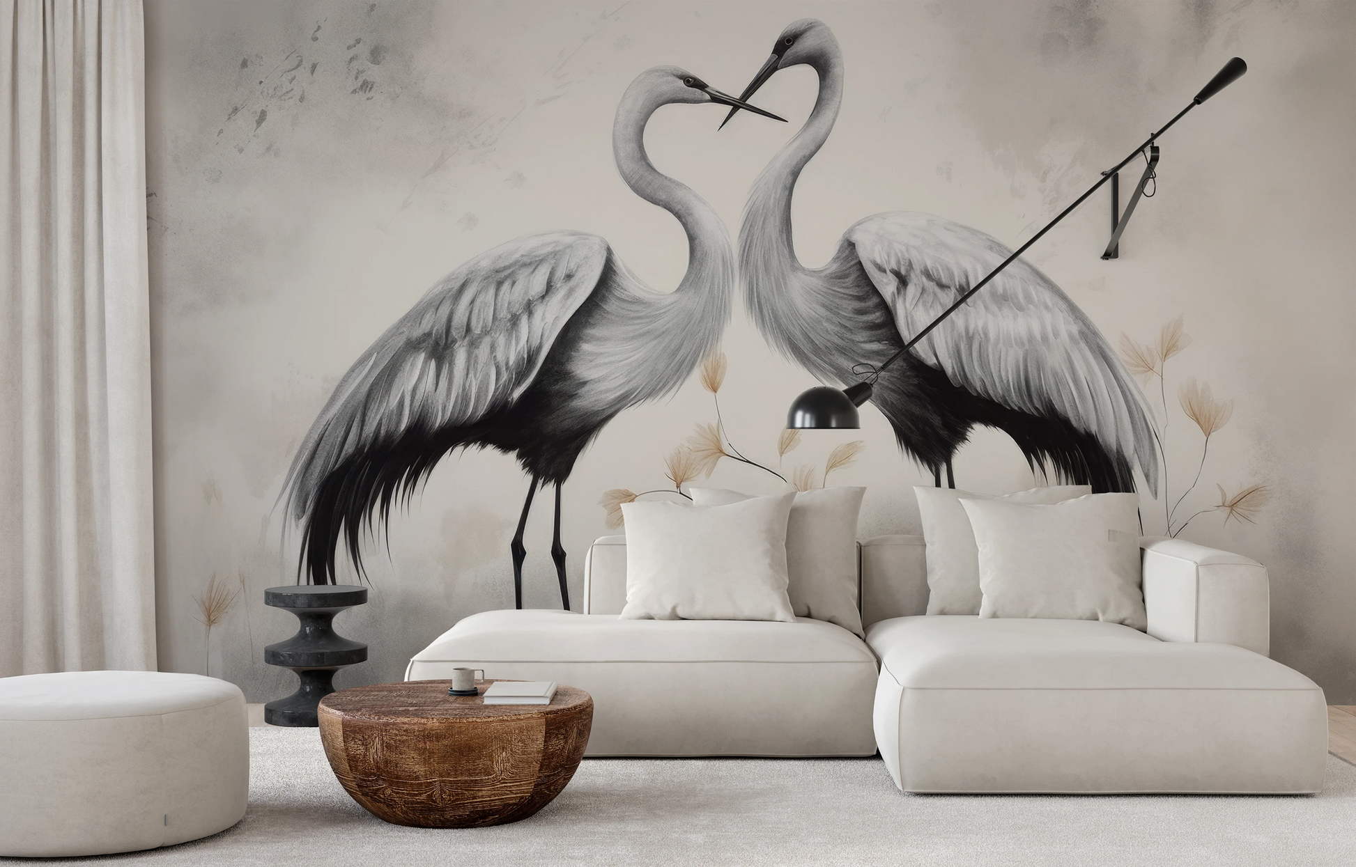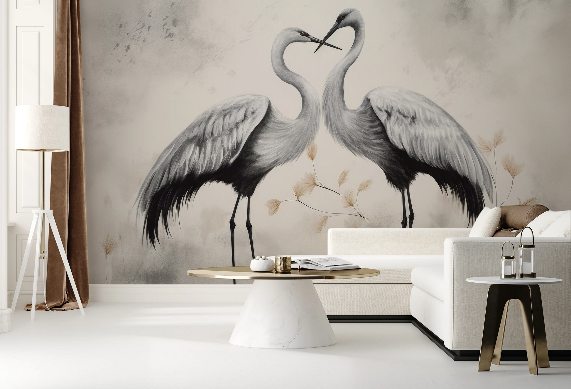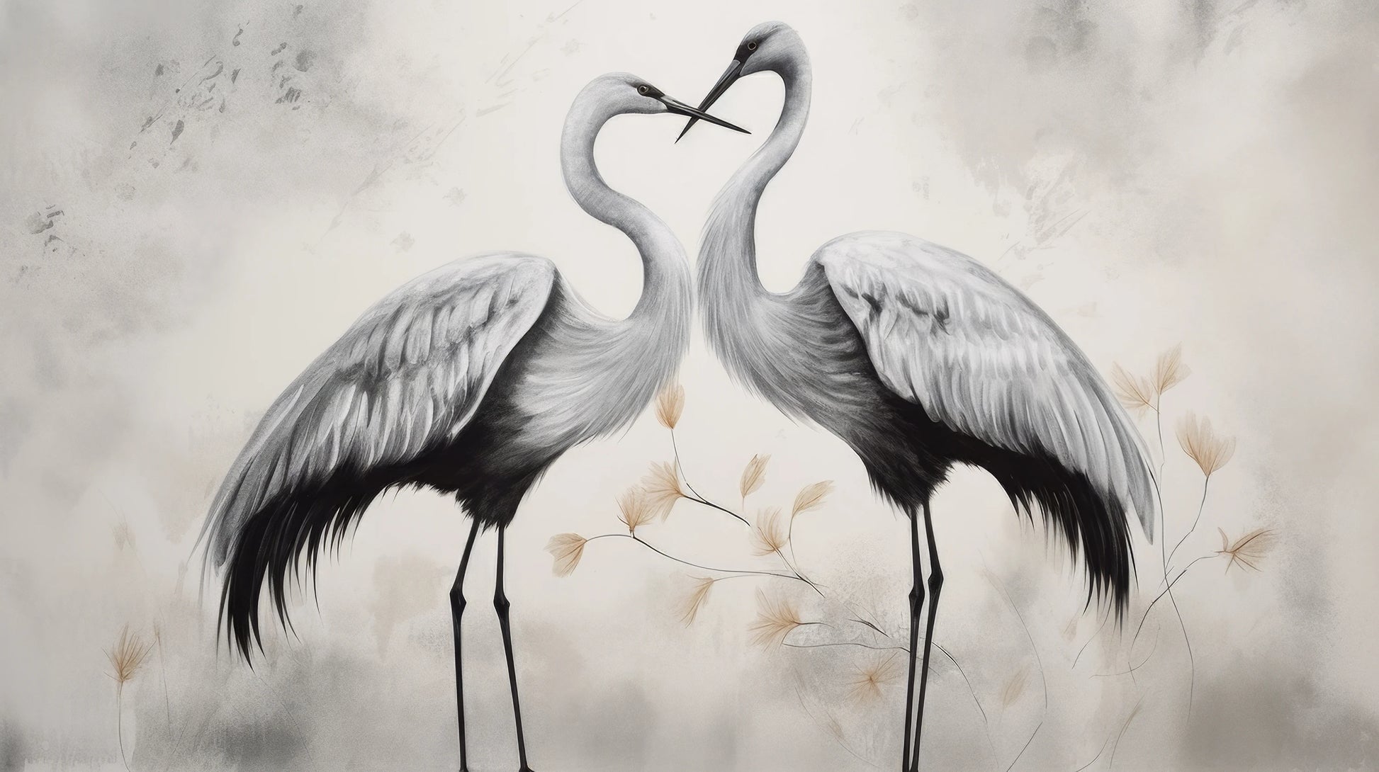 Harmonious Whisper - Delicate cranes that seem to whisper to each other, on a beige background with subtly outlined flowers, convey an atmosphere of peace and tranquility.