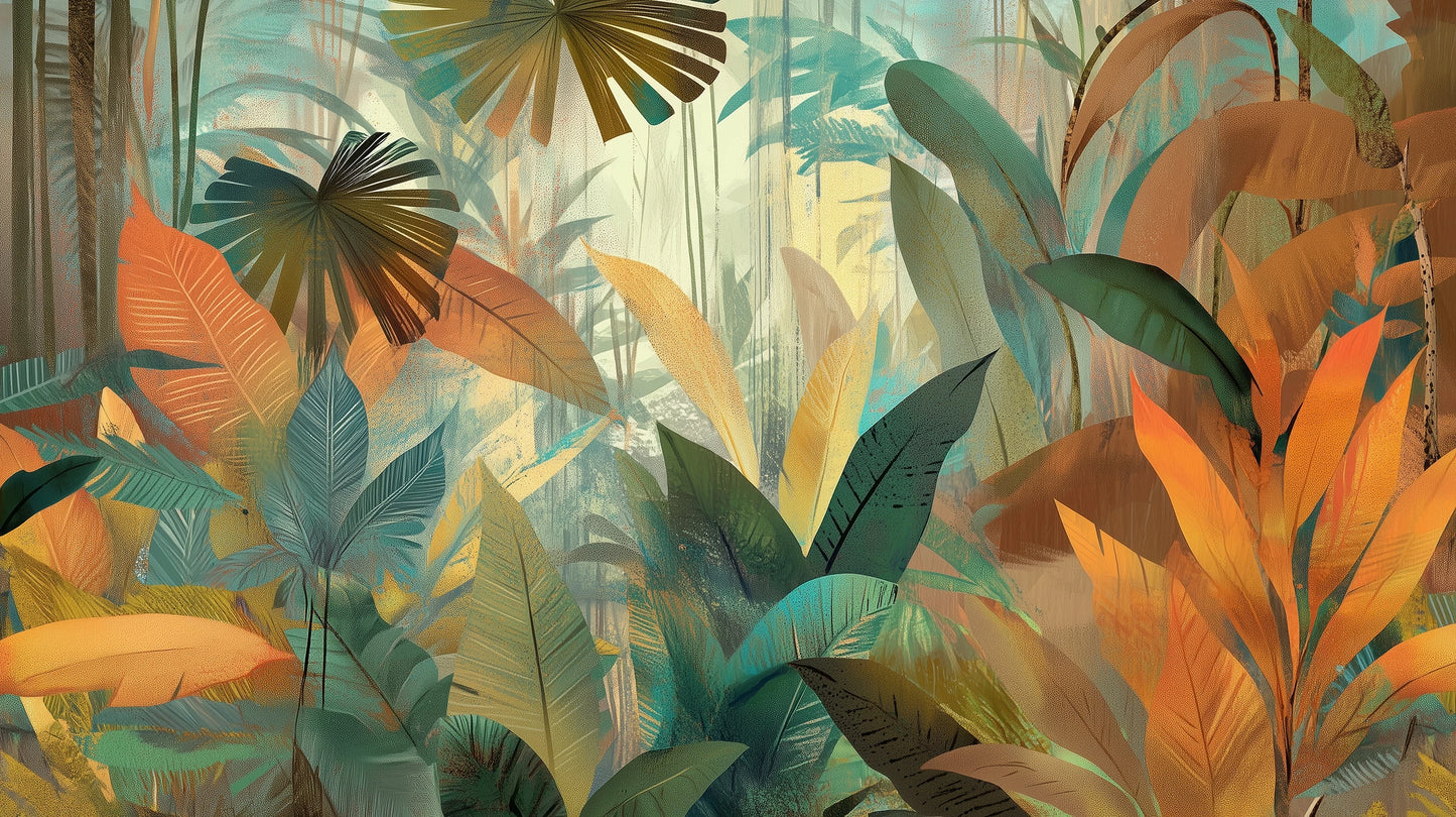 In the thicket of artistic vision, a dance of light and shadow intertwines, where soft golden rays penetrate exotic palm and monstera leaves. This mesmerizing composition brings the magic of a tropical twilight to the interior, where each element tells its own story in the language of color and shape. This wallpaper combines the richness of nature with a modern artistic interpretation. The dominant palette of warm orange and ochre harmoniously interacts with deep shades of turquoise and green, creating a multidimensional composition brimming with life. The meticulous craftsmanship of each element—from the delicately blurred outlines of the leaves to the subtle tonal transitions—gives the entire piece a painterly touch. This wallpaper is ideal for a spacious living room, where it will become a central decorative element, but it will also look equally impressive in a bedroom or study, where it will introduce an atmosphere of tranquil luxury. By choosing this wallpaper, you are choosing a unique wallpaper that will transform the space into a gallery of contemporary design. An abstract take on tropical motifs, combined with artistic blurring and layered elements, creates a composition that not only catches the eye but also stimulates the imagination. Perfect for those who appreciate unconventional color combinations and seek a balance between nature and art in their interiors.