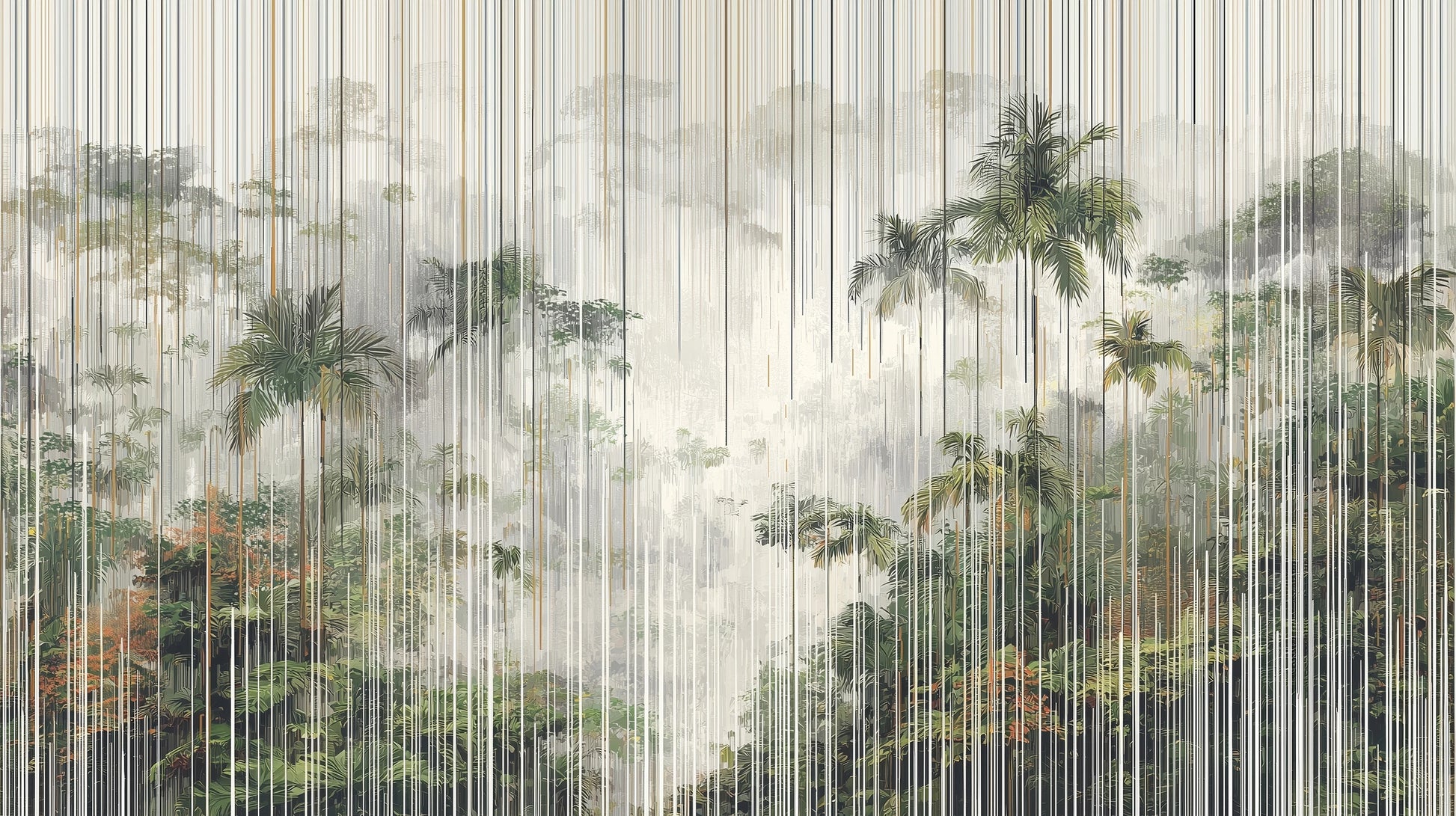 Delicate vertical lines float through the thick tropical fog, cutting through the space like raindrops, creating an attractive composition. The mystical jungle scenery with majestic palm trees emerges from behind a delicate, graphic curtain, introducing an element of mystery and depth to the interior. This wallpaper combines the natural beauty of the tropical landscape with a modern artistic interpretation. Vertical lines, reminiscent of delicate streaks of light, lend the composition a dynamic character and create a sense of height. A subdued color palette dominated by shades of green, gray, and white, brings peace and harmony to the interior. The meticulous craftsmanship of each element—from subtle tonal transitions to the intricately outlined silhouettes of coconut palms immersed in mist—is ideal for modern living rooms, elegant bedrooms, or office spaces. Here, we aim to create an atmosphere of peace and contemplation. The wallpaper soothes the senses while intriguing with its geometric structure of overlapping lines. It's more than just decoration—it's a way to transform an ordinary wall into a fascinating story of a tropical jungle framed by contemporary design. A unique composition combining the organic shapes of nature with geometric lines makes choosing a unique wall mural a truly unique experience. This wallpaper will not only transform the character of a room but also become a starting point for creating a sophisticated interior design. Here, nature meets modernity.