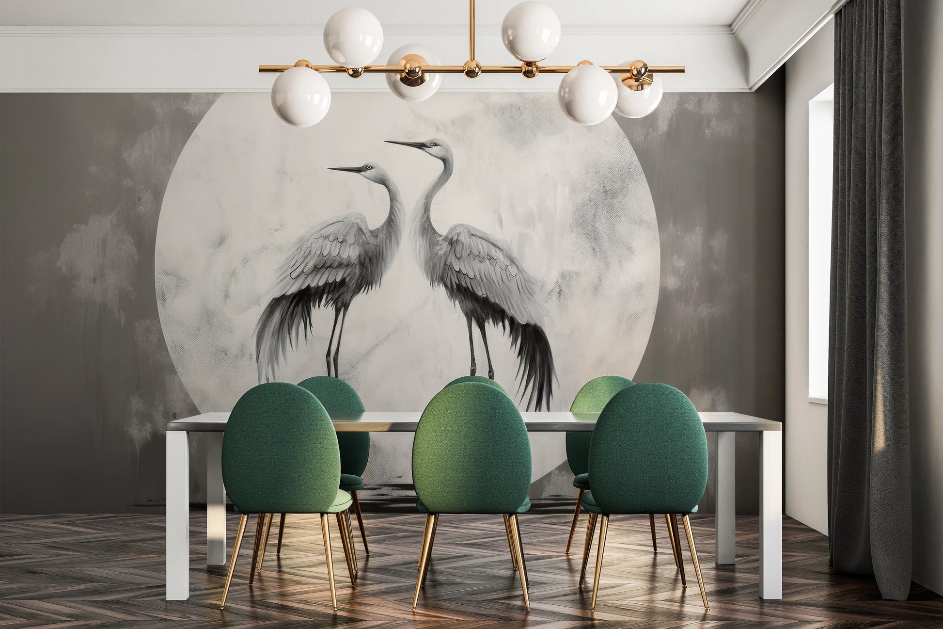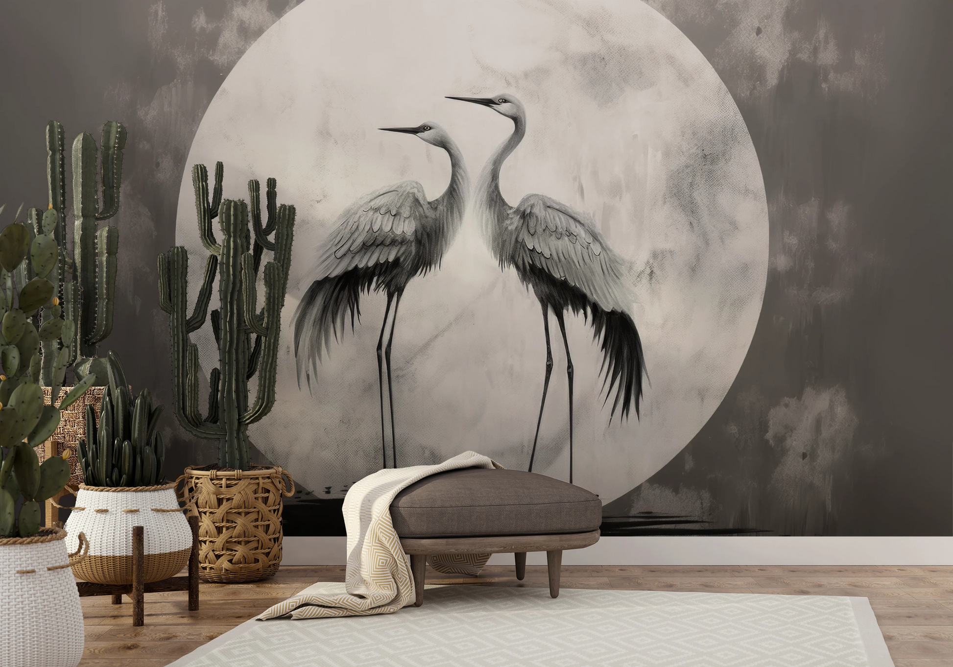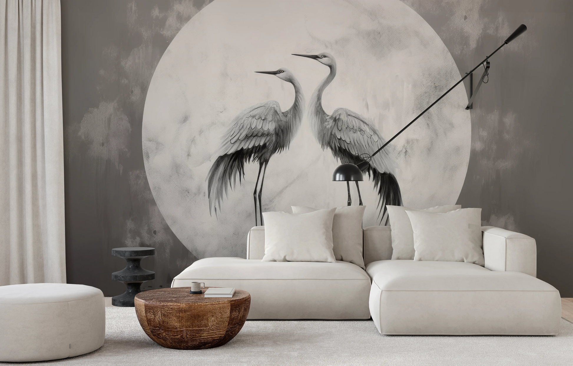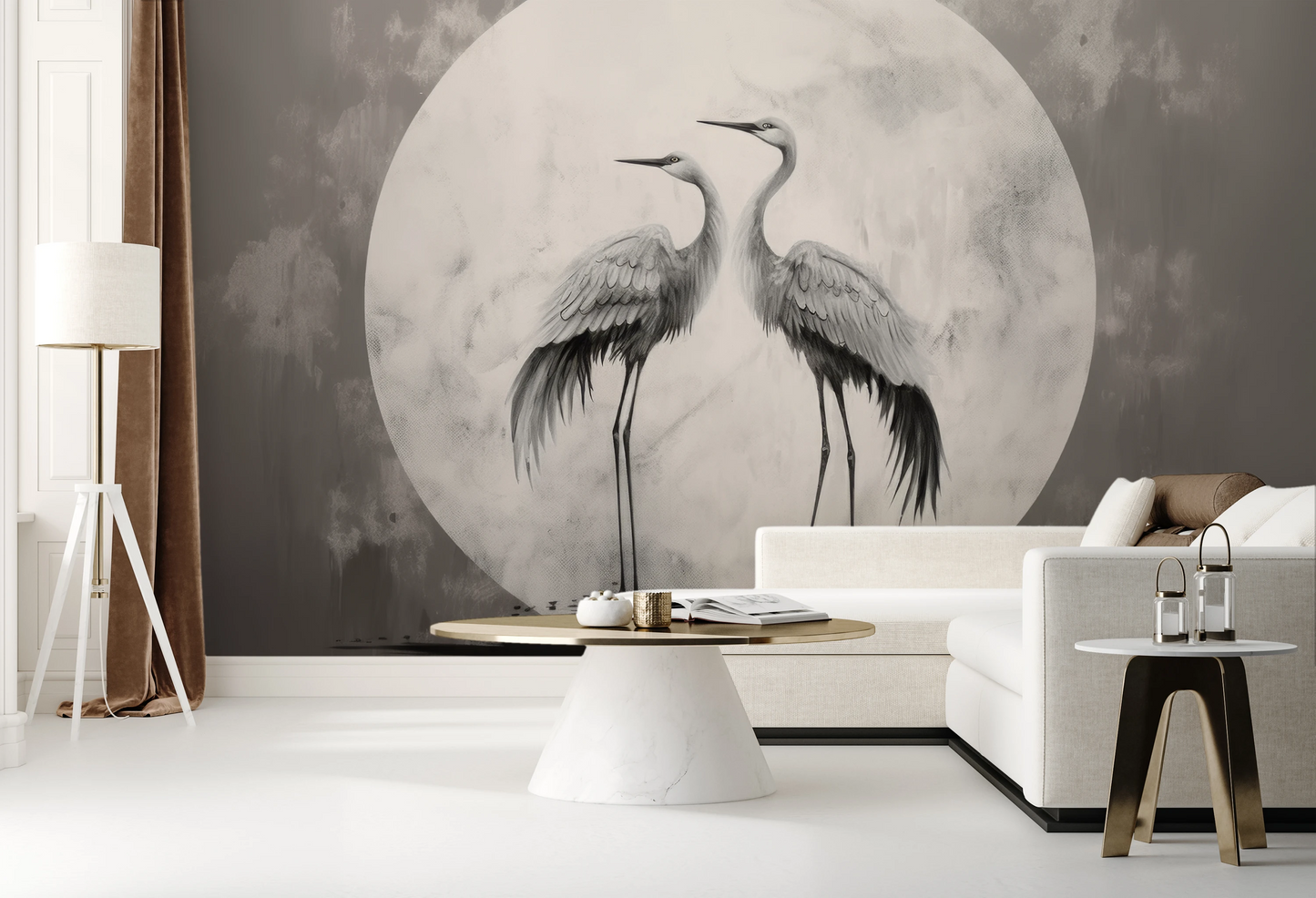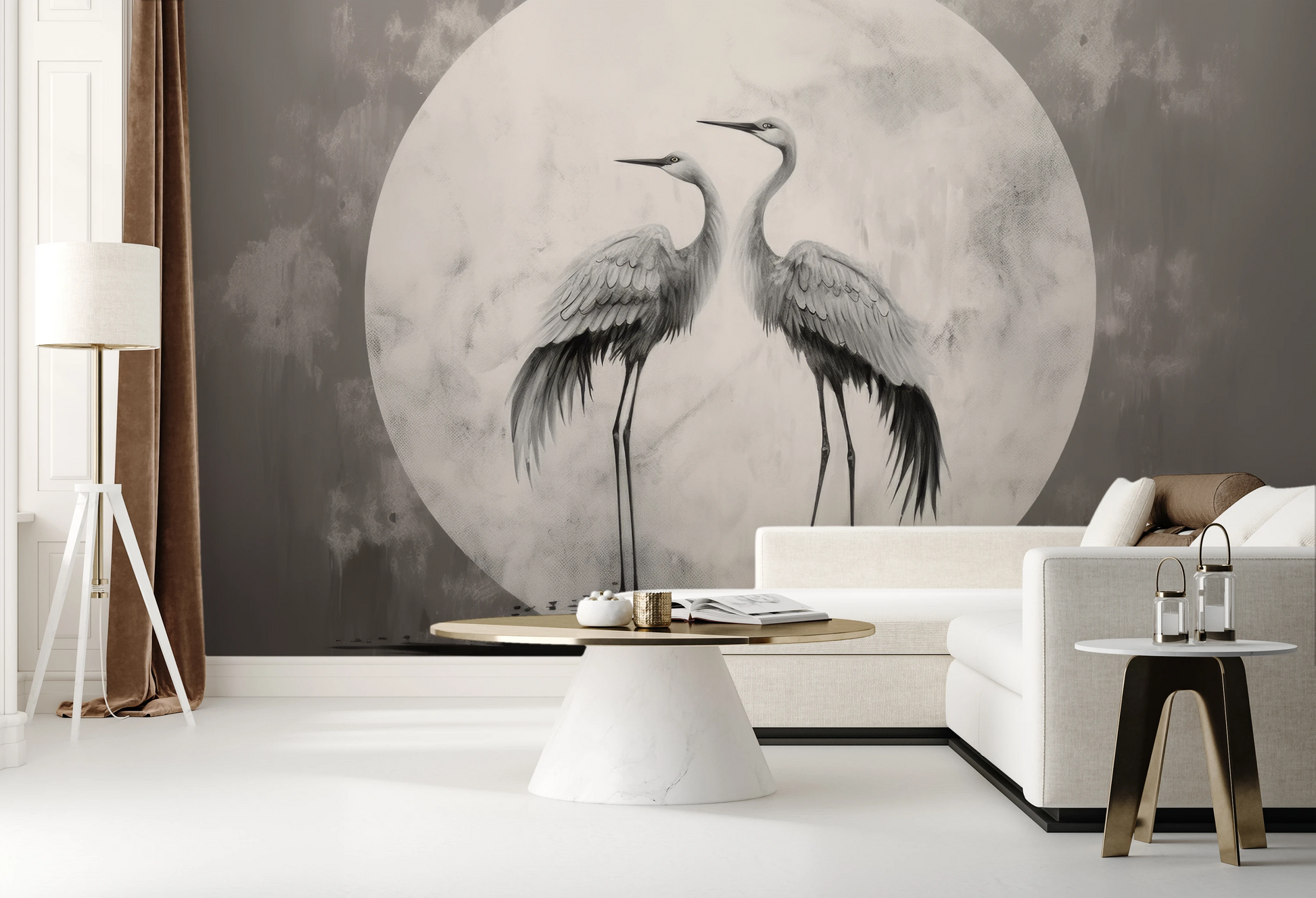 Grace of the Moon Night - Cranes standing against the background of the full moon, the glow of which casts a mysterious light on them. This wallpaper is a combination of classic and modern, perfect for interiors with character.