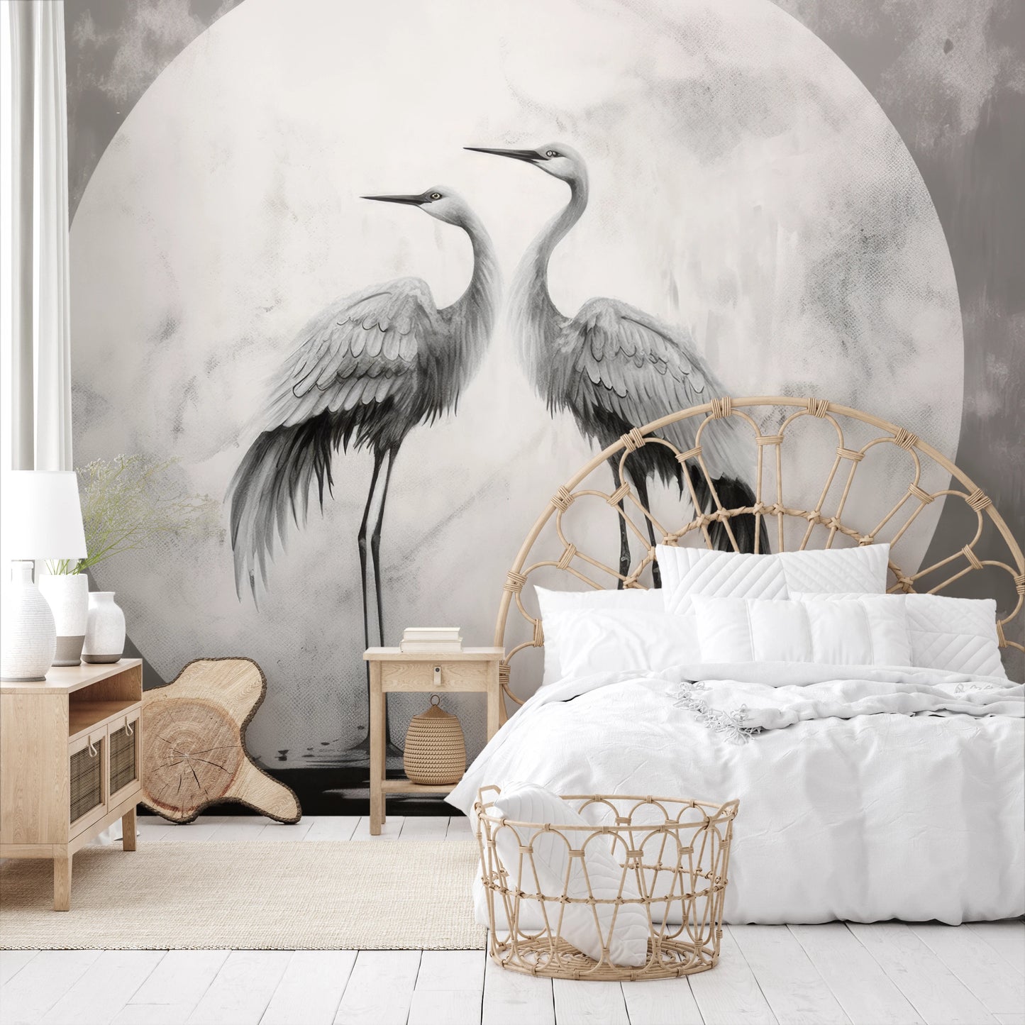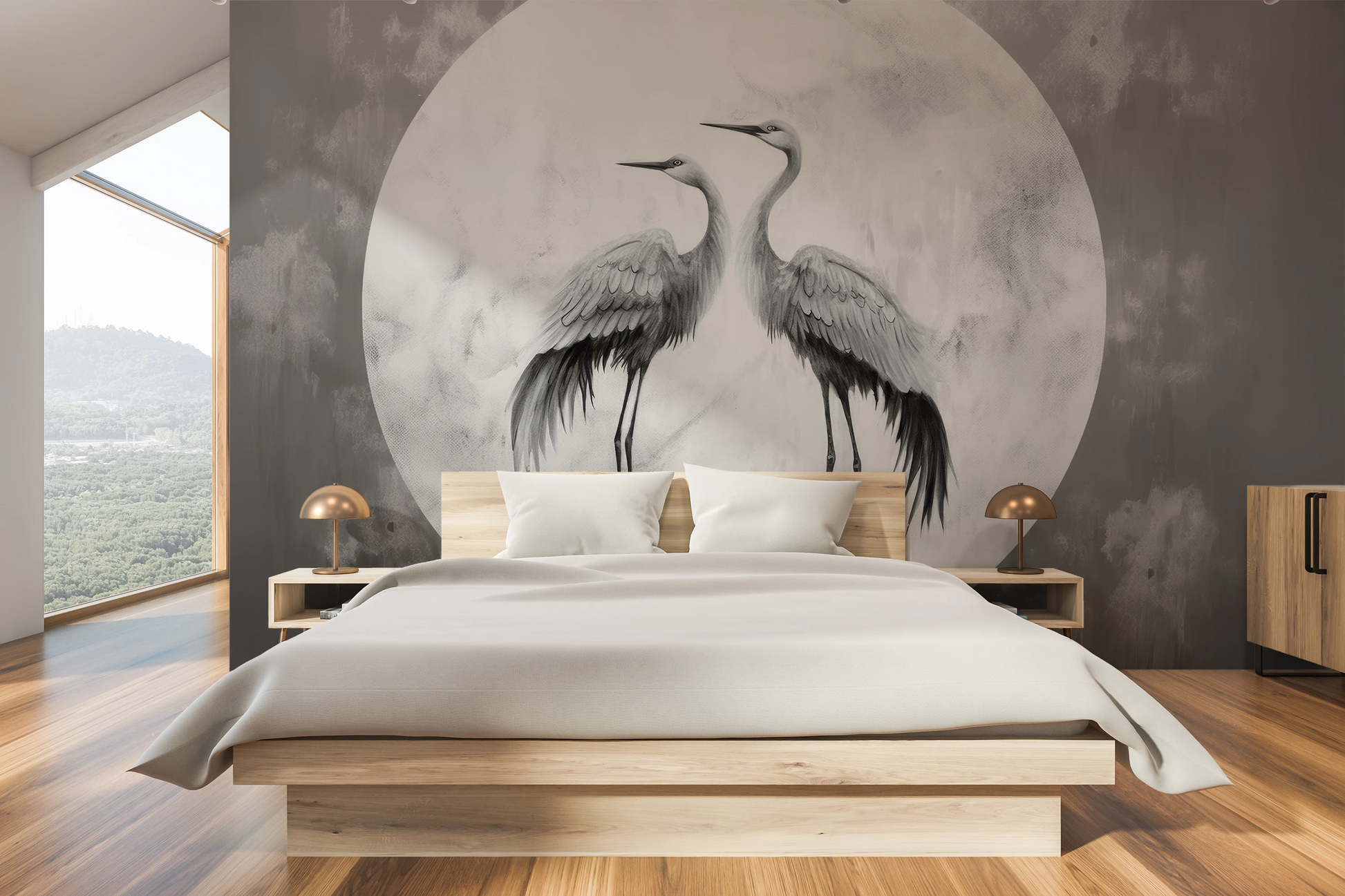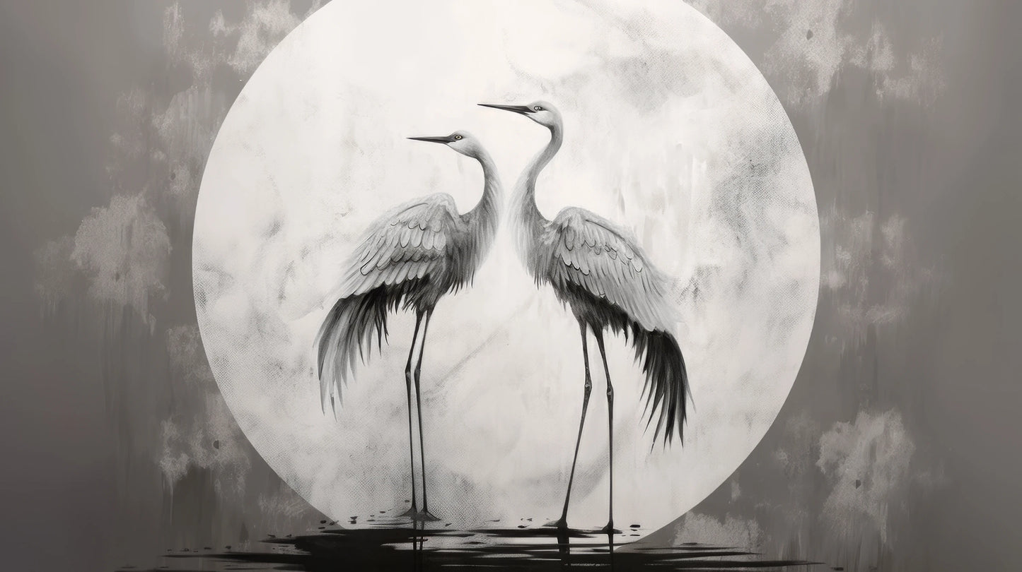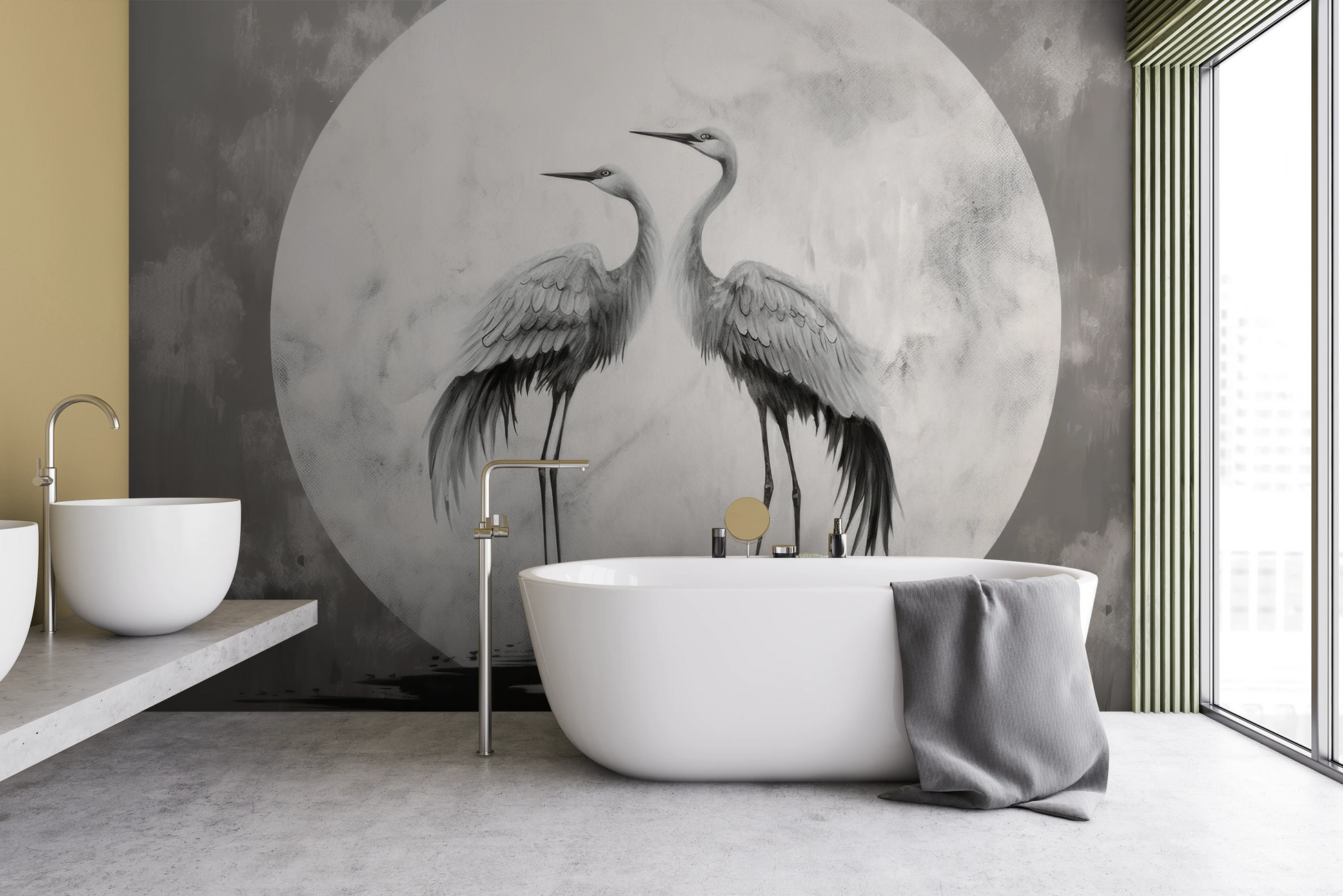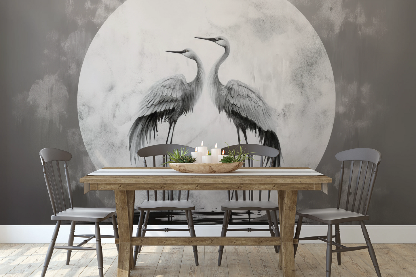 Grace of the Moon Night - Cranes standing against the background of the full moon, the glow of which casts a mysterious light on them. This wallpaper is a combination of classic and modern, perfect for interiors with character.