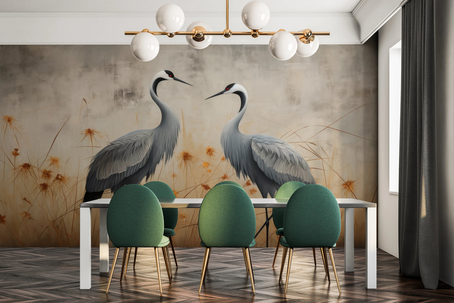 Golden Duet - elegant crane wallpaper in warm zen colors