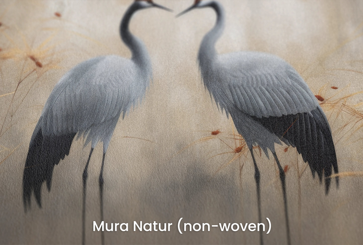 A majestic pair of cranes in a delicate mist brings an atmosphere of Japanese Zen and meditative peace to the interior. This unique crane wallpaper depicts the birds in a moment of contemplation, surrounded by golden grasses and the misty glow of dusk. The subdued palette of gray, beige, and delicate gold creates a composition rich in symbolism—cranes have for centuries represented longevity, happiness, and fidelity in Japanese culture. A pair of birds standing in the water, heads turned toward each other, emphasizes their monogamous nature and deep attachment. The Twilight Serenity crane wallpaper is more than just a decoration—it tells a story of harmony, peace, and the beauty of nature, bringing meditative silence to the space. The misty twilight, the delicate contours of trees in the background, and the golden grass create a multi-layered composition that mesmerizes and soothes. It's a design for those seeking a balance between elegance and naturalness, between symbolism and aesthetics.