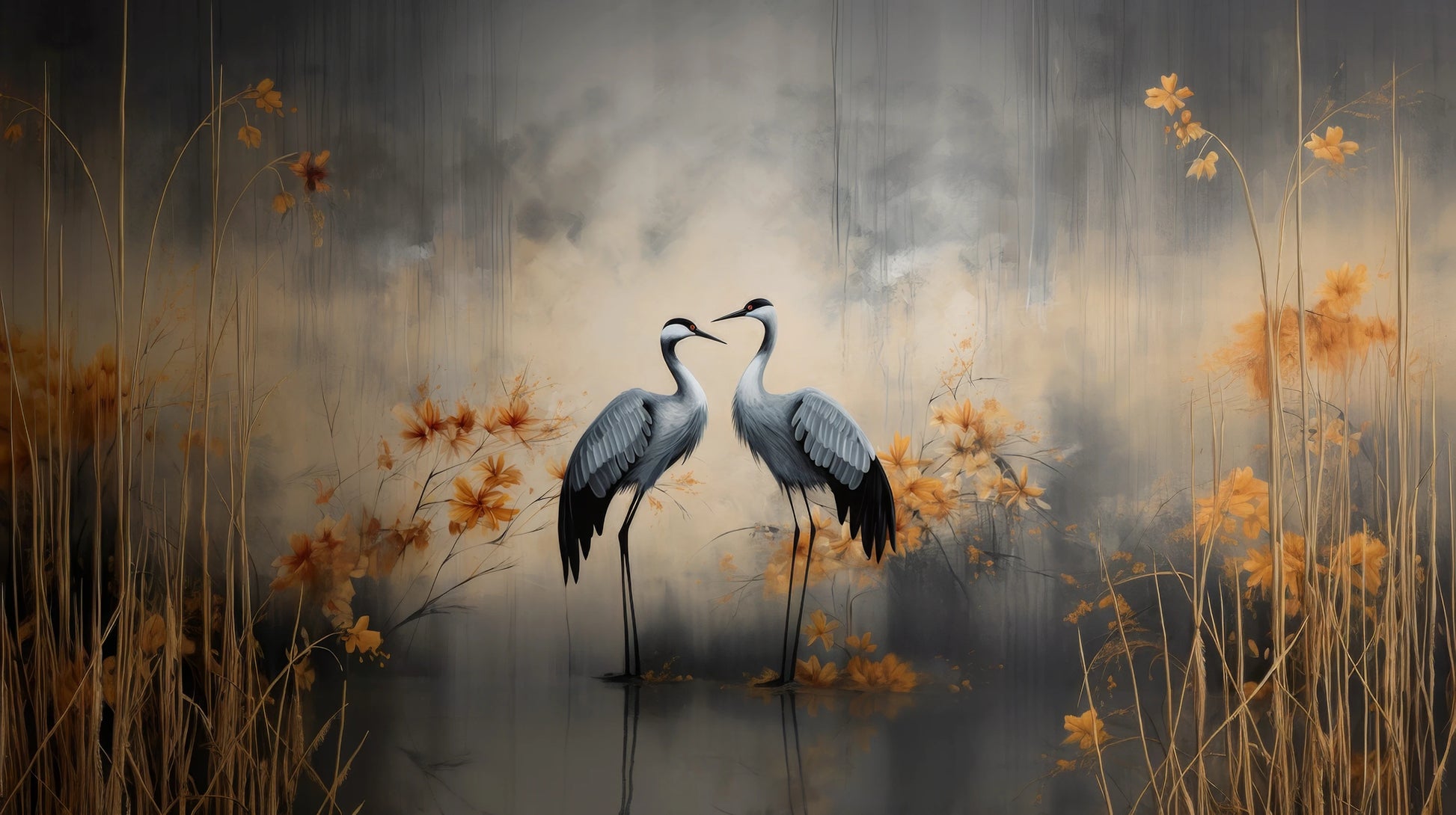 Kolekcja ta jest wizualnym hołdem dla majestatycznych żurawi, które są często uważane za symbol szczęścia i długowieczności w wielu kulturach, zwłaszcza w Azji. Prace artystyczne łączą w sobie subtelną elegancję i spokój, co czyni je idealnym wyborem dla wnętrz poszukujących odrobiny spokoju i harmonii. Obrazy przedstawiają żurawie w różnych pozach i ustawieniach, od pojedynczych, skupionych postaci po pary w delikatnym, prawie tanecznym ułożeniu.