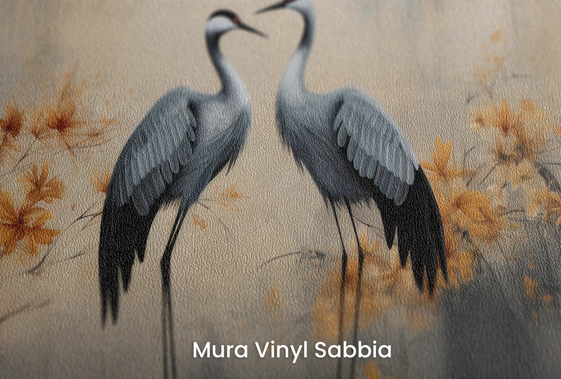 Szept Jesieni - Żurawie w spokojnym lesie jesienią, z tłem pełnym złotych i pomarańczowych odcieni, przynoszące uczucie spokoju i zmiany sezonów.