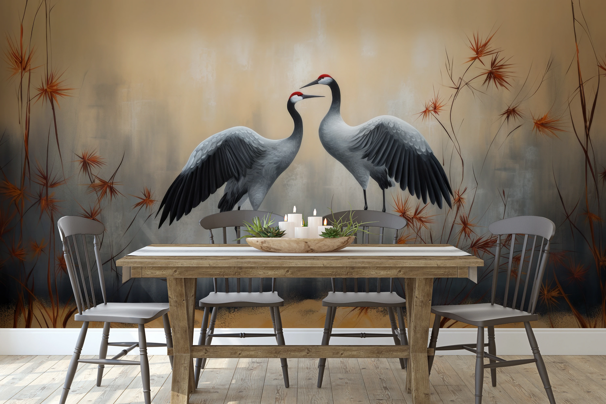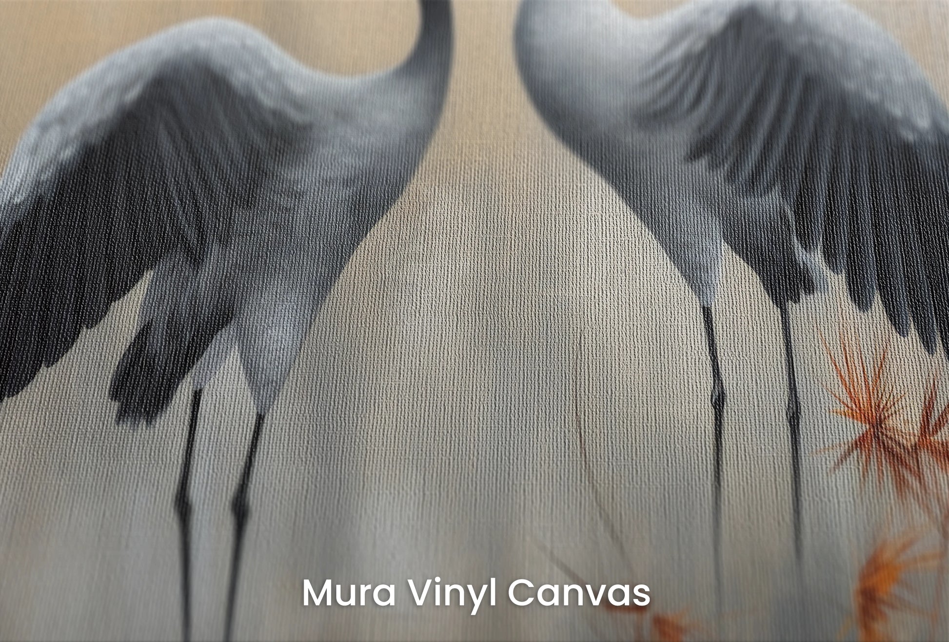 Duet o Zmierzchu - Żurawie w harmonijnym duecie na tle zachodzącego słońca, z subtelnymi nutami spokoju i intymności, idealne do romantycznych wnętrz.