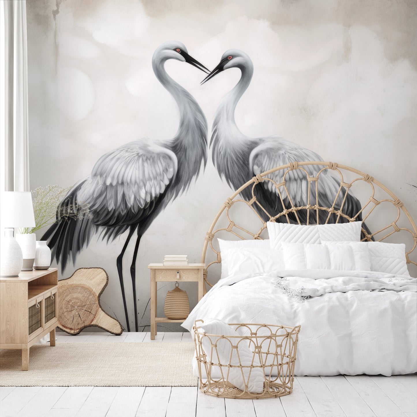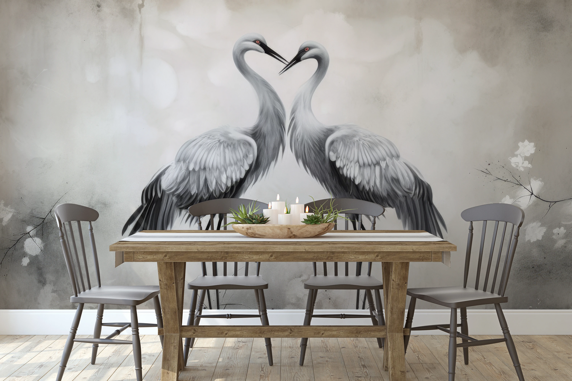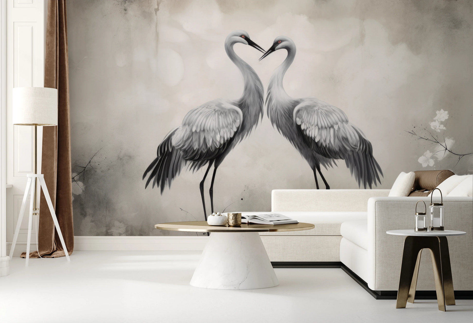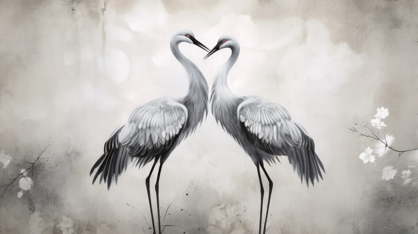 Delikatny Uścisk - Żurawie w delikatnym uścisku, otoczone lekką mgiełką i kwiatami, emanują atmosferę ciepła i spokoju. Tapeta ta wnosi do wnętrza uczucie harmonii.