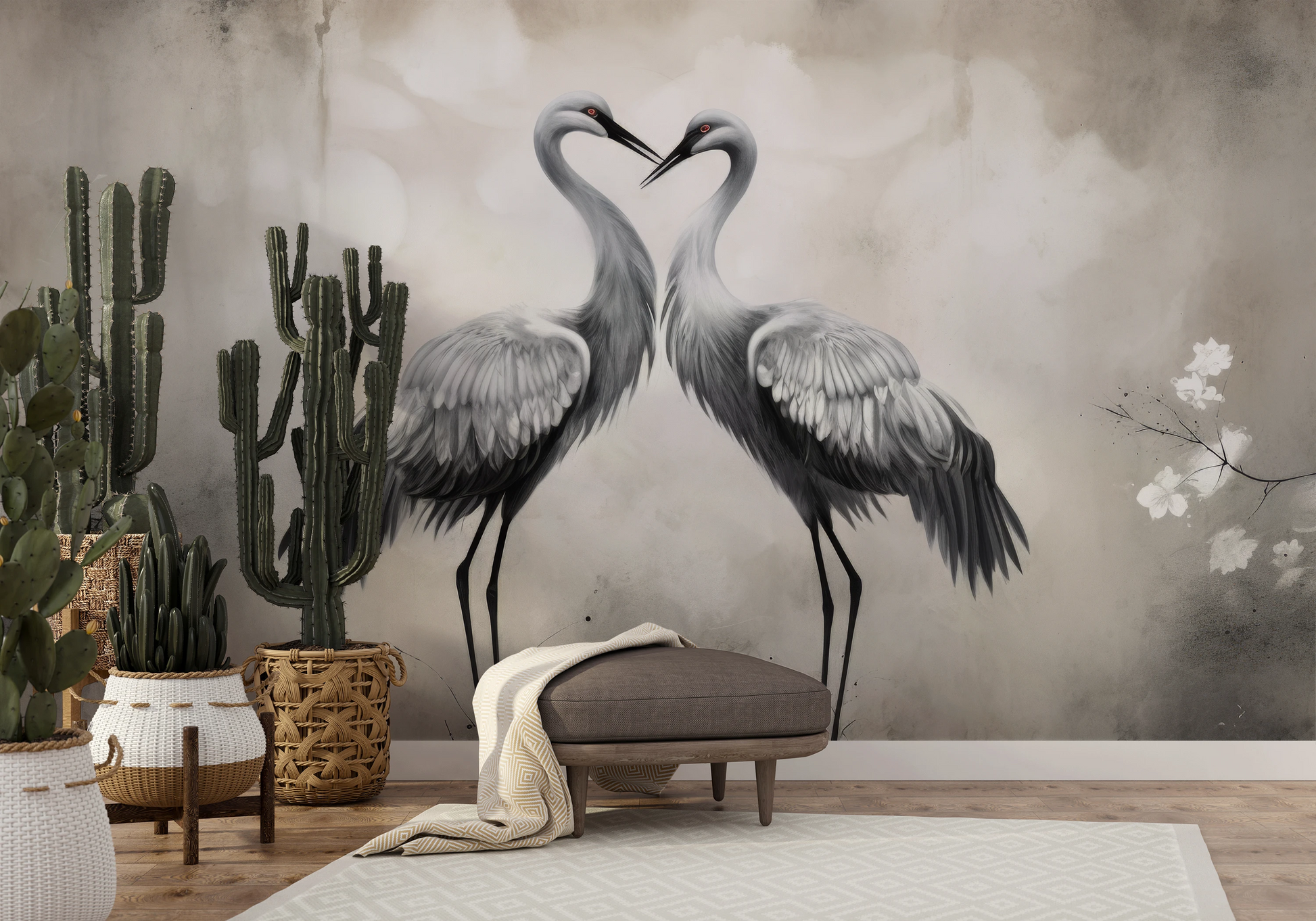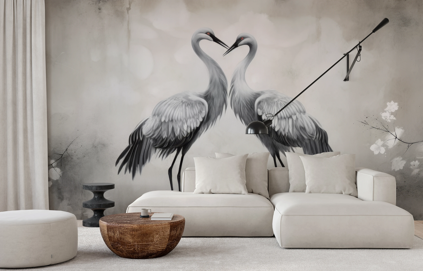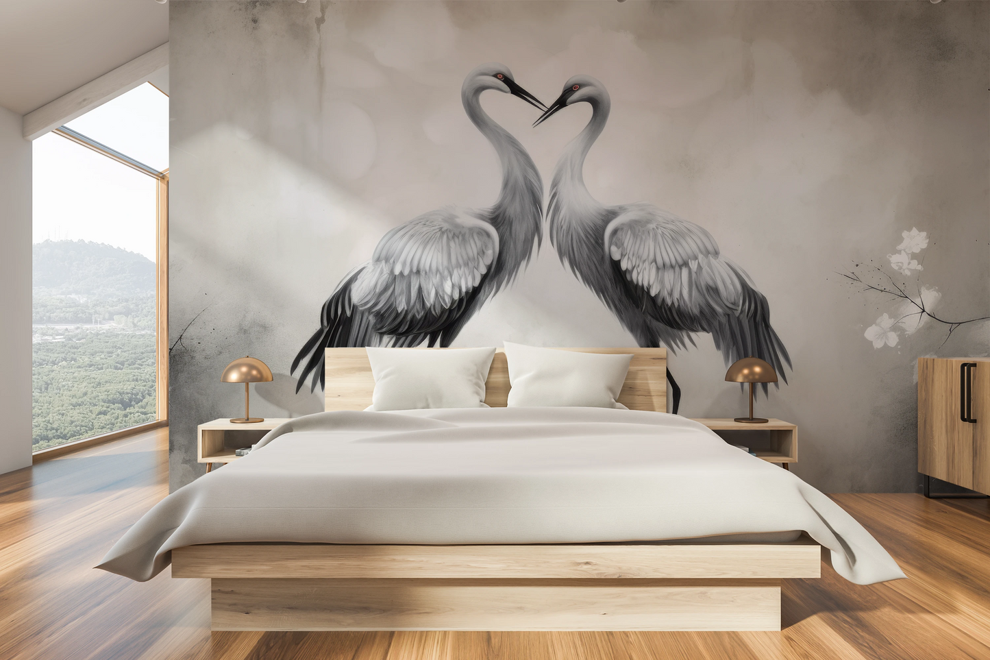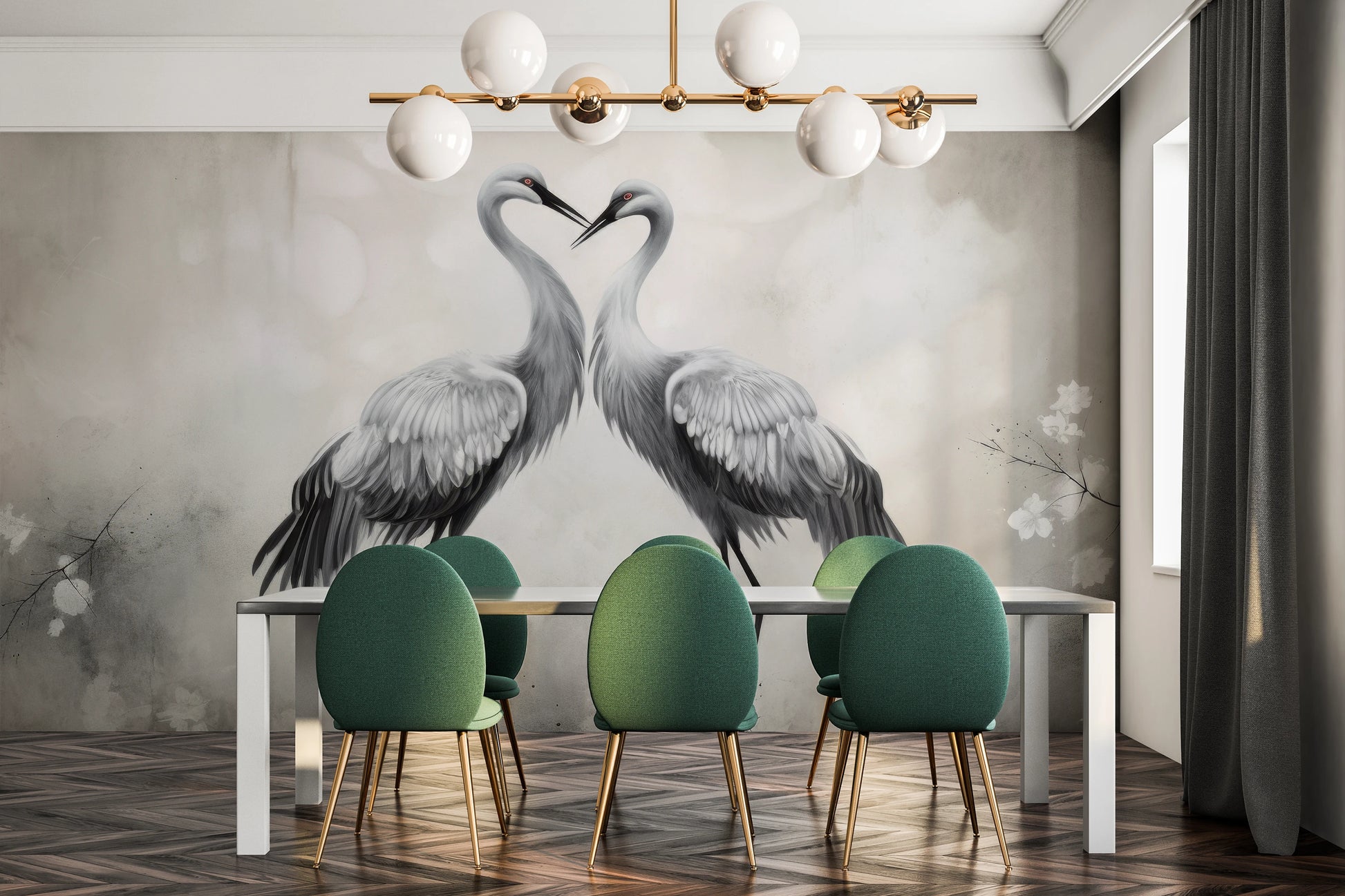 Delikatny Uścisk - Żurawie w delikatnym uścisku, otoczone lekką mgiełką i kwiatami, emanują atmosferę ciepła i spokoju. Tapeta ta wnosi do wnętrza uczucie harmonii.