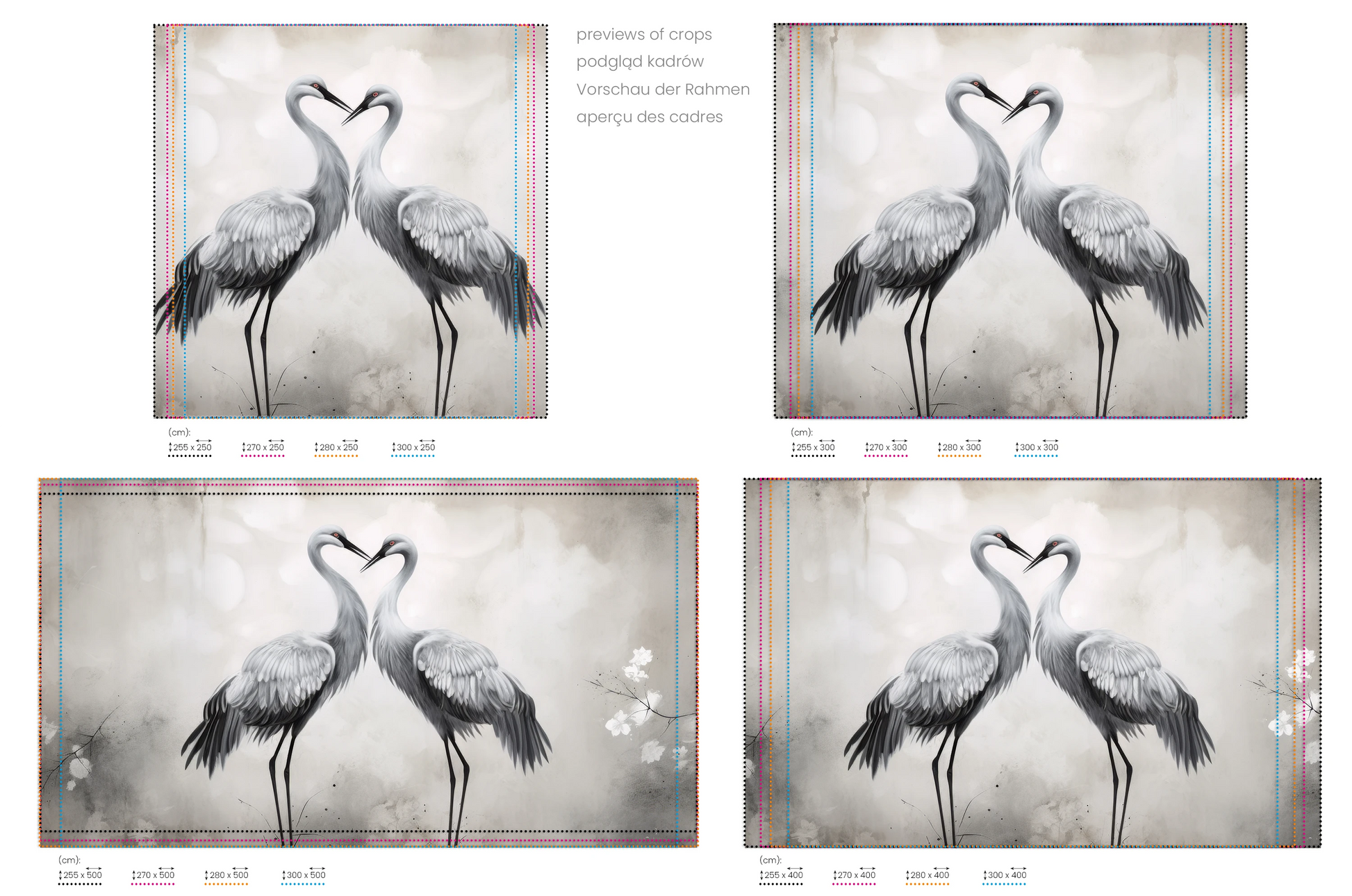 Kolekcja ta jest wizualnym hołdem dla majestatycznych żurawi, które są często uważane za symbol szczęścia i długowieczności w wielu kulturach, zwłaszcza w Azji. Prace artystyczne łączą w sobie subtelną elegancję i spokój, co czyni je idealnym wyborem dla wnętrz poszukujących odrobiny spokoju i harmonii. Obrazy przedstawiają żurawie w różnych pozach i ustawieniach, od pojedynczych, skupionych postaci po pary w delikatnym, prawie tanecznym ułożeniu.