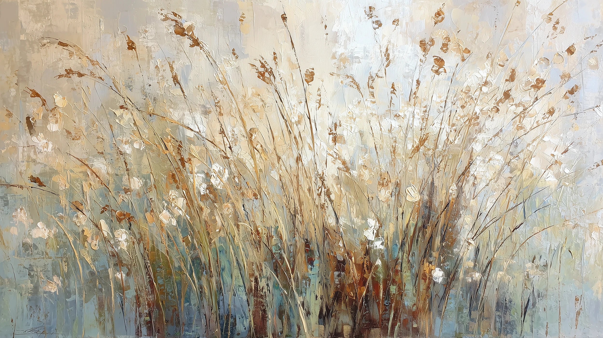 Paleta kolorów jest stonowana, z dominującymi szarościami, bielami i ciepłymi beżami, które są czasami przełamane delikatnymi akcentami rdzawych czerwieni lub delikatnych błękitów, dodającymi kompozycjom głębi i życia. Tło często jest abstrakcyjne, z elementami przypominającymi akwarelowe plamy lub rozmyte formy, które mogą przypominać zarówno tradycyjne wschodnie tusze, jak i współczesne techniki malarskie.