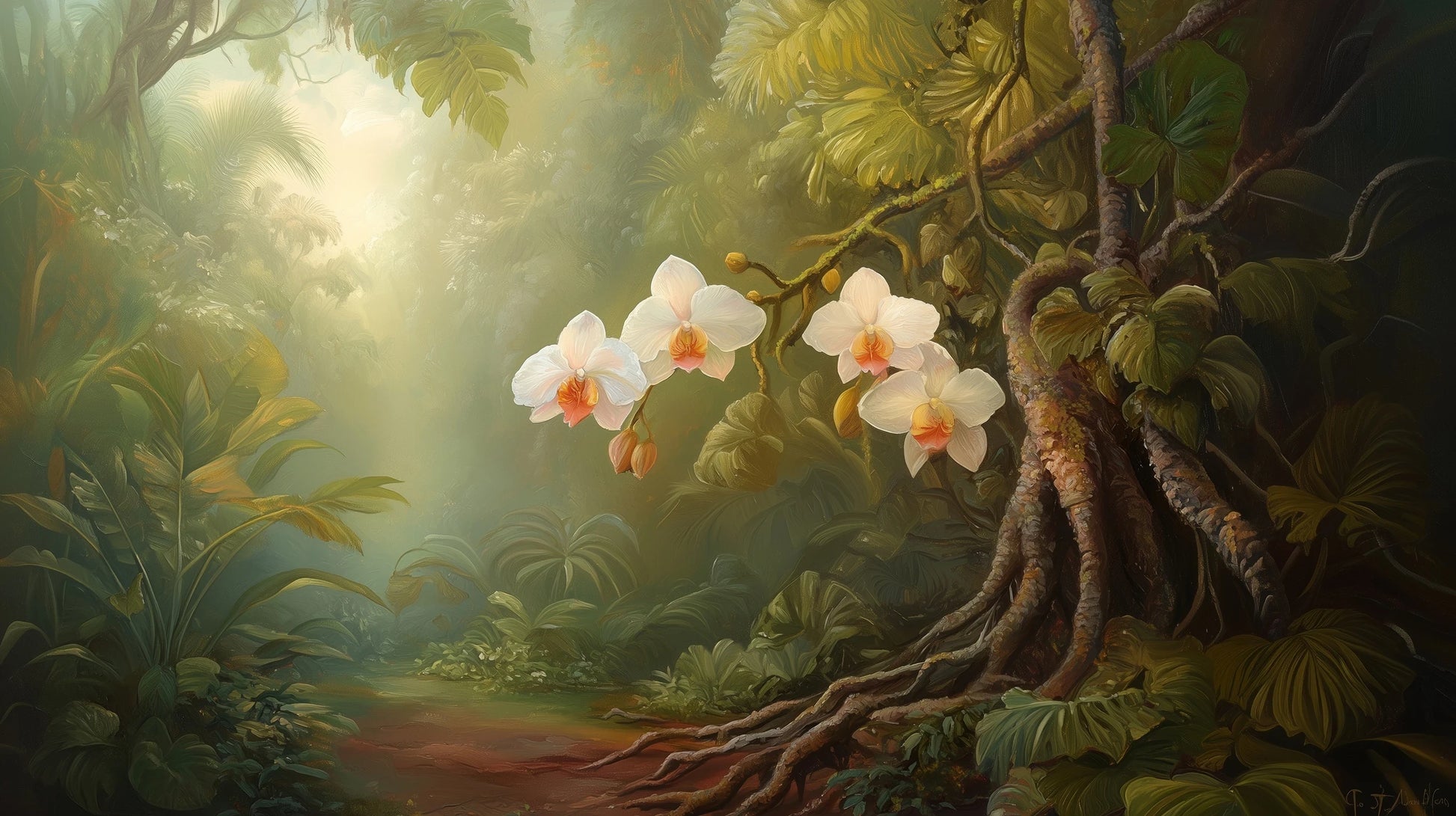 W tajemniczej zieleni tropikalnego lasu, gdzie promienie słońca przebijają się przez gęstą mgłę, rozkwitają delikatne orchidee o perłowobiałych płatkach. To magiczny moment, gdy natura objawia swoje najpiękniejsze oblicze, a świat zdaje się zatrzymywać w bezruchu, aby podziwiać ten niezwykły spektakl. Ta wysokiej jakości tapeta, która przenosi nas do baśniowego świata egzotycznej dżungli. Kompozycja została stworzona z artystyczną precyzją, gdzie każdy element opowiada własną historię. Centralne miejsce zajmują majestatyczne orchidee o subtelnych, kremowych płatkach z delikatnymi różowymi akcentami, które zdają się unosić w przestrzeni. Otaczają je bujne, soczyście zielone liście, tworzące naturalne obramowanie. Mistyczna mgła, przepuszczająca złociste promienie światła, dodaje całości niezwykłej głębi i tajemniczości. Ta tapeta przemieni przestrzeń w galerię sztuki, wprowadzając do wnętrza atmosferę spokoju. Świetnie sprawdzi się zarówno w sypialni, gdzie stworzy relaksującą atmosferę, jak i w eleganckim salonie czy gabinecie. Tutaj doda wnętrzu wyrafinowanego charakteru. Inwestując w to wyjątkową fototapetę, otrzymujesz portal do świata, gdzie natura spotyka się ze sztuką. Unikalna kompozycja, mistrzowska gra światłem i cieniem oraz subtelne przejścia tonalne sprawiają, że ta tapeta jest nie tylko elementem wystroju. Ale prawdziwym źródłem inspiracji i kontemplacji. To idealna propozycja dla osób poszukujących połączenia naturalnego piękna z artystyczną finezją.
