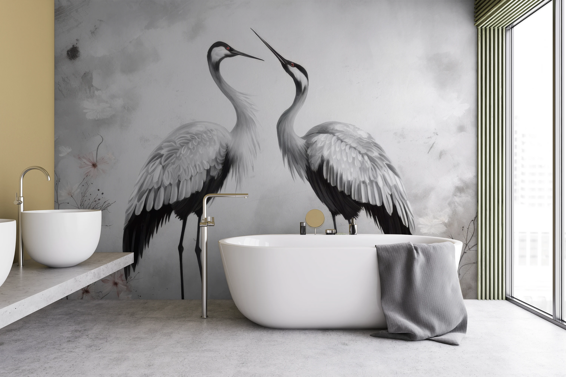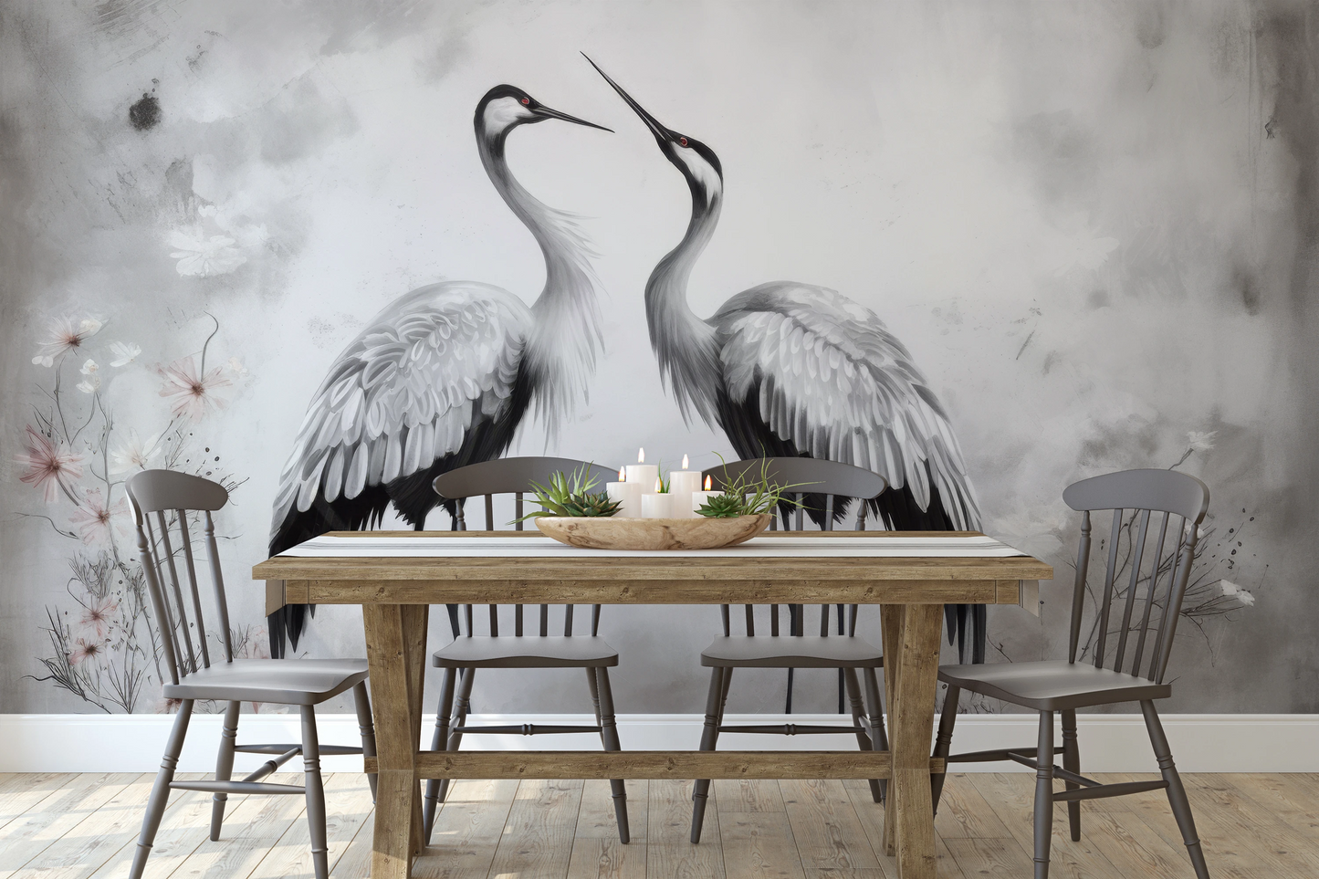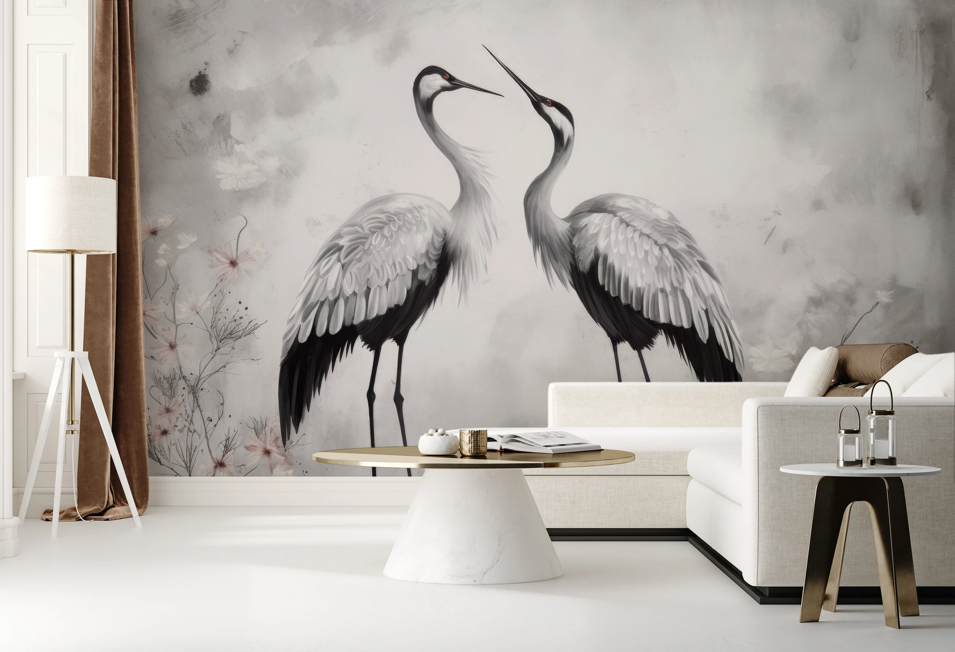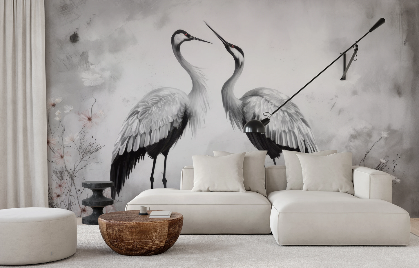 Mglista Rozkwita - Delikatny wzór prezentujący żurawie wśród mglistych konturów kwiatów, w tonacji szarości i bieli, co nadaje tapetę uczucie lekkości i świeżości.