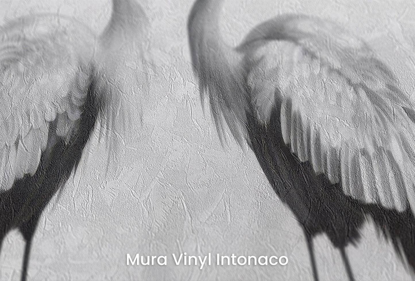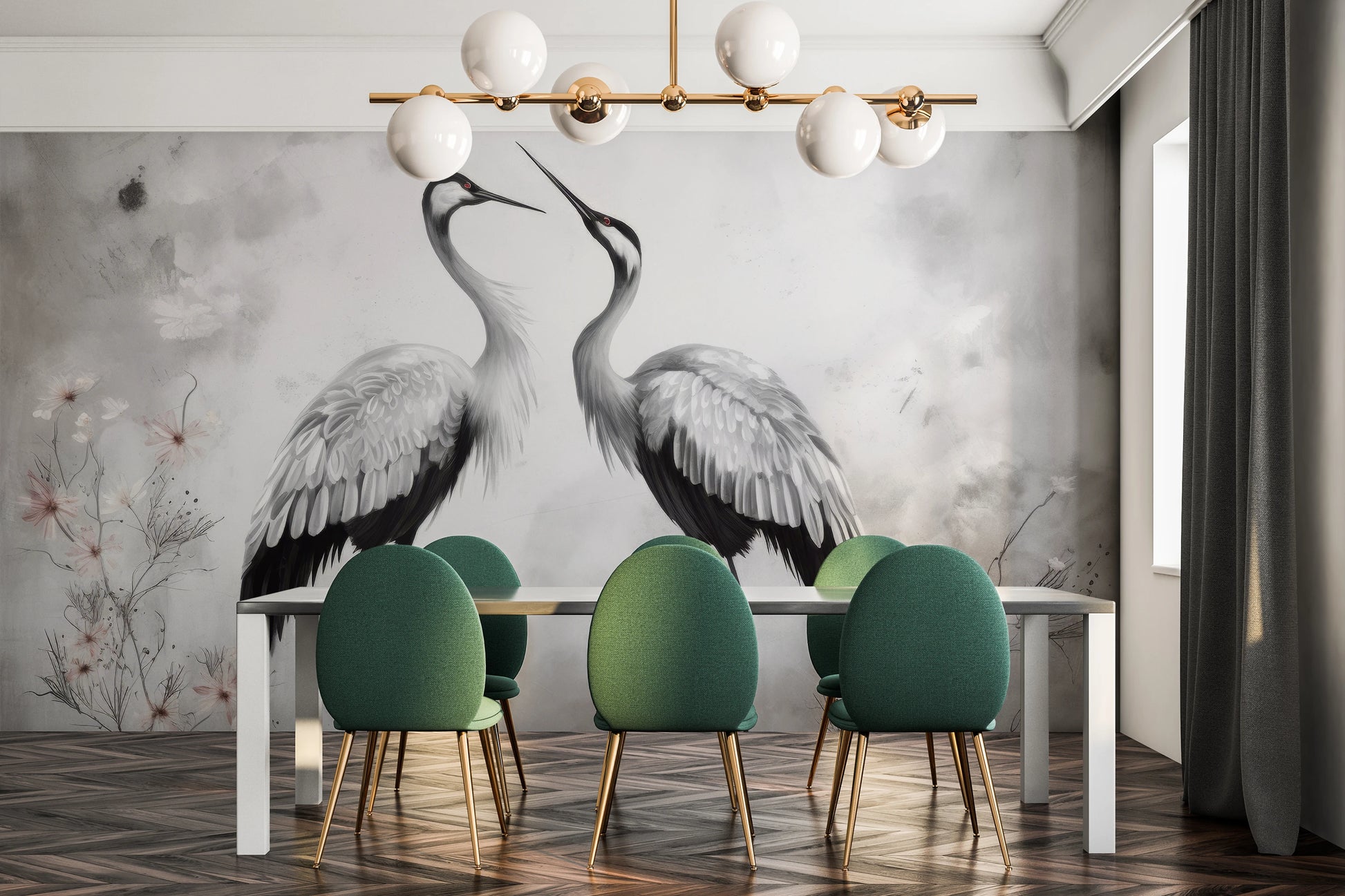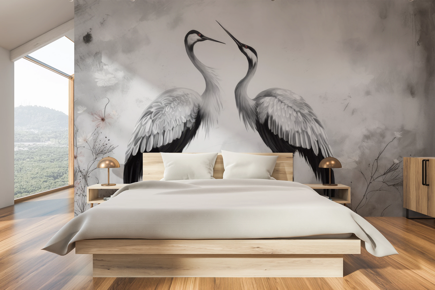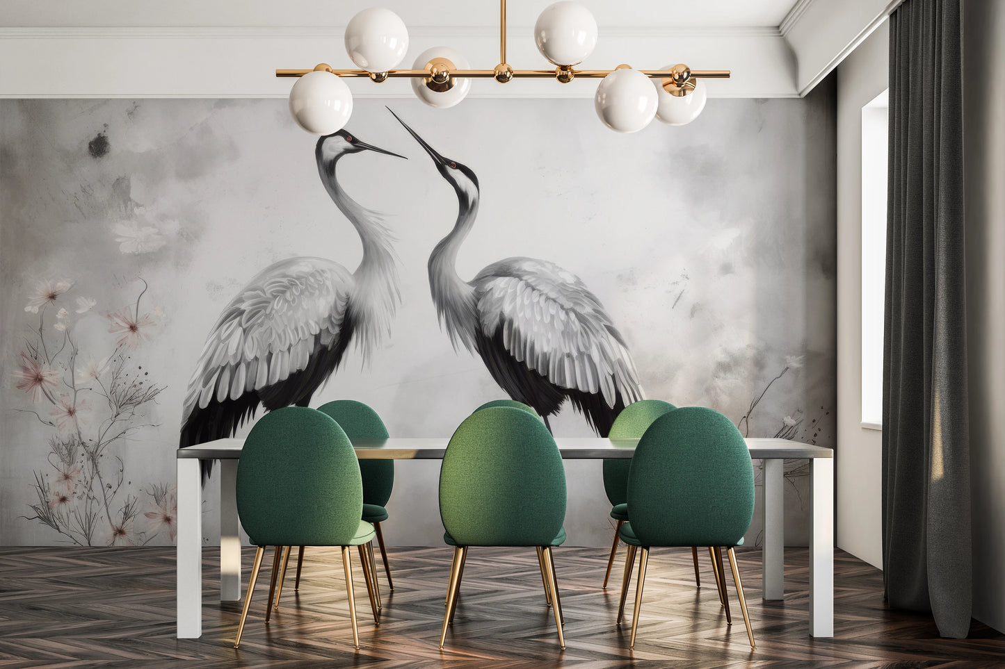 Mglista Rozkwita - Delikatny wzór prezentujący żurawie wśród mglistych konturów kwiatów, w tonacji szarości i bieli, co nadaje tapetę uczucie lekkości i świeżości.