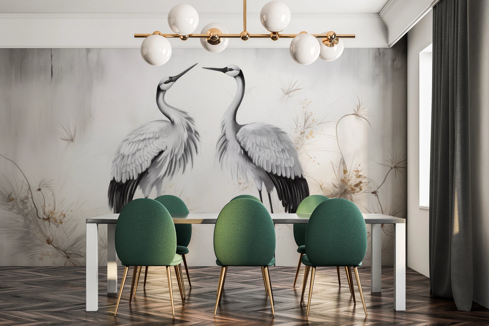 Balet w Blasku Księżyca - Dwa żurawie w pozycji tanecznej, z księżycem w tle, przypominają eleganckie figurki z baletu. Tapeta ta idealnie komponuje się w przestrzeniach nowoczesnych i artystycznych.