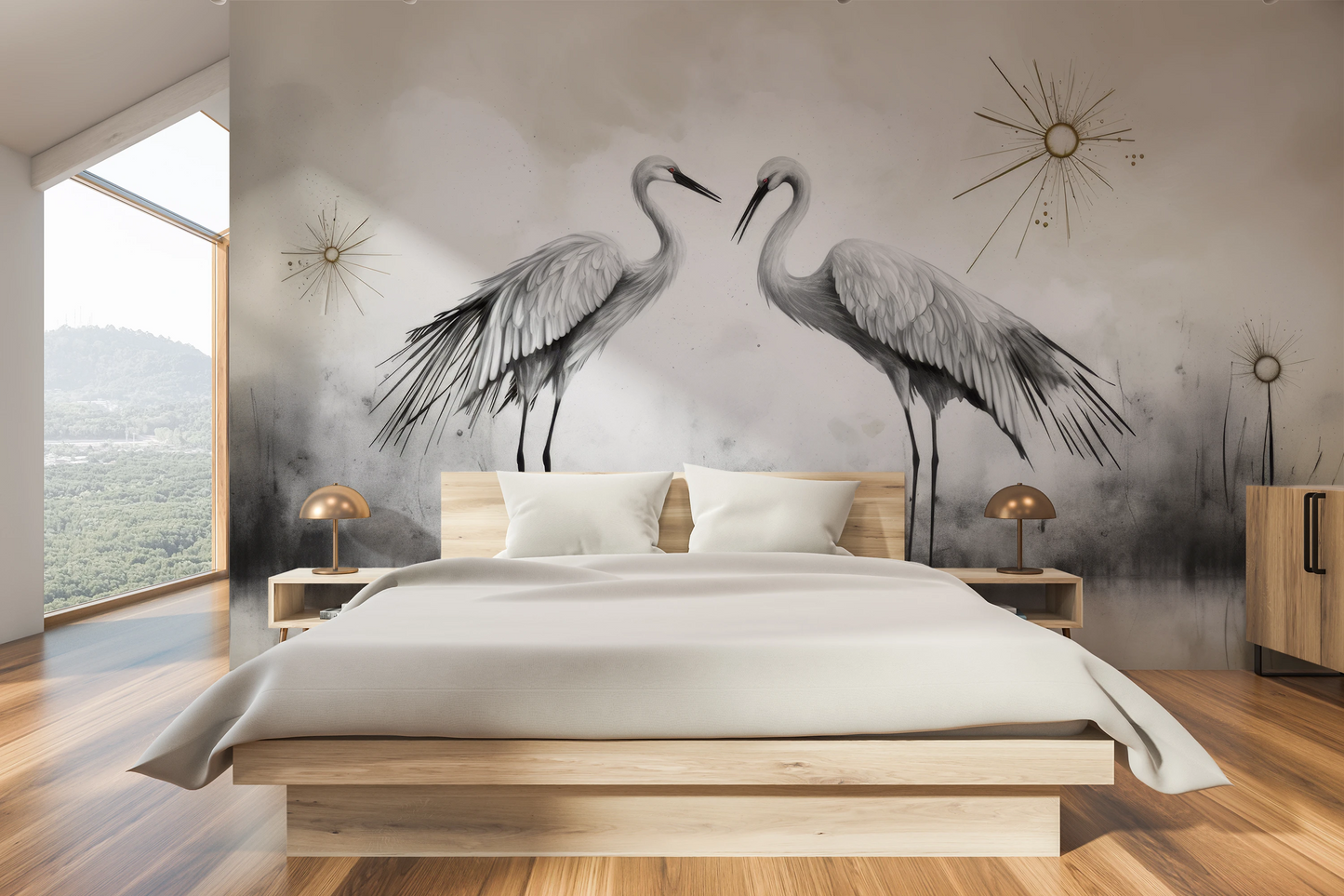 Gwiezdna Harmonia - Żurawie tańczące w świetle gwiazd, otoczone delikatnym krajobrazem i zarysami roślin, wyrażające równowagę i harmonię. Idealne dla wnętrz pełnych spokoju.