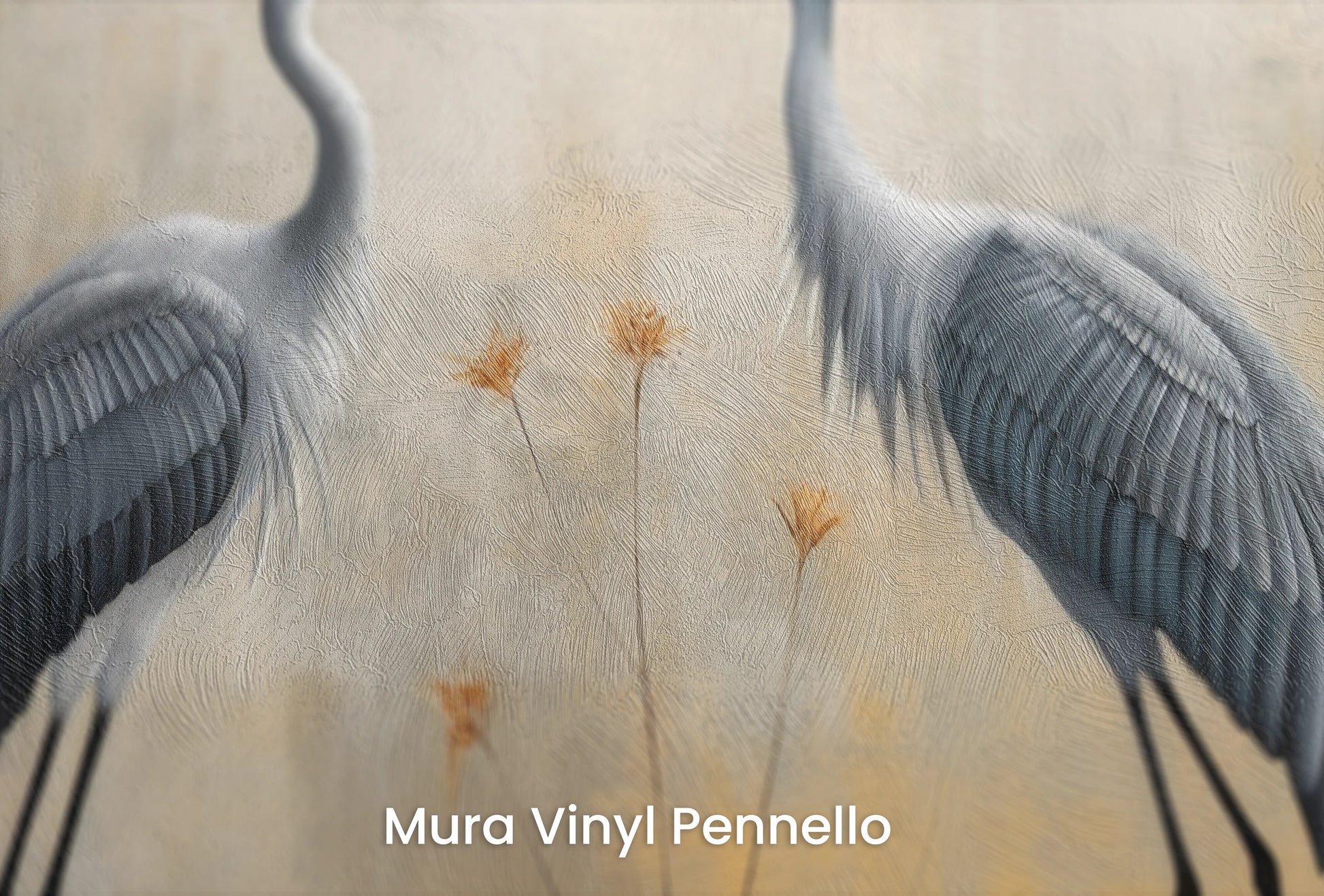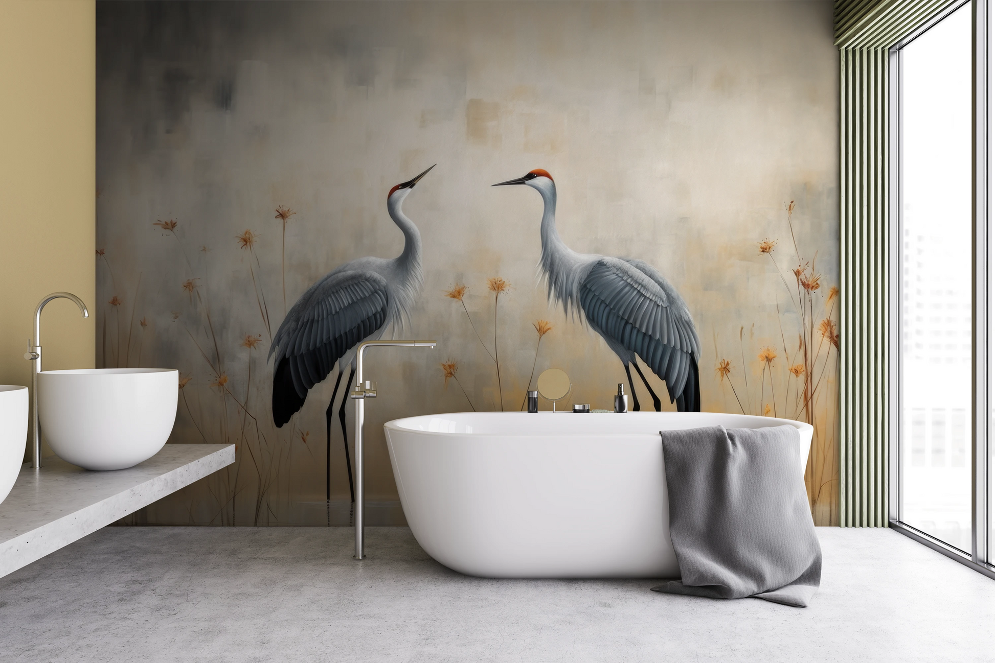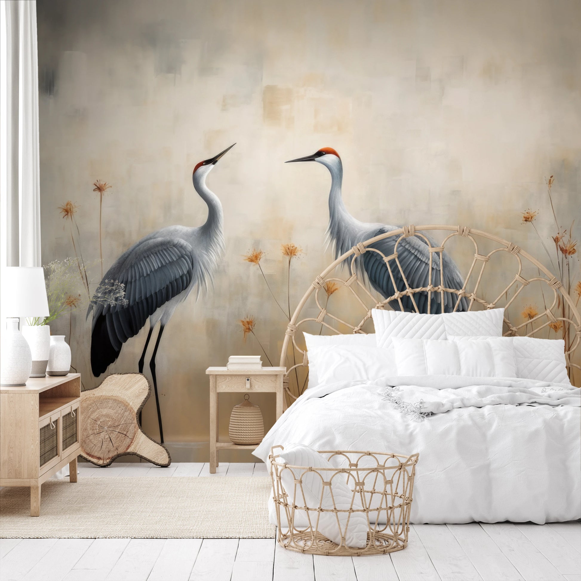 Spokojna Jedność - Żurawie w delikatnej pozie na tle spokojnych barw, symbolizujące jedność i równowagę, idealne dla wnętrz pragnących harmonii.