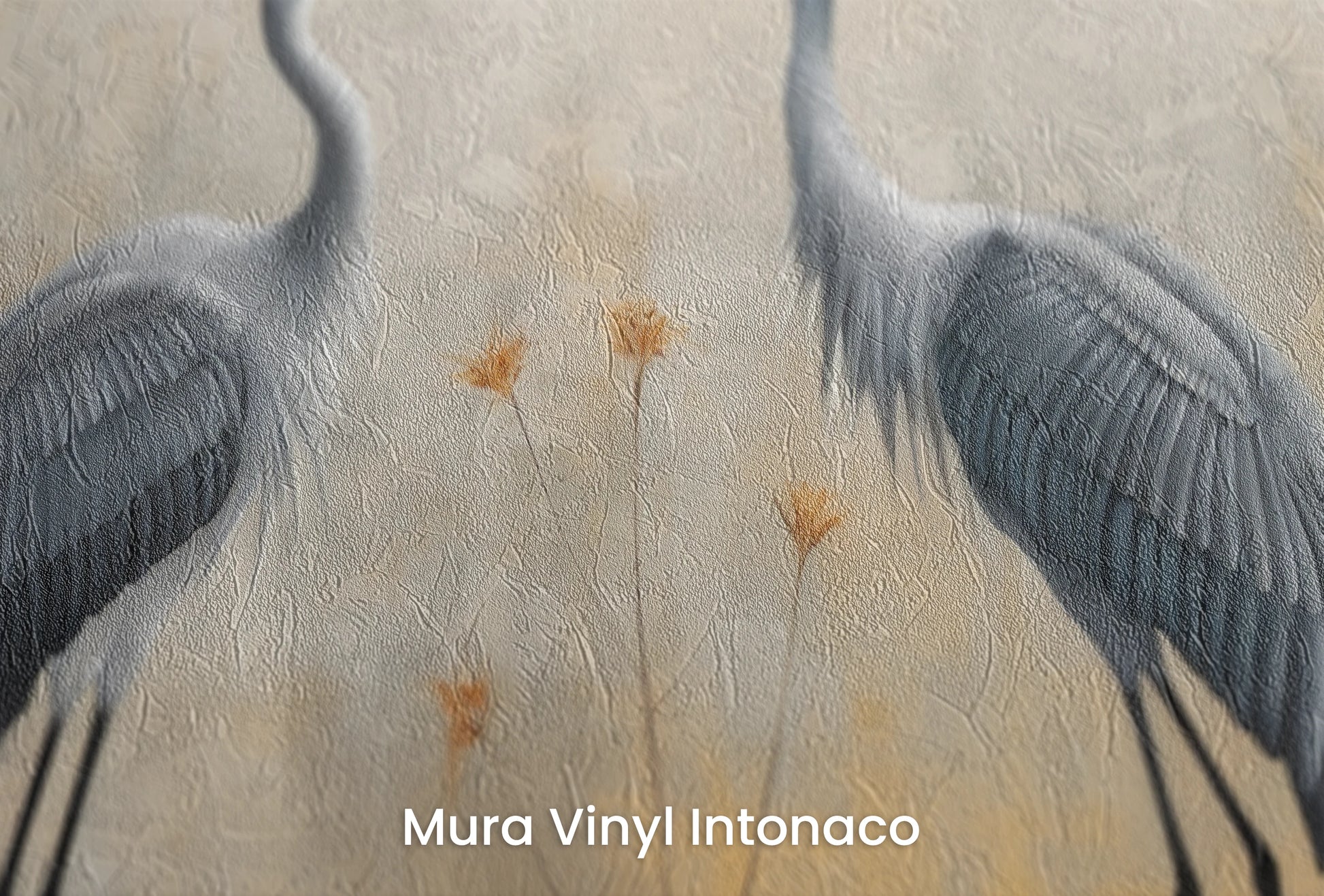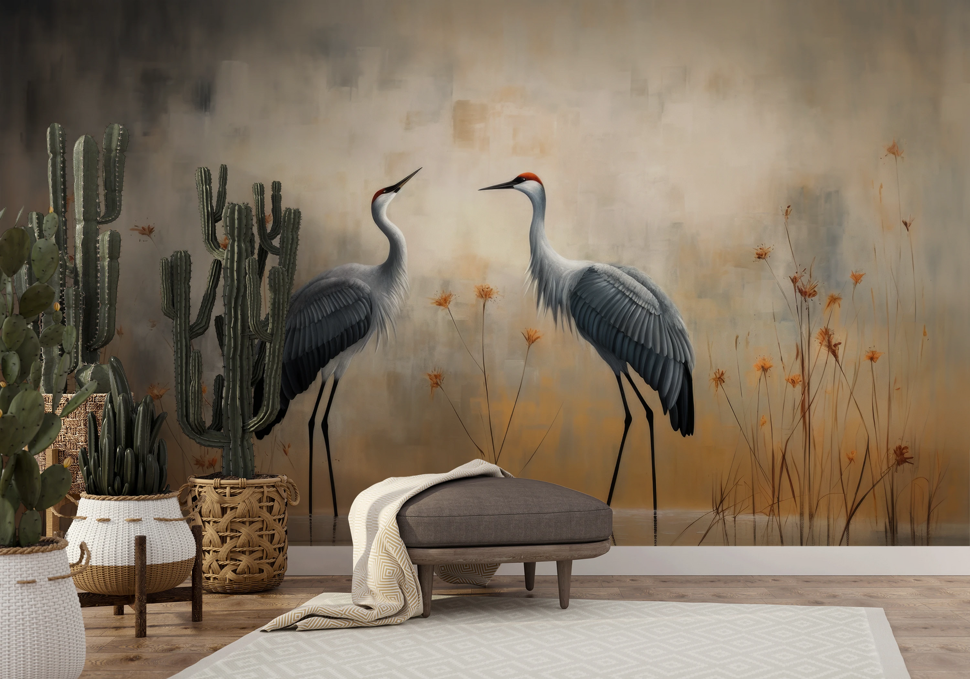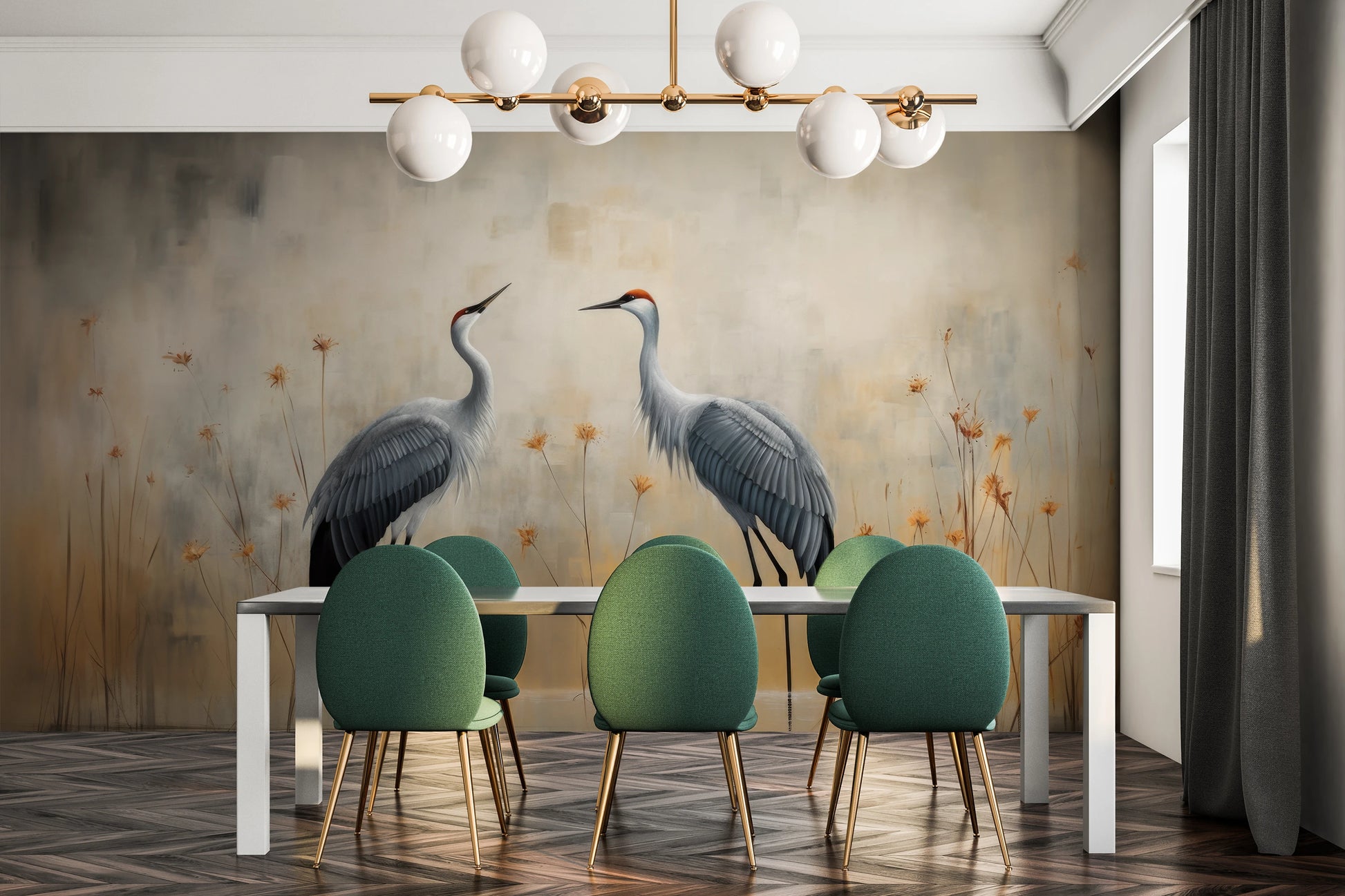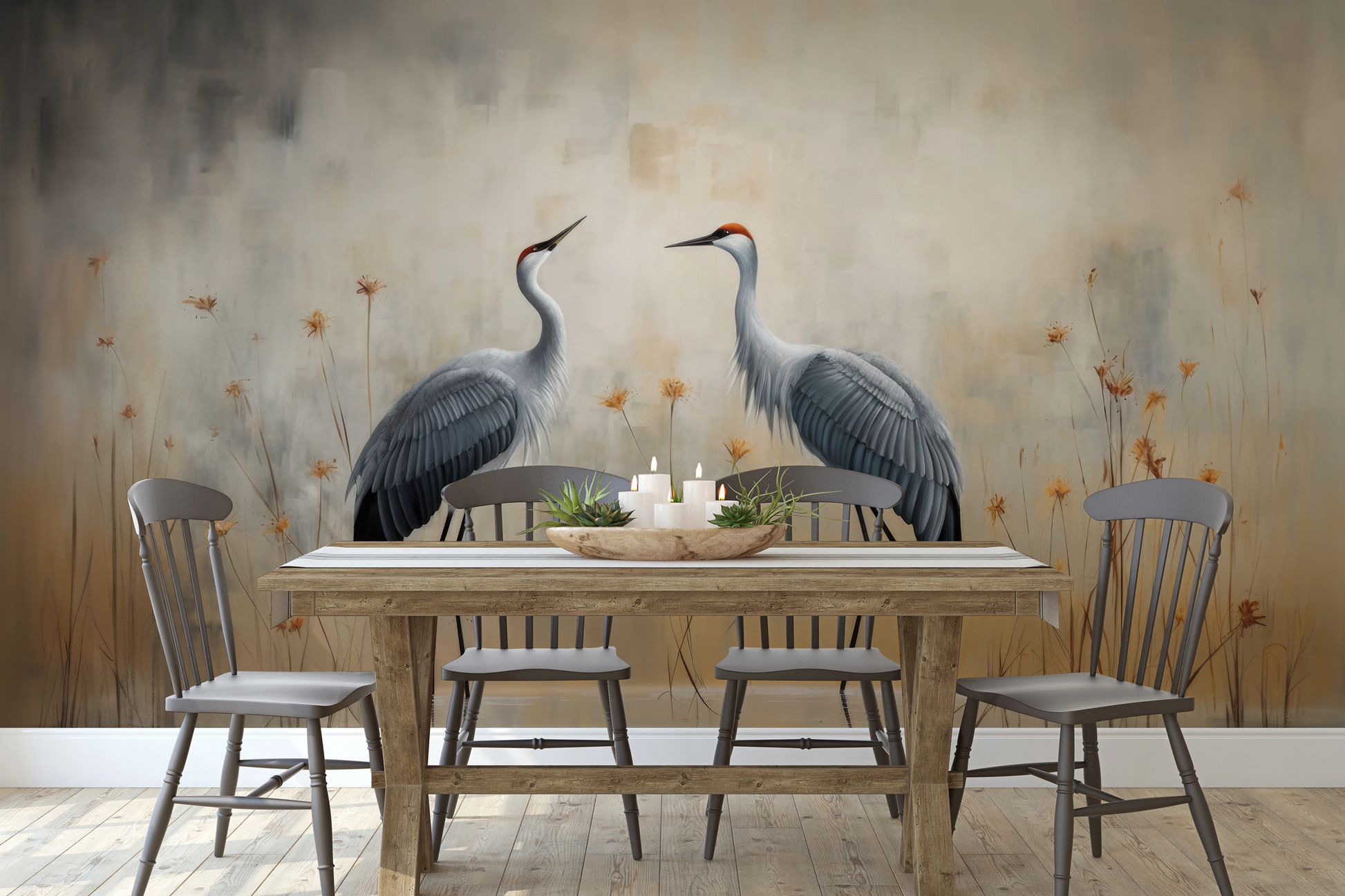 Spokojna Jedność - Żurawie w delikatnej pozie na tle spokojnych barw, symbolizujące jedność i równowagę, idealne dla wnętrz pragnących harmonii.