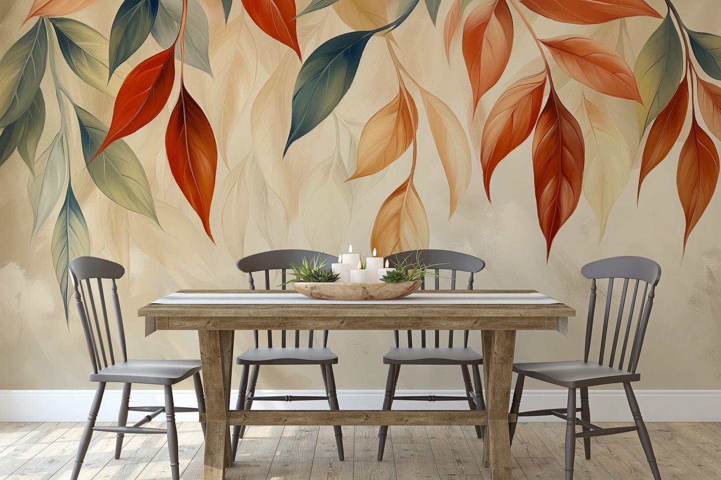 Fototapeta z liśćmi tańczącymi na wietrze, w palecie jesiennych barw, dodająca ruchu i lekkości każdej przestrzeni, szczególnie polecana do kawiarni lub przestrzeni publicznych.